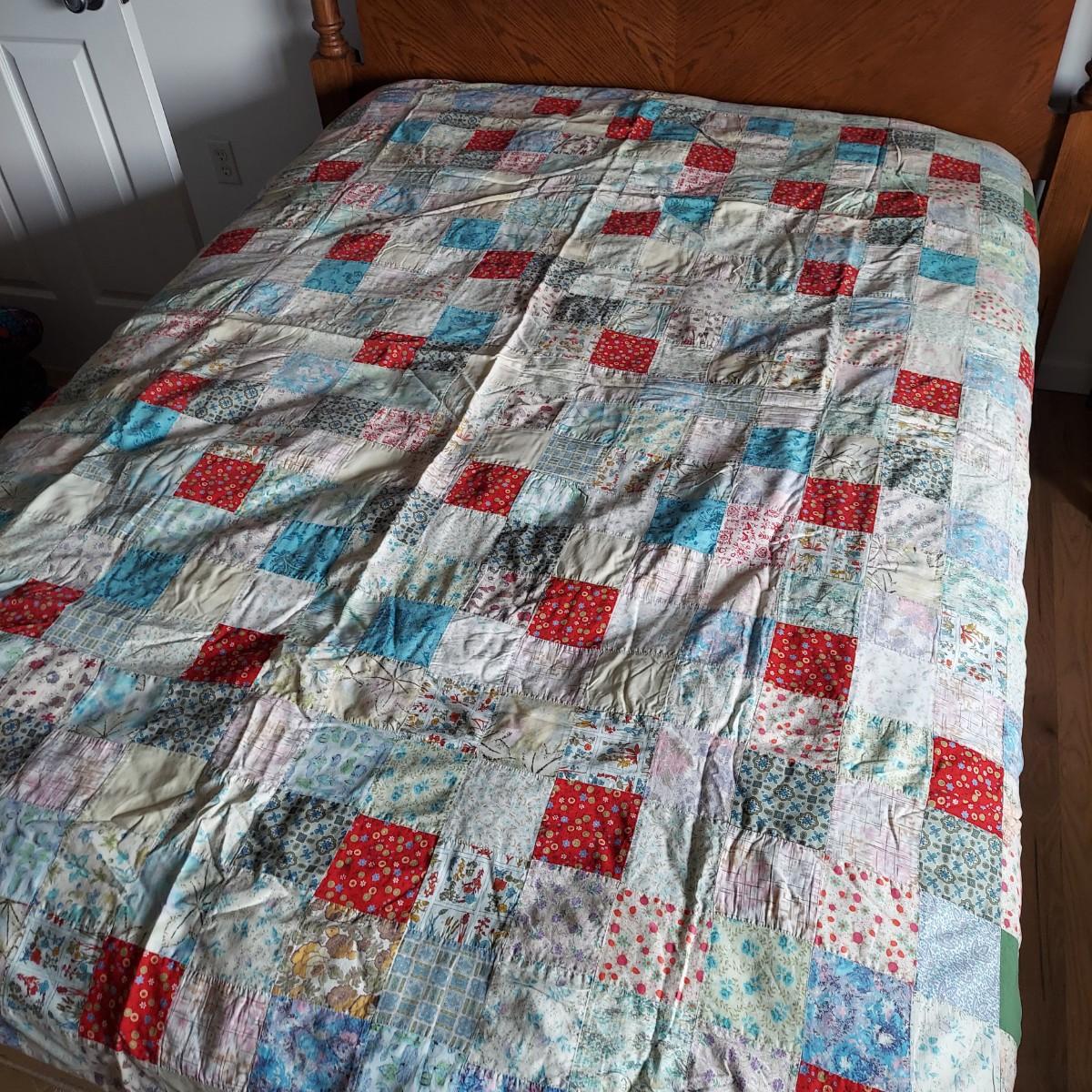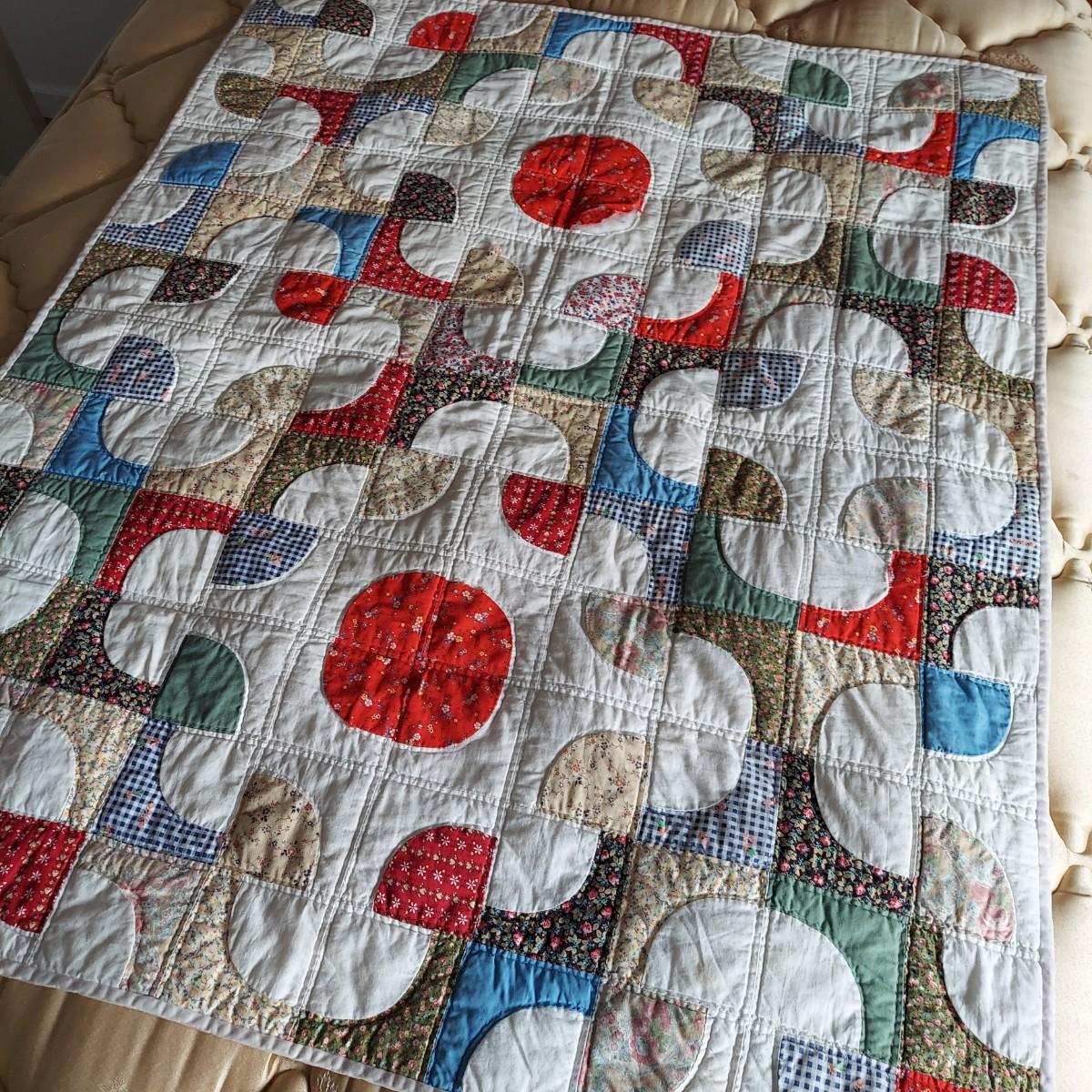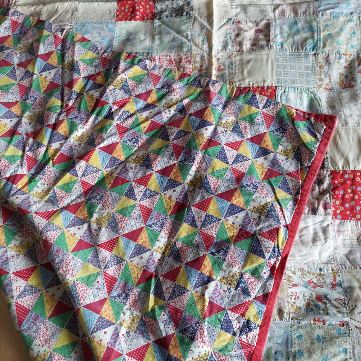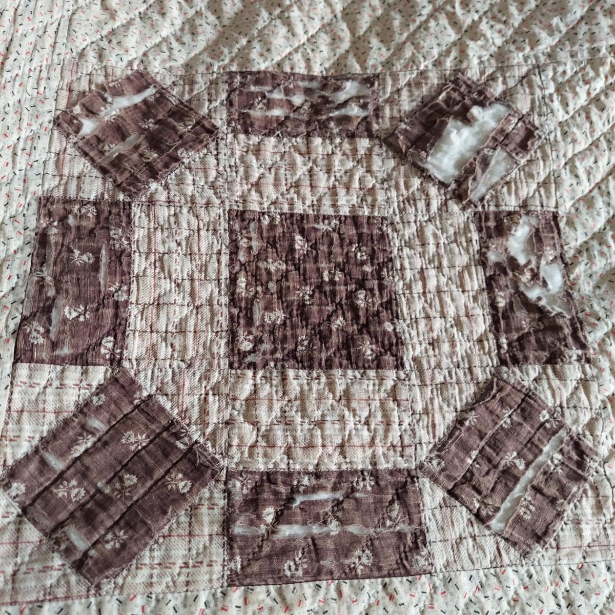 Lot includes eight vintage/antique quilts. Most appear to be hand sewn and hand quilted. Some have stains and tears due to age. The largest quilt with Chambray blue background and dresden plate style pattern measures approximately 104” x 88”H. Please see photos for details. Shipping available