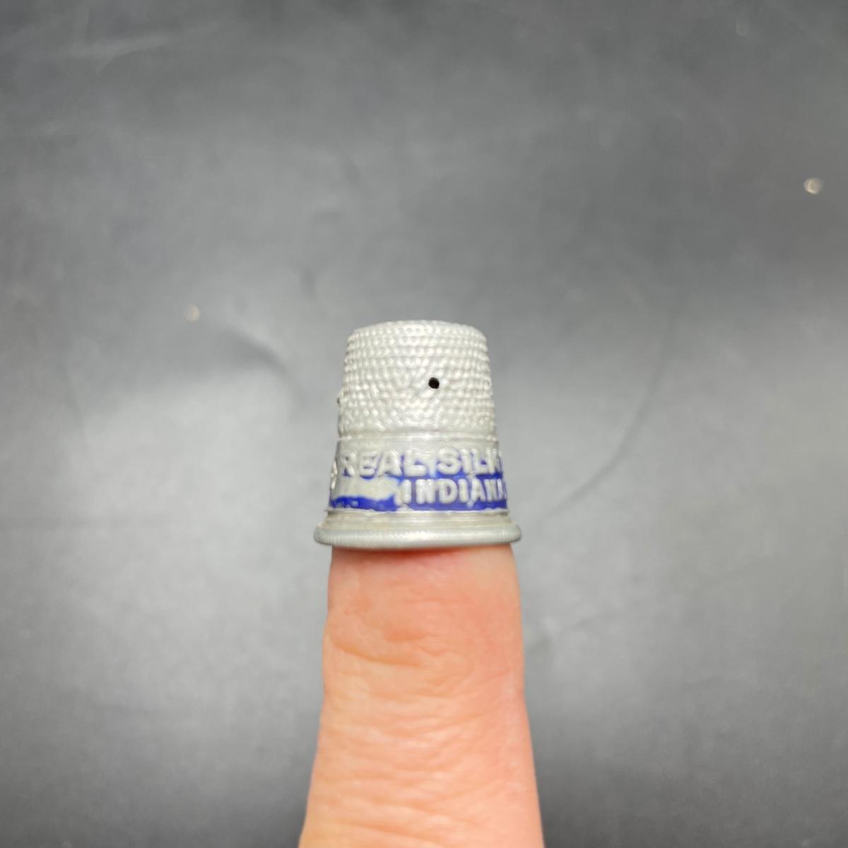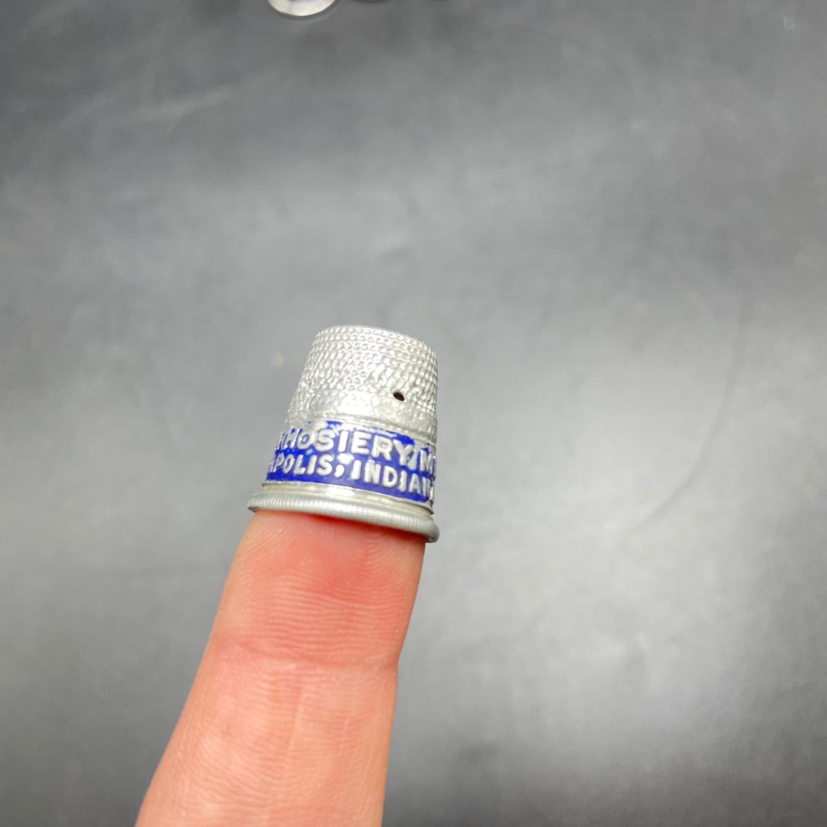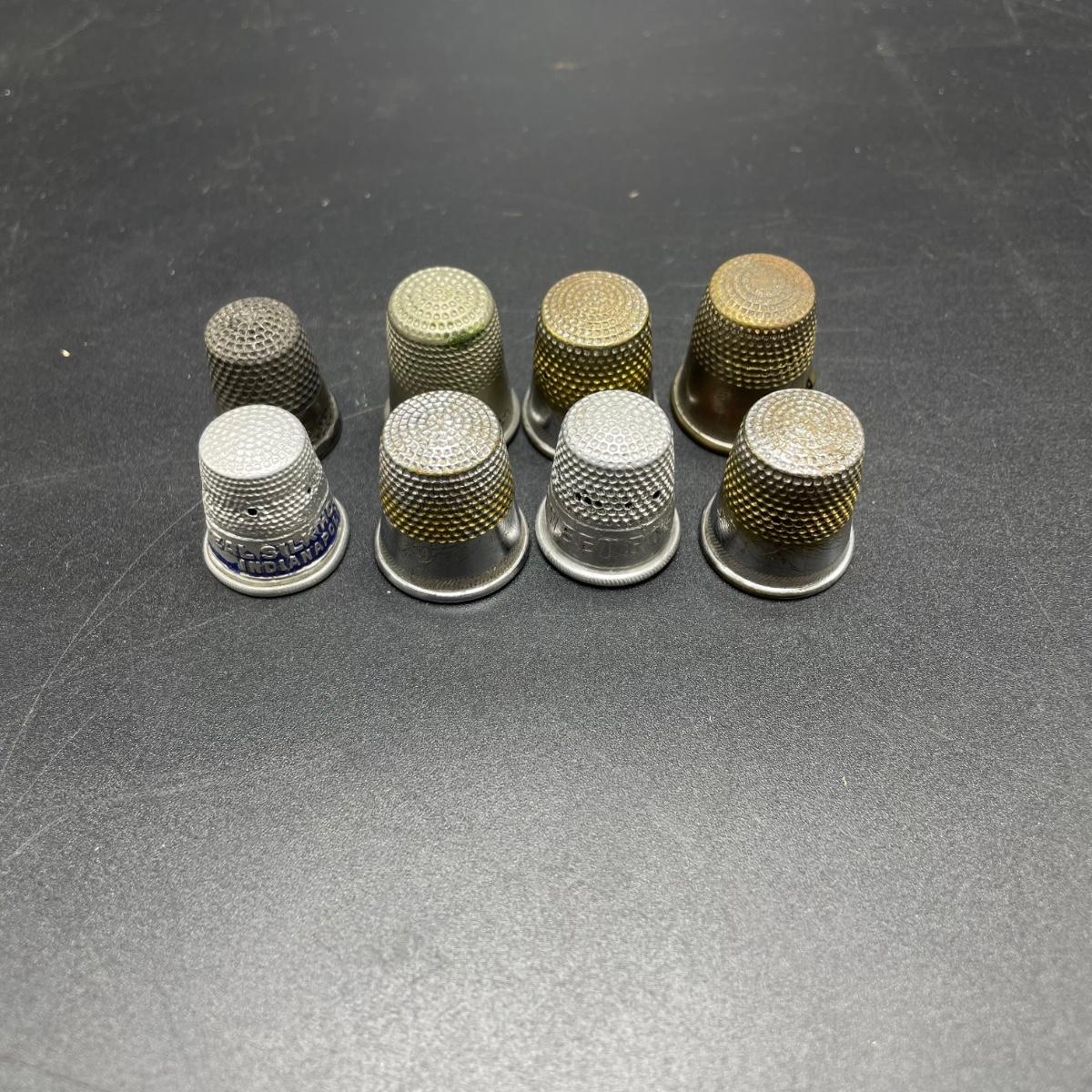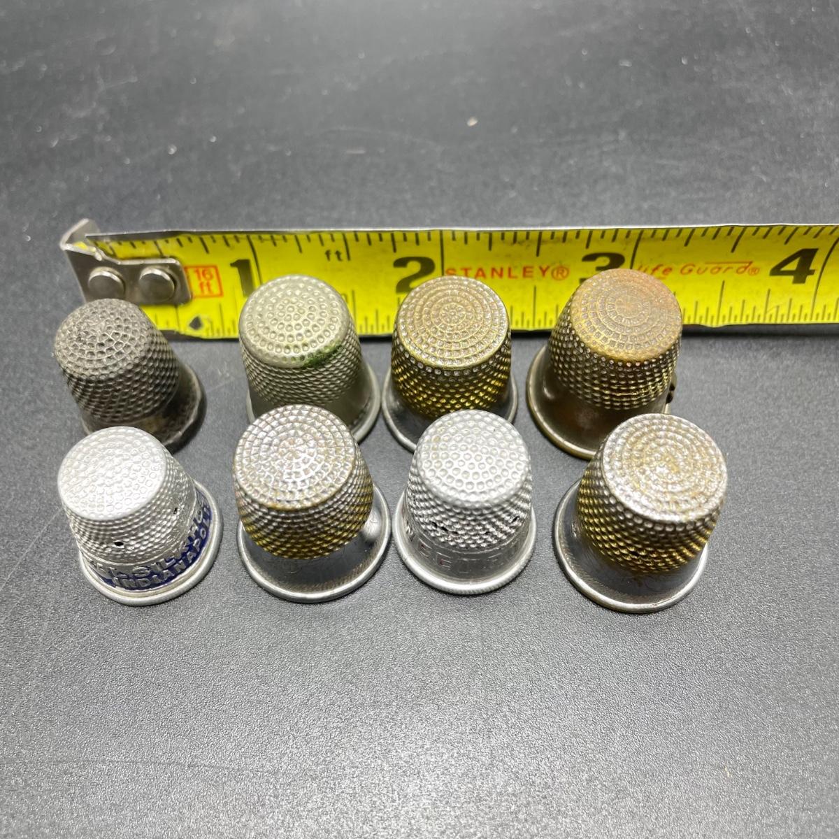 Eight vintage thimbles. Two have advertisements: Real Silk Hosiery Mills, Indianapolis, Indiana and Sweet Rose Flour. One smallest thimble is unmarked, and the last five are sized. One 10, three 11, and one 12. See images. Shipping available.