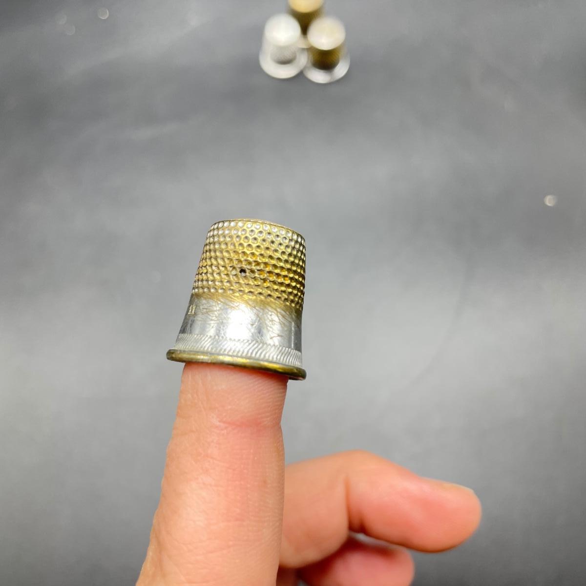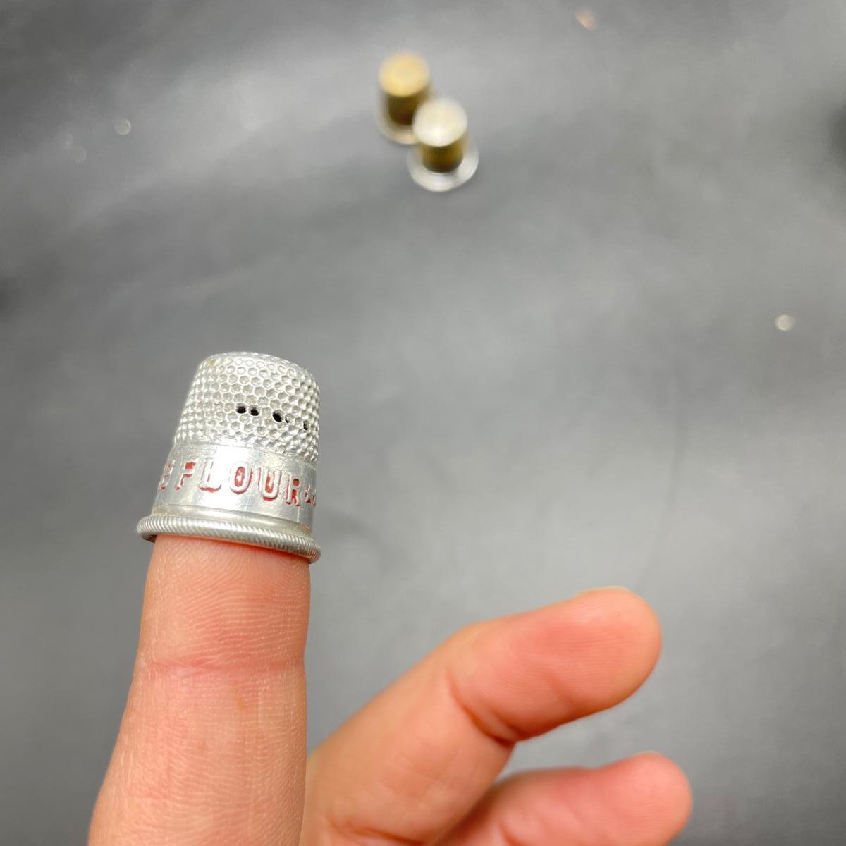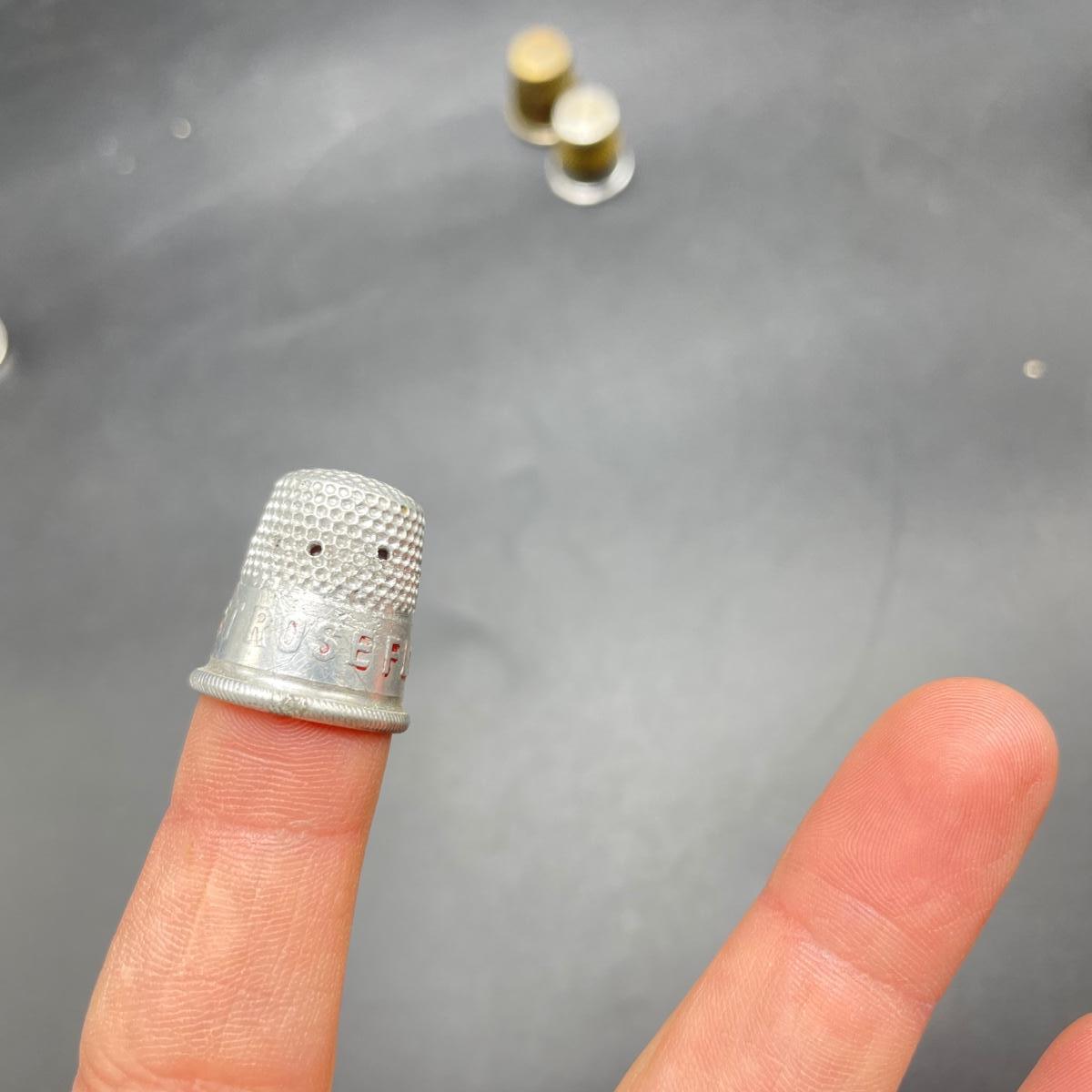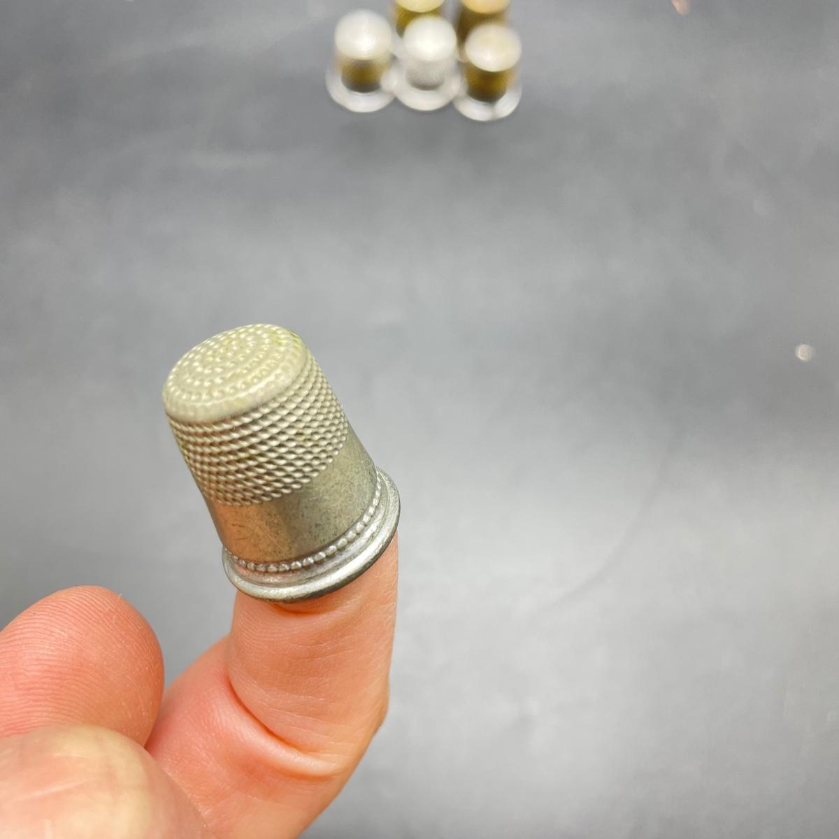 Eight vintage thimbles. Two have advertisements: Real Silk Hosiery Mills, Indianapolis, Indiana and Sweet Rose Flour. One smallest thimble is unmarked, and the last five are sized. One 10, three 11, and one 12. See images. Shipping available.