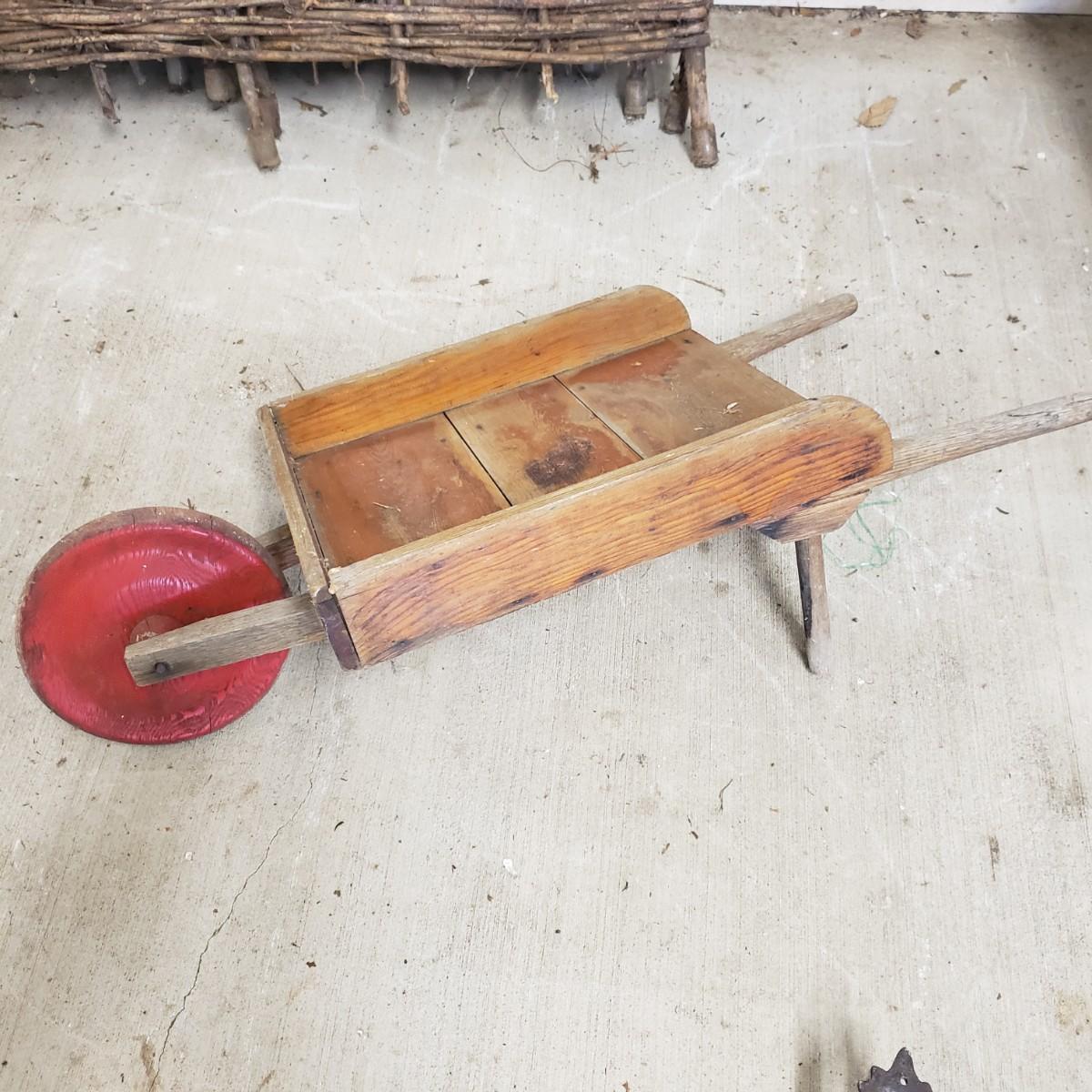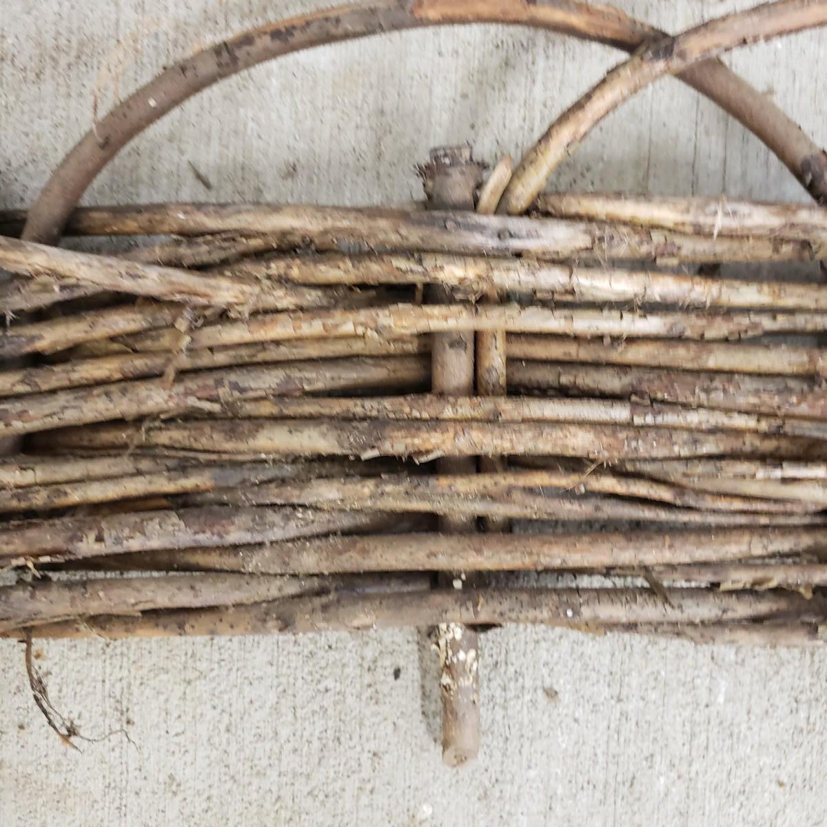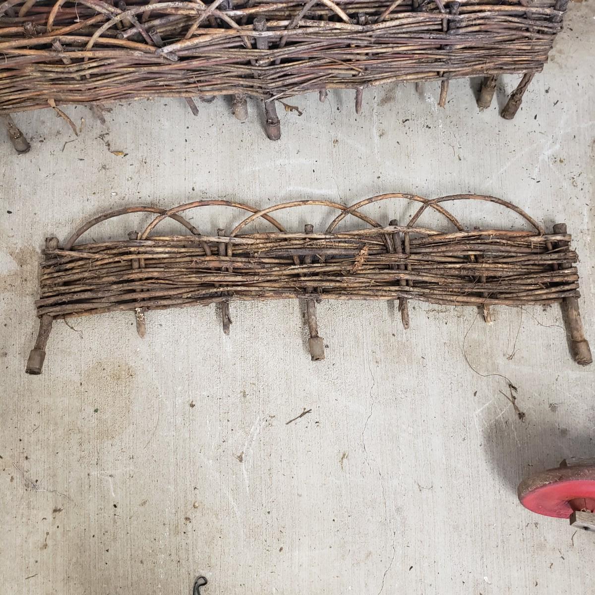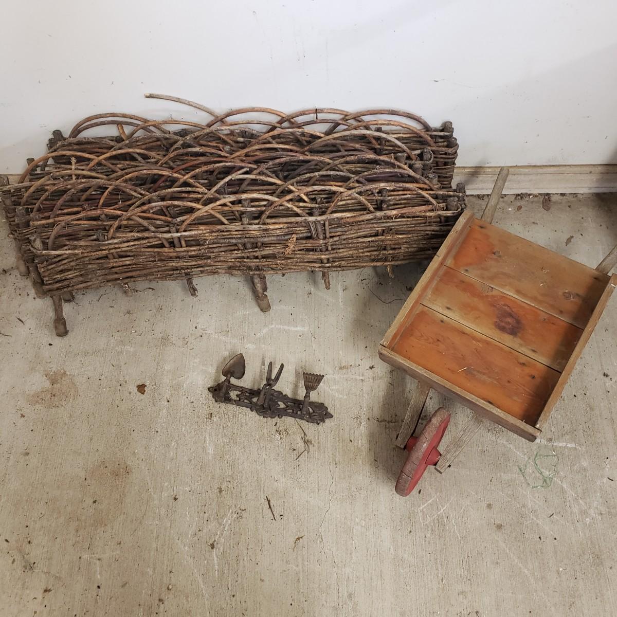 This useful and decorative garden art contains a cast iron three hook rack measuring 7" x 3". The vintage wood wheelbarrow would look great in a flower arrangement. The eight willow edgers have been well loved. Each piece has three rubber covered knobs, see pictures. Each edging measures 39" x 13".