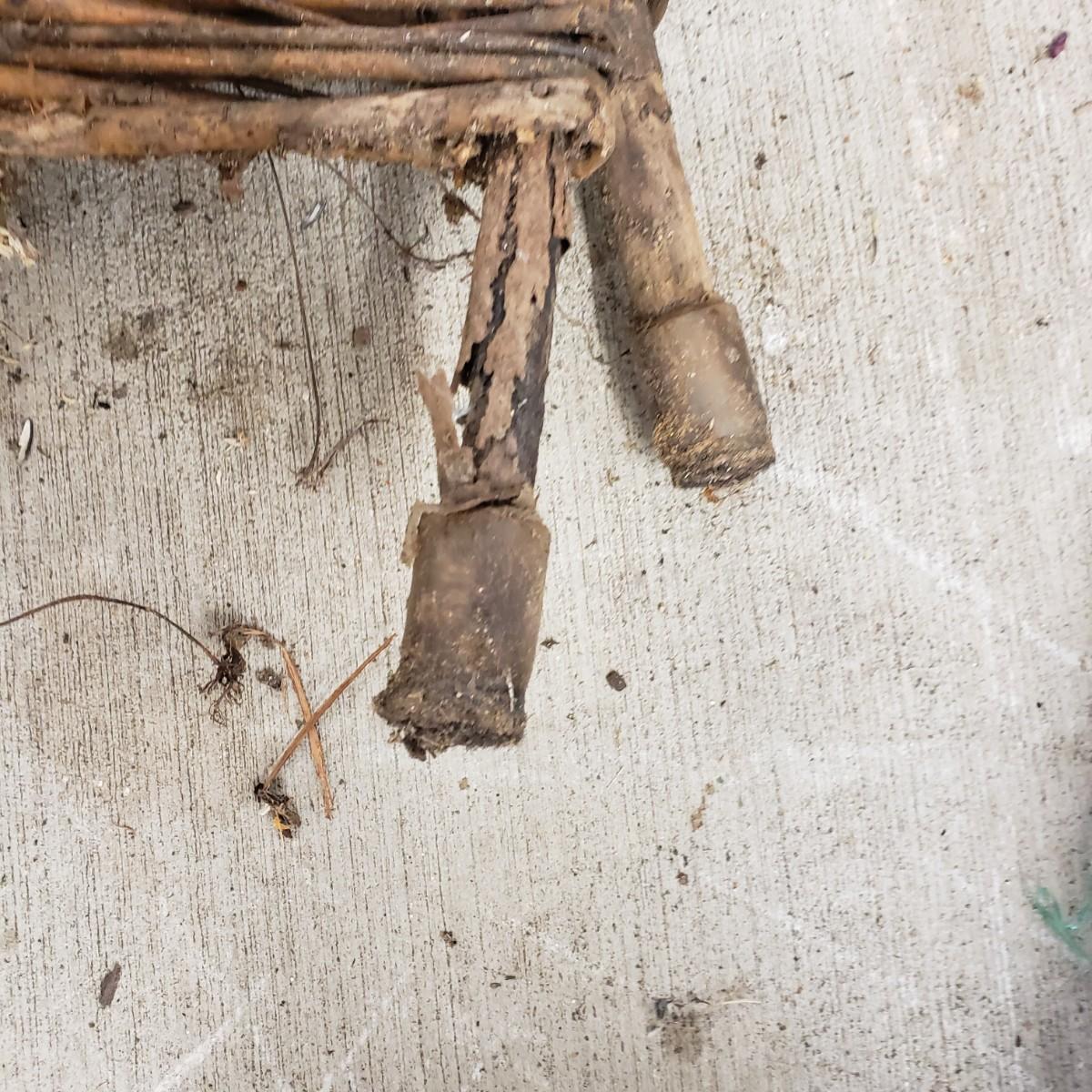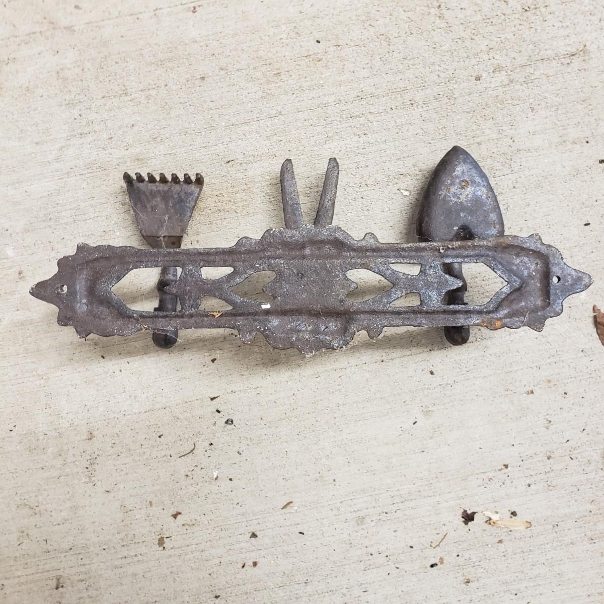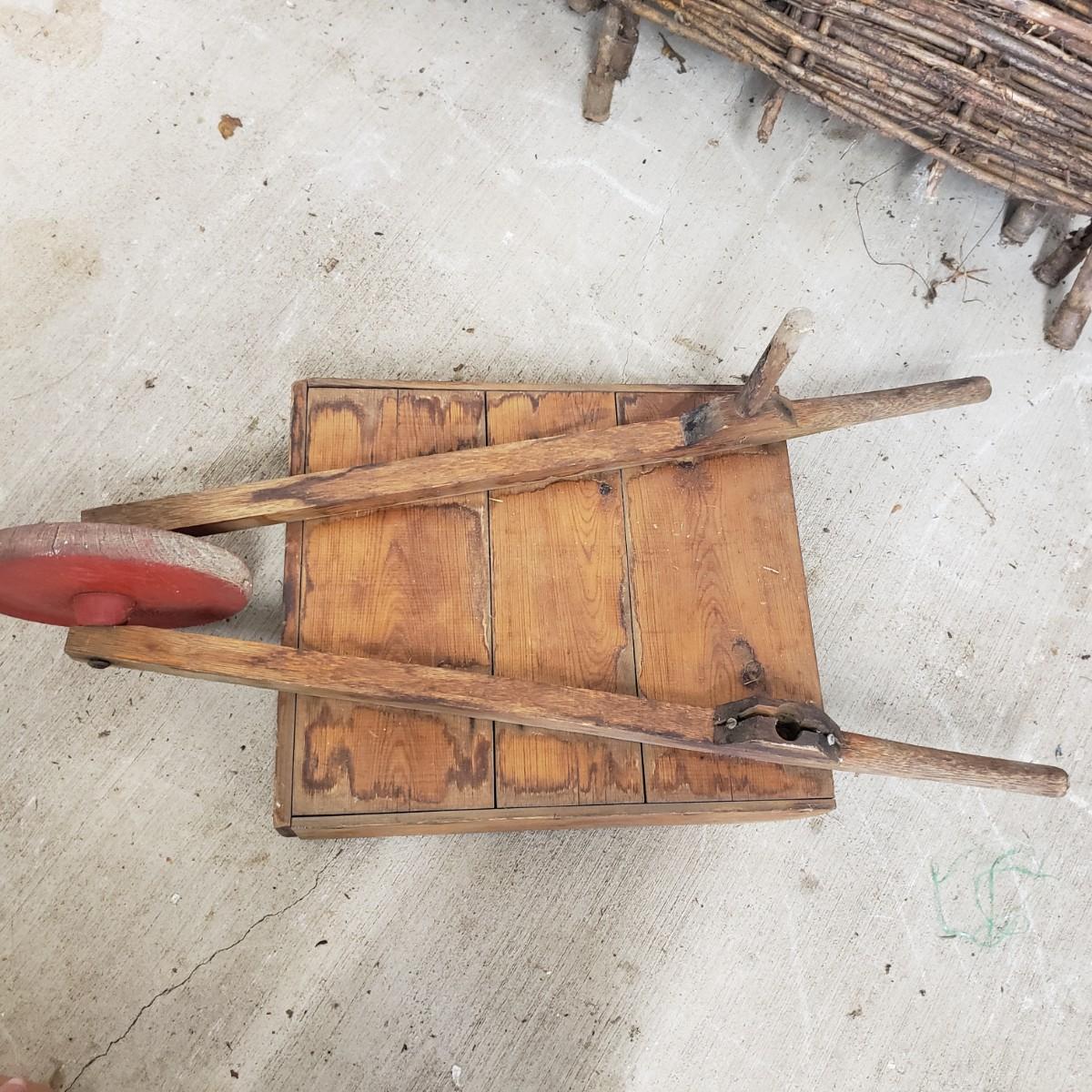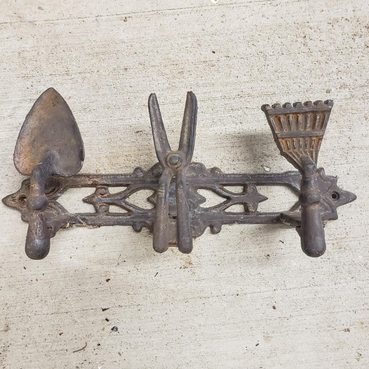 This useful and decorative garden art contains a cast iron three hook rack measuring 7" x 3". The vintage wood wheelbarrow would look great in a flower arrangement. The eight willow edgers have been well loved. Each piece has three rubber covered knobs, see pictures. Each edging measures 39" x 13".