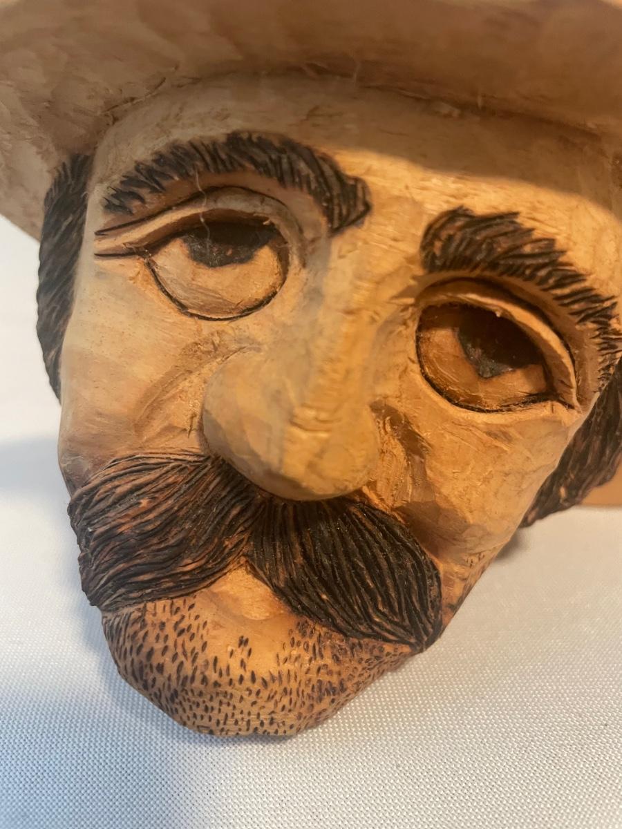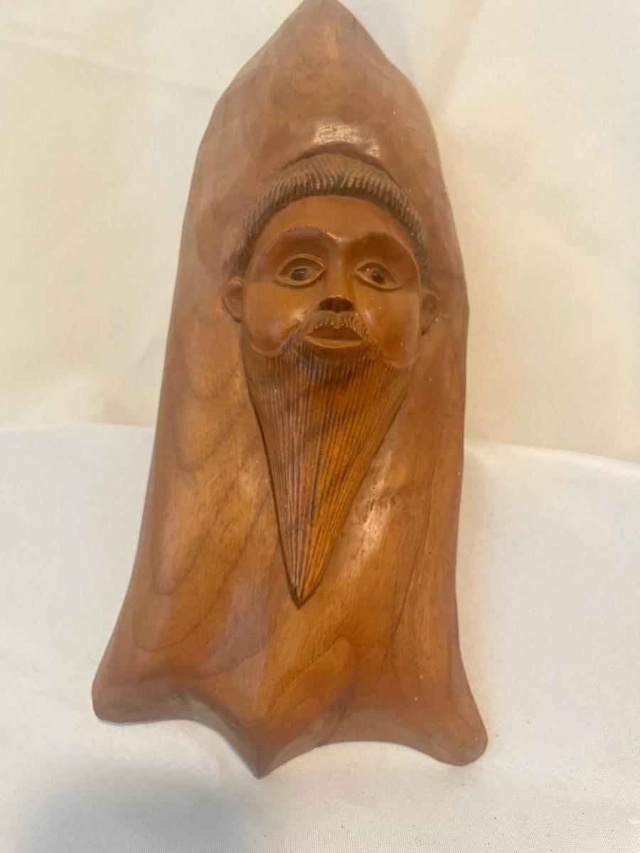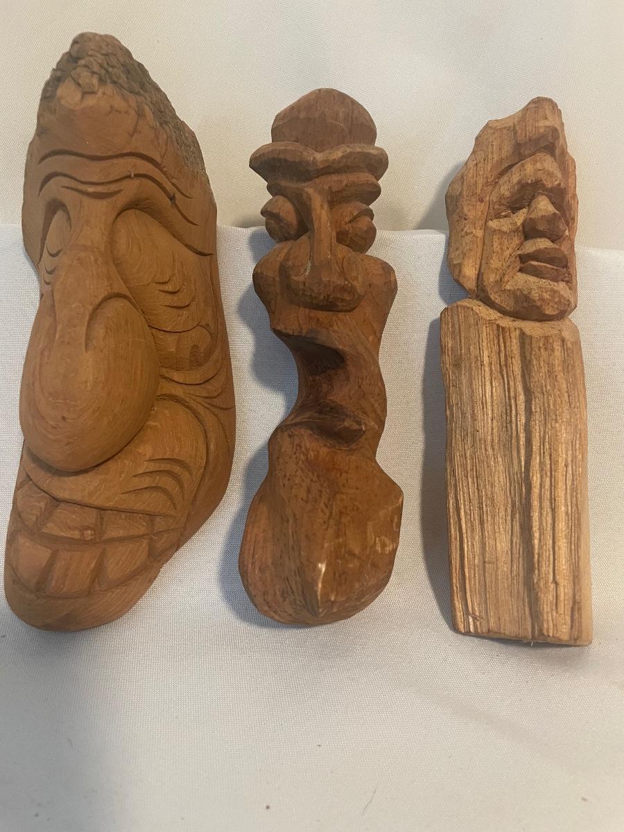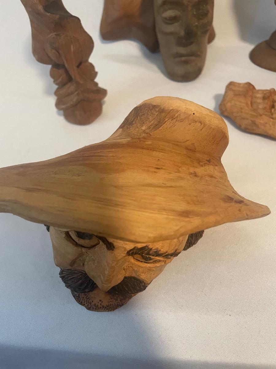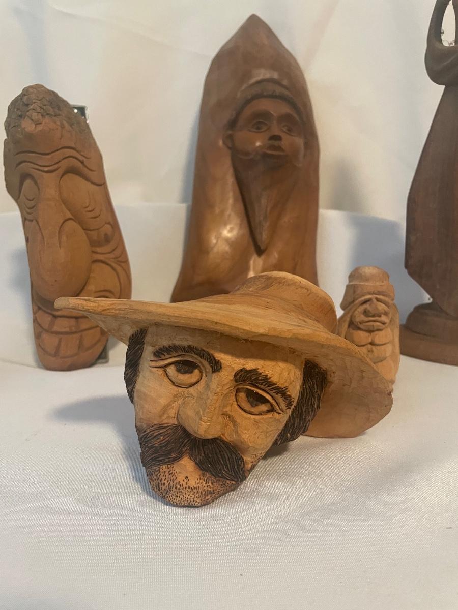 Four of these eight carved wooden statuettes are free standing (the hombre with mustache is possibly made of coconut), of the other four, the largest piece has a leather hanging cord, the rest do not. The face with the big nose has a sticker that says Masil.