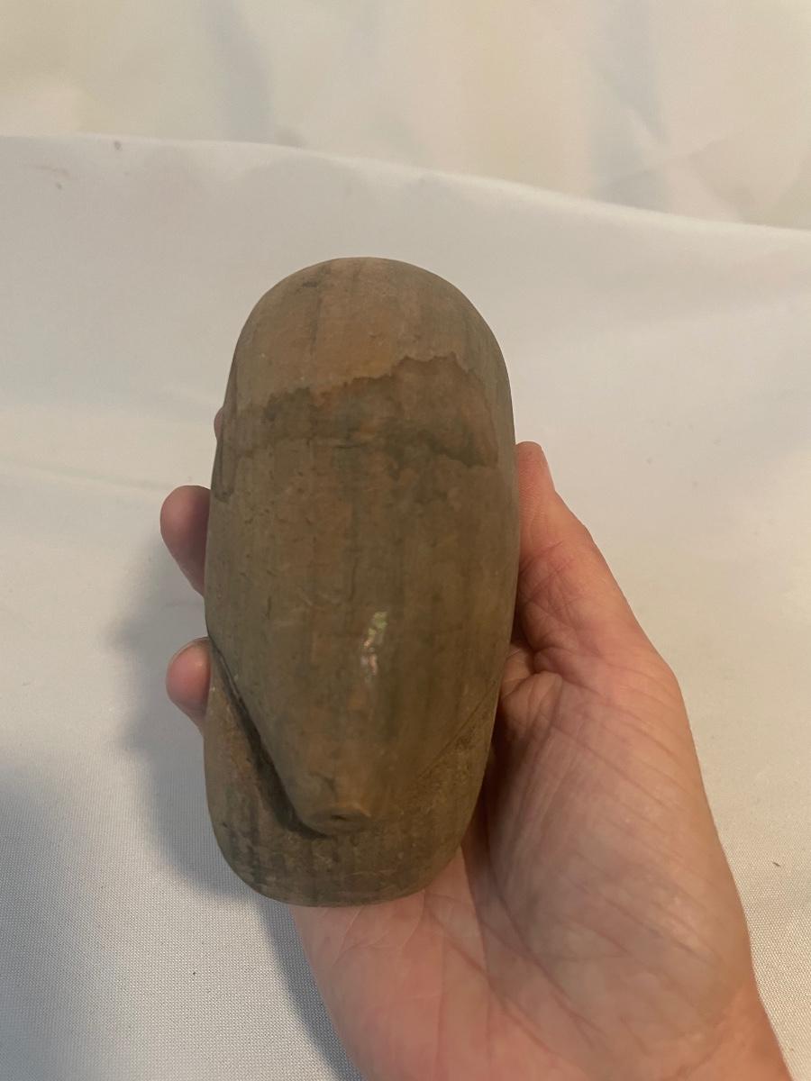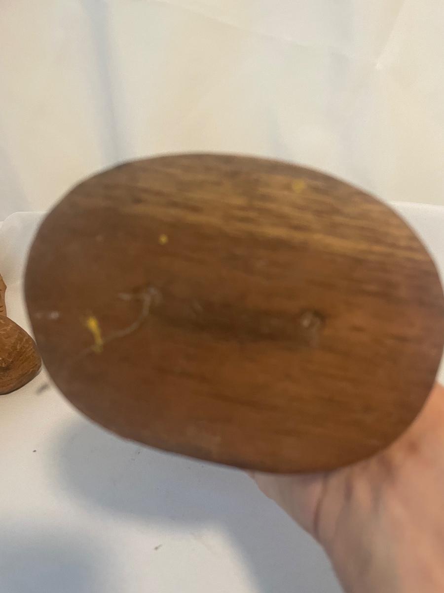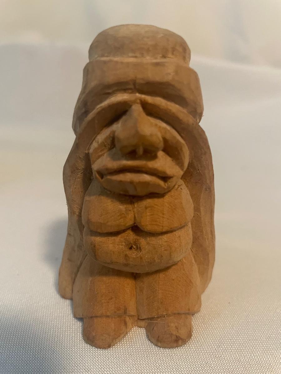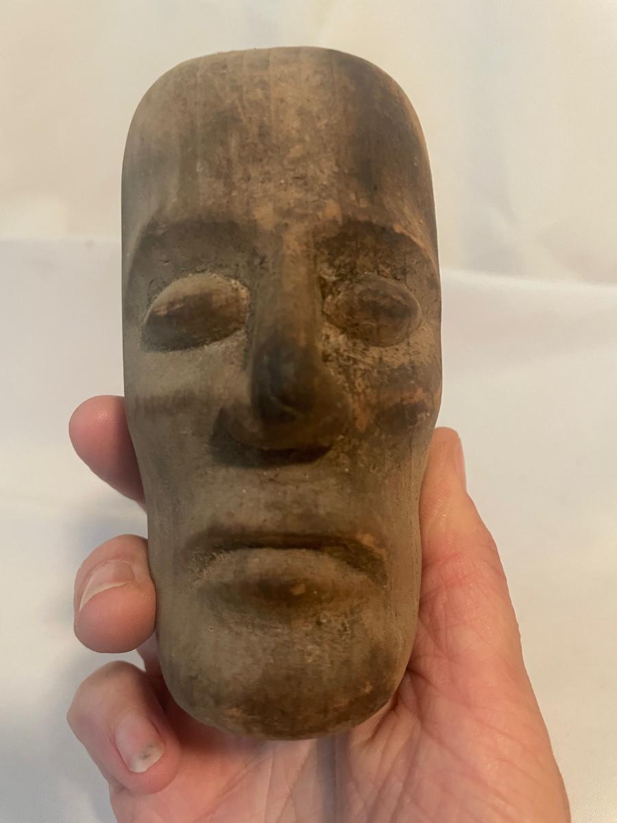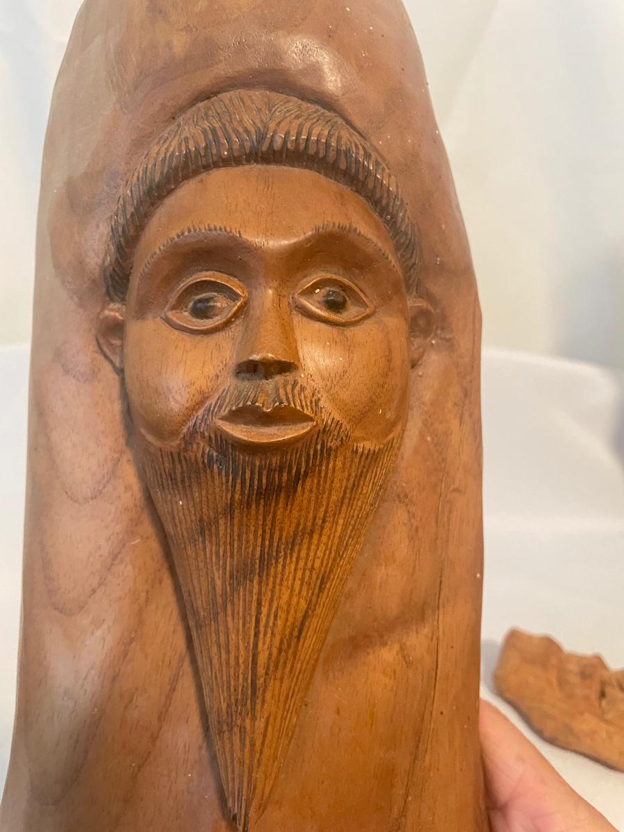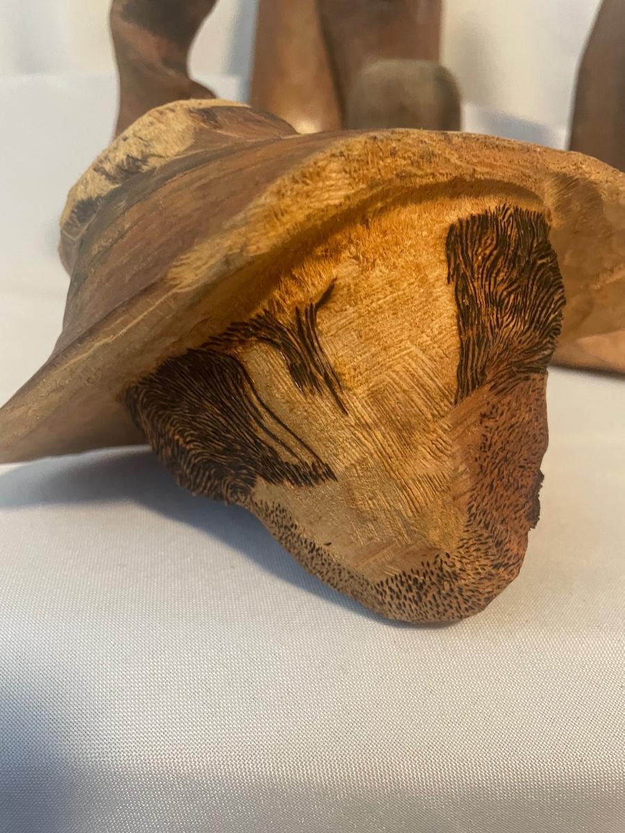 Four of these eight carved wooden statuettes are free standing (the hombre with mustache is possibly made of coconut), of the other four, the largest piece has a leather hanging cord, the rest do not. The face with the big nose has a sticker that says Masil.