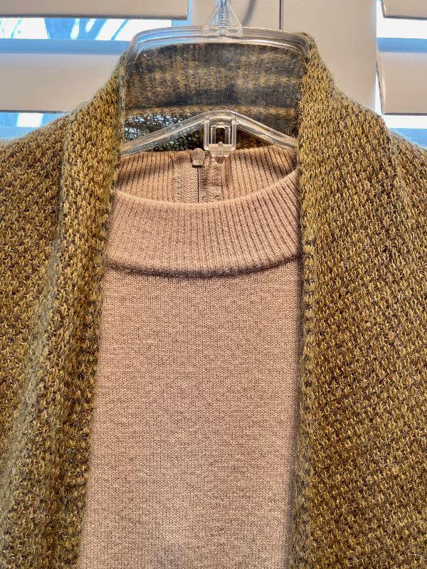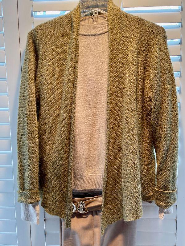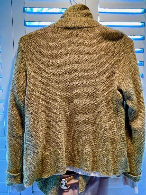 Great outfit. In this auction - the cardigan and sweater. See other listings for the leather belted Theory pants and the Bally shoes