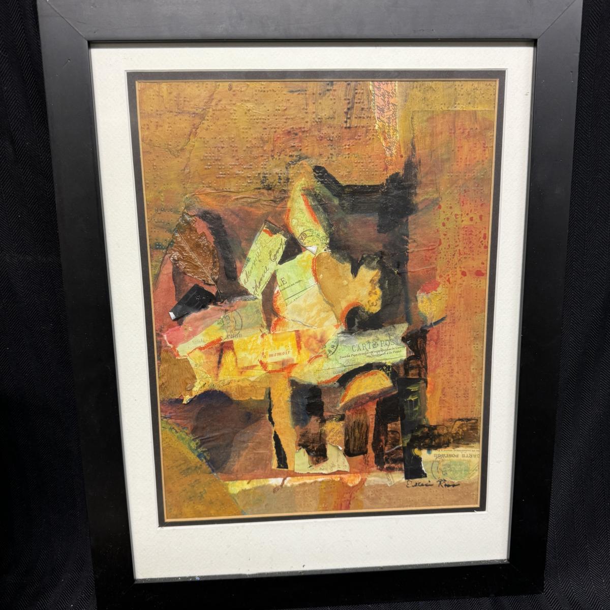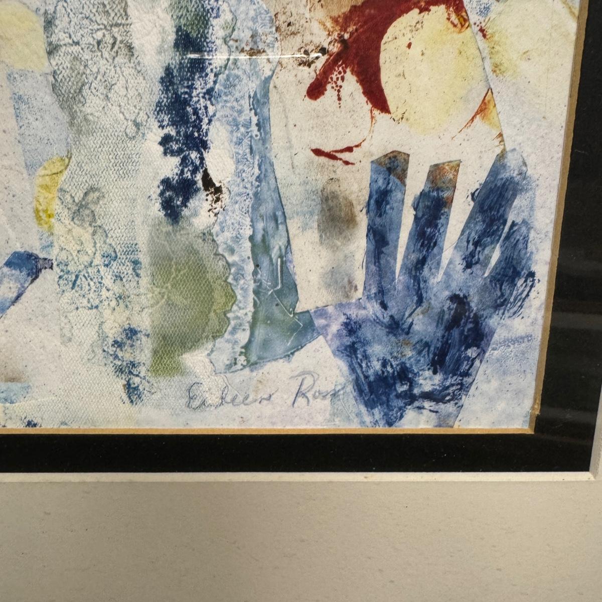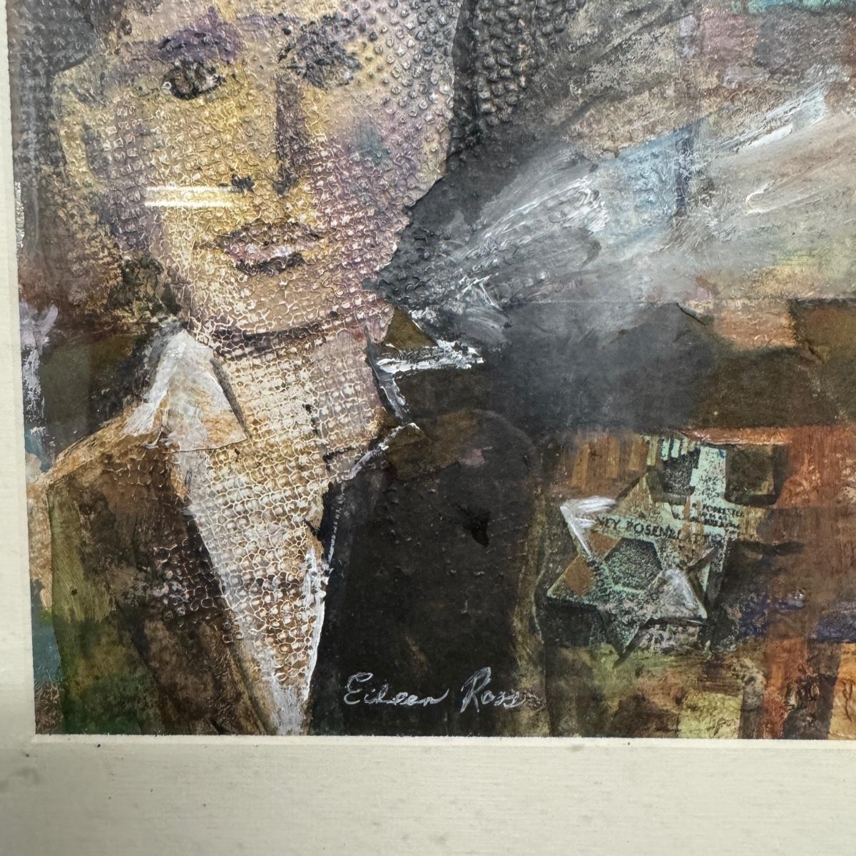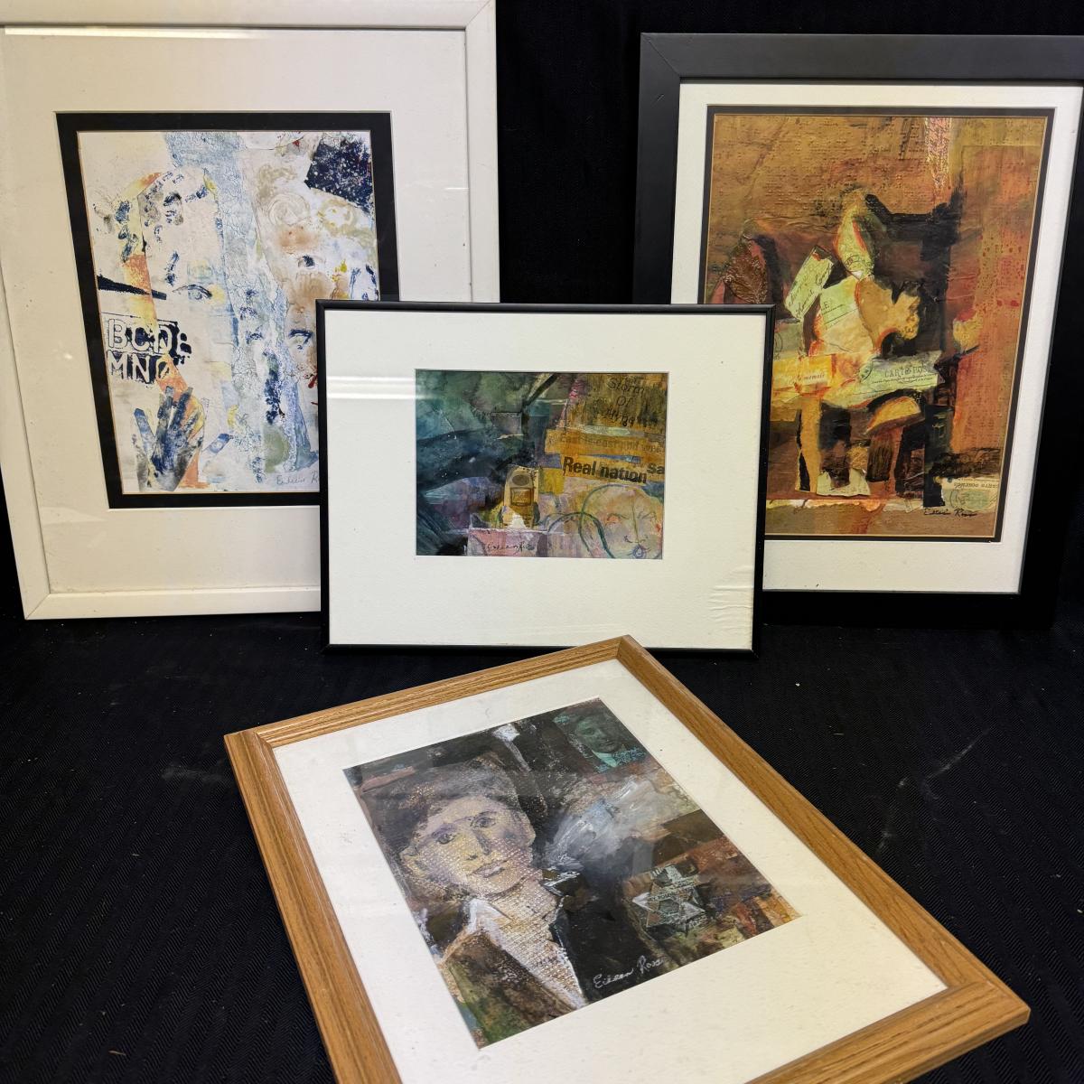 Four (under glass) framed art pieces by Eileen Ross. All collages. White framed piece measures 16.5” x19.5” Shipping available. Shipping can be costly. We suggest contacting our preferred local shipping provider, Postage Express, with dimensions and getting an estimate before bidding: (828) 255-9250 or shipping@postageexpressnc.com.