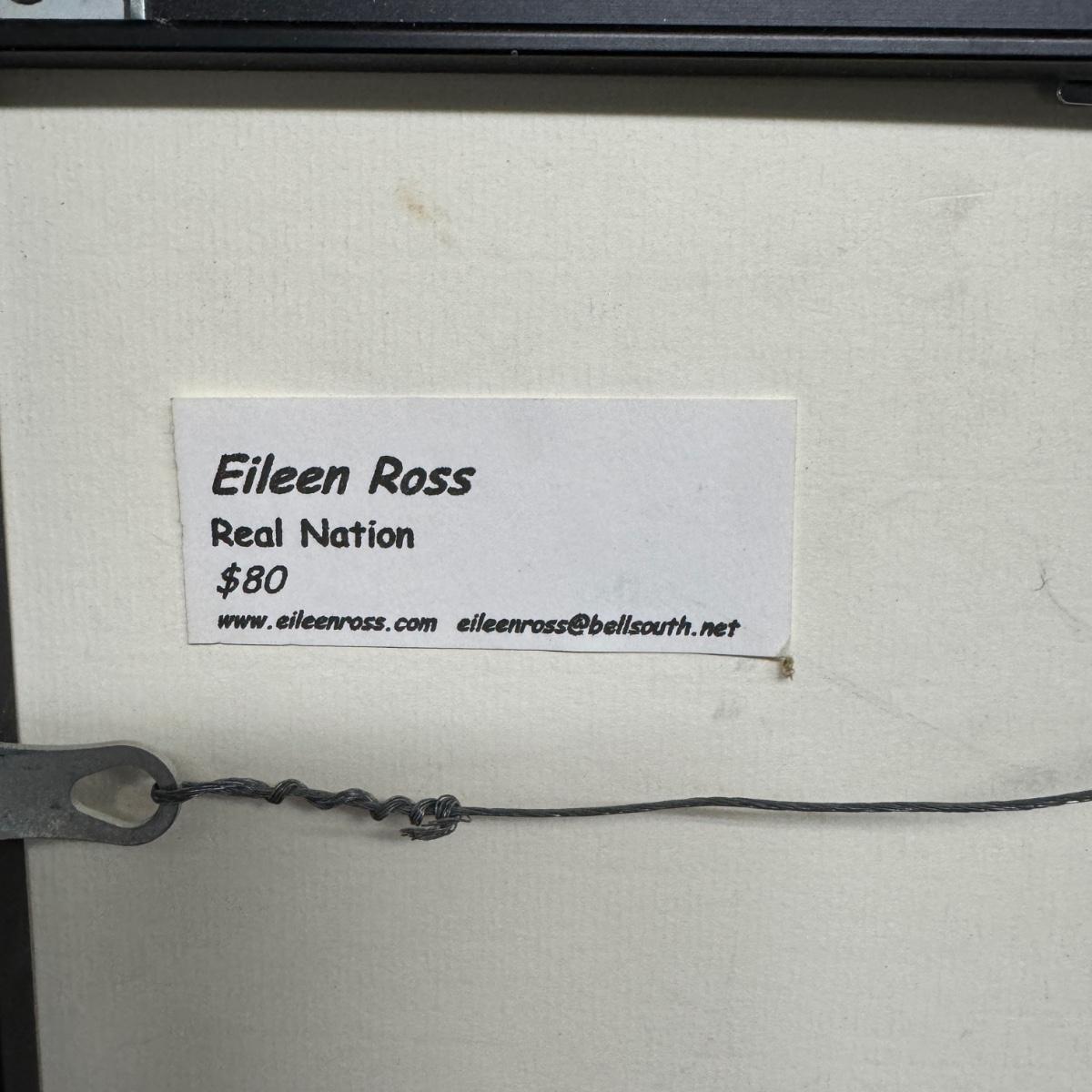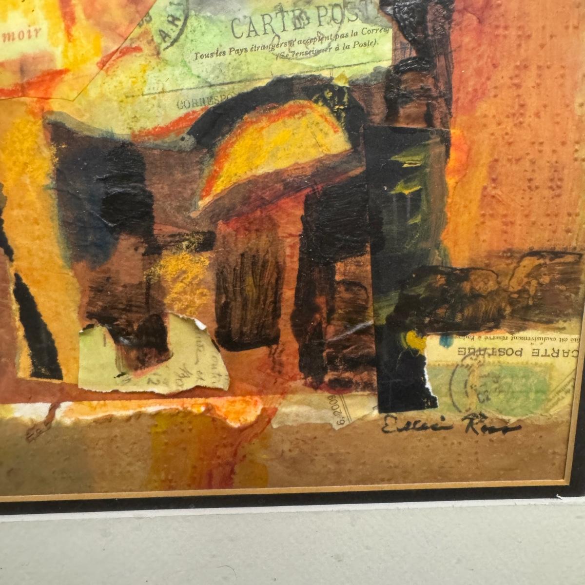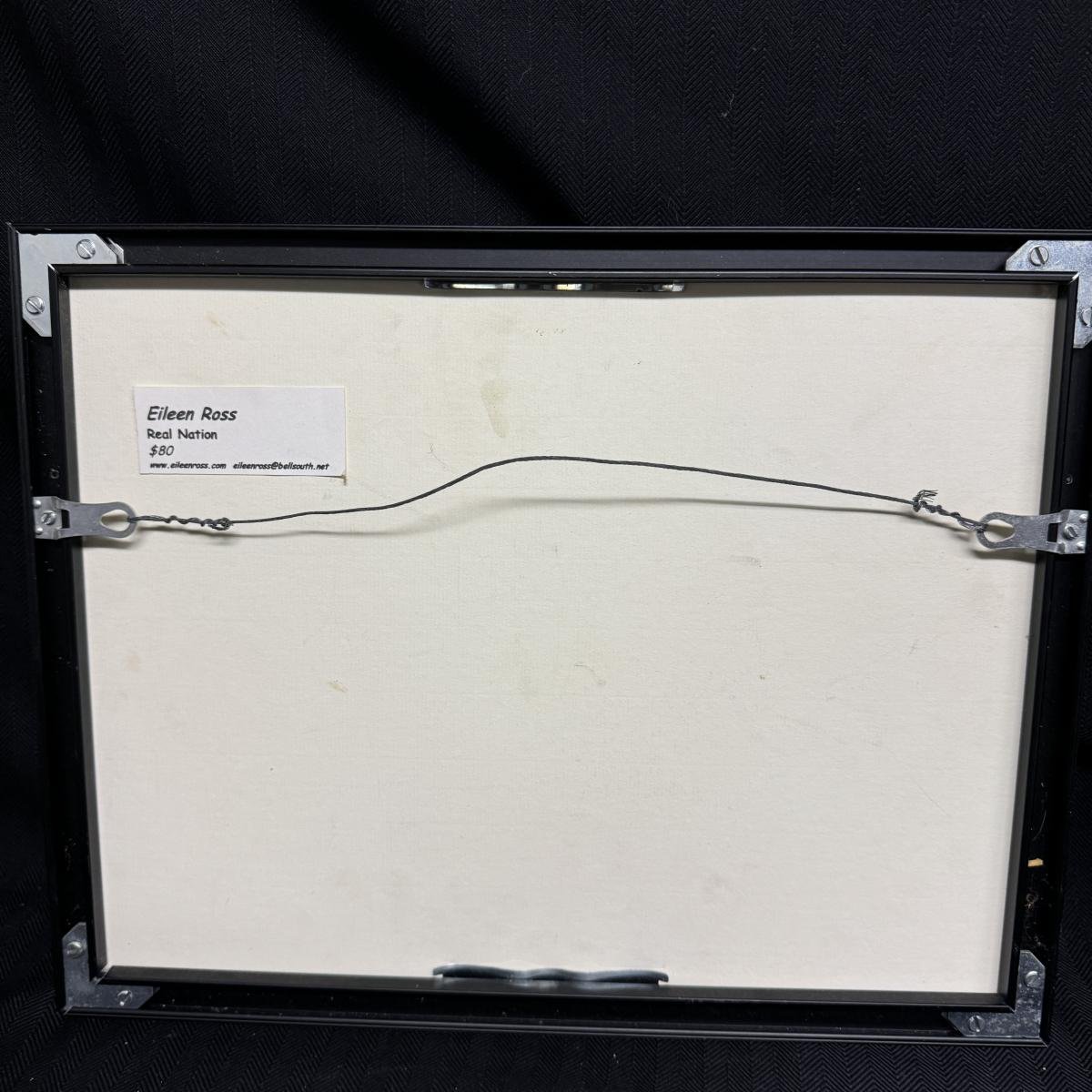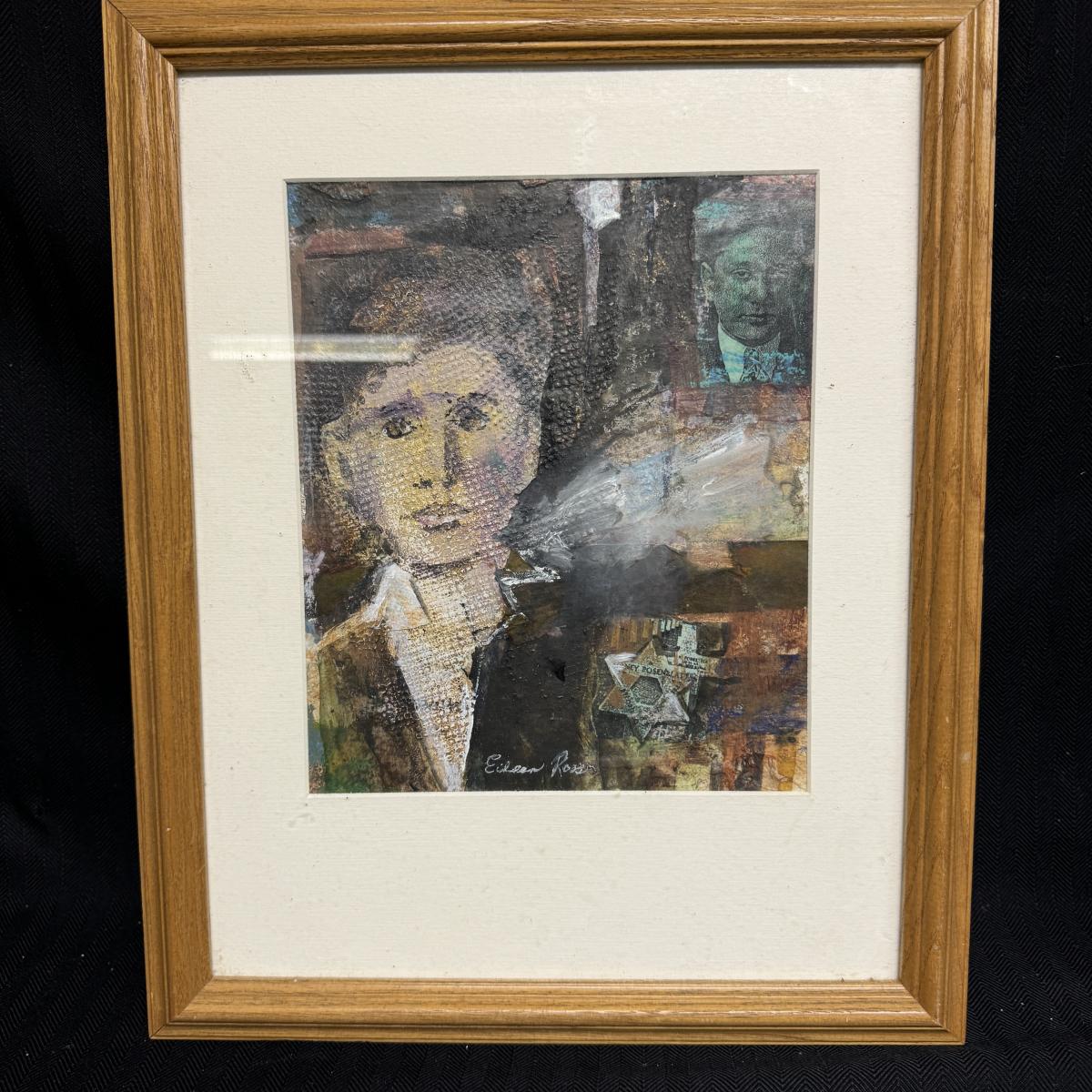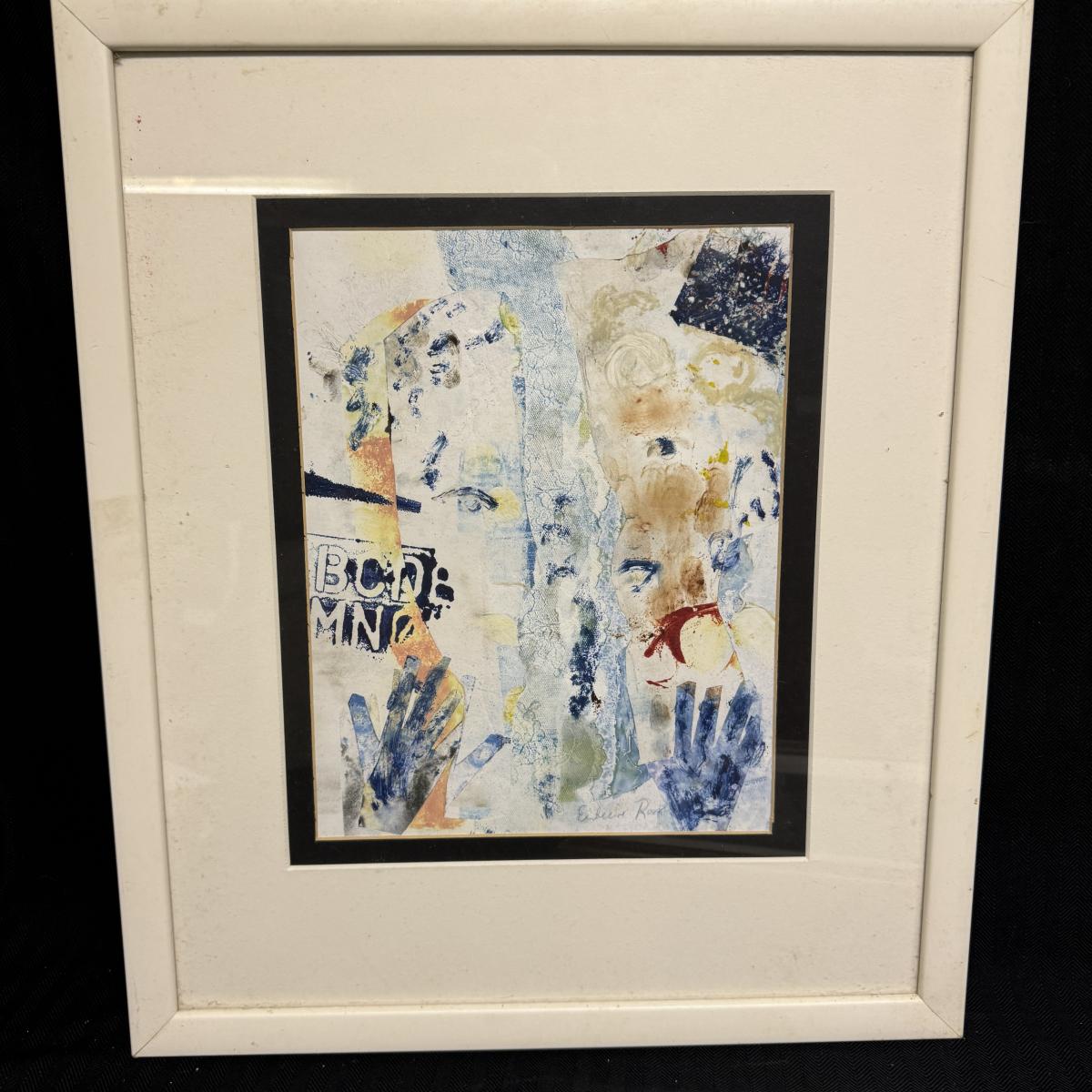 Four (under glass) framed art pieces by Eileen Ross. All collages. White framed piece measures 16.5” x19.5” Shipping available. Shipping can be costly. We suggest contacting our preferred local shipping provider, Postage Express, with dimensions and getting an estimate before bidding: (828) 255-9250 or shipping@postageexpressnc.com.