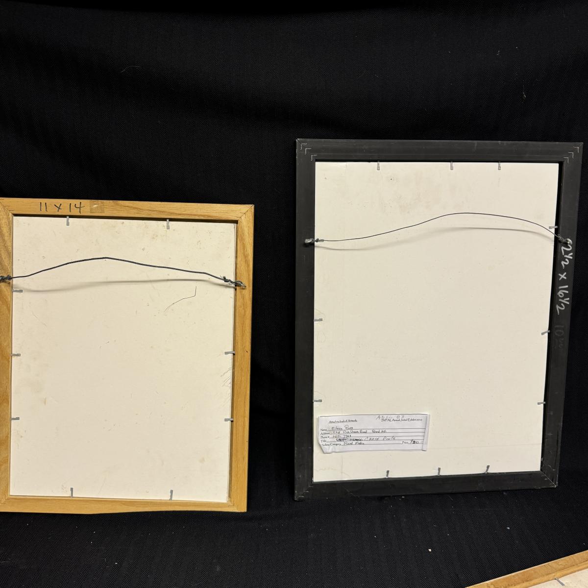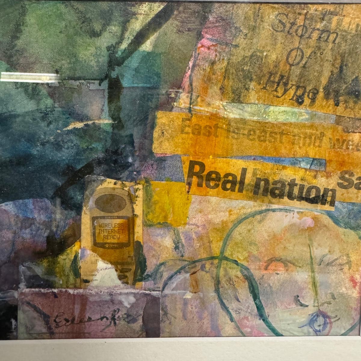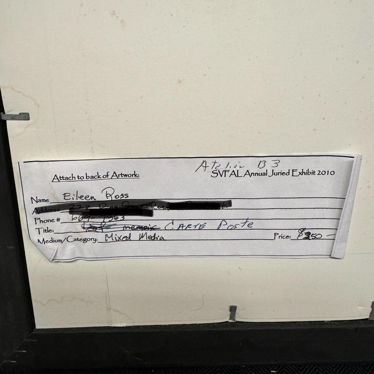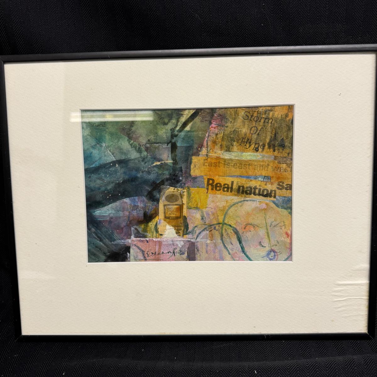 Four (under glass) framed art pieces by Eileen Ross. All collages. White framed piece measures 16.5” x19.5” Shipping available. Shipping can be costly. We suggest contacting our preferred local shipping provider, Postage Express, with dimensions and getting an estimate before bidding: (828) 255-9250 or shipping@postageexpressnc.com.