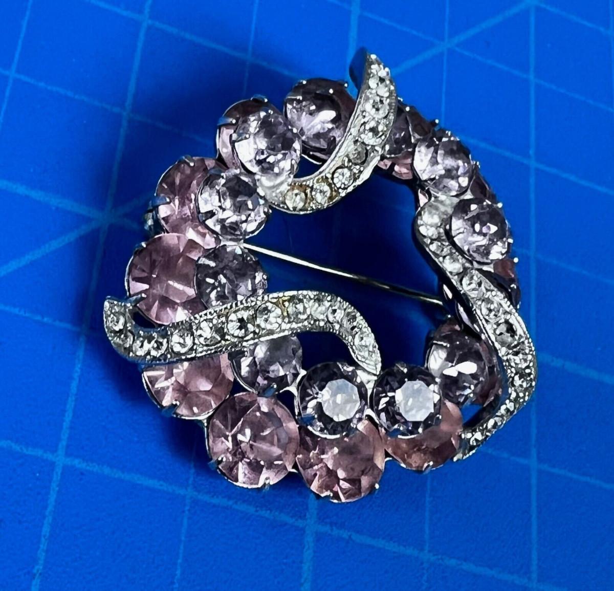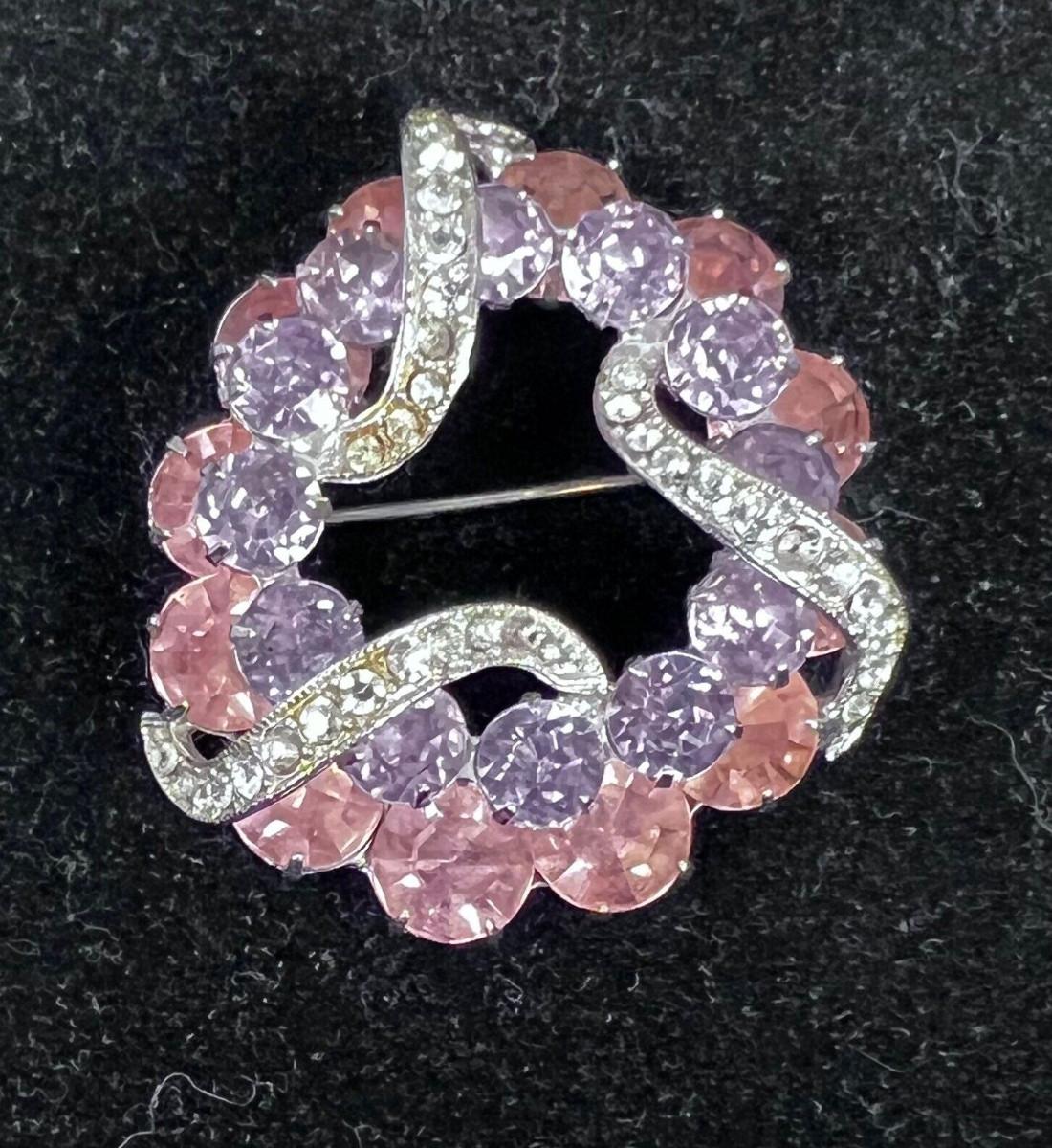 Beautiful condition on this vintage Eisenberg Pin. Lovely pink, clear and lavender stones, silver metal. marked Eisenberg, not sure of the metal composition. Tried to take photos on different backgrounds. True vintage estate find.