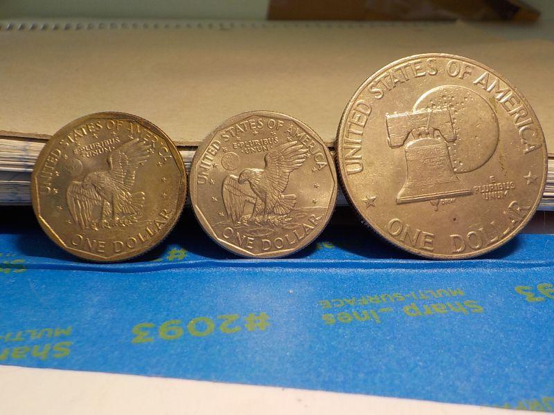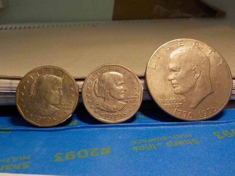 Eisenhower Centennial dollar and 2 Susan B. Anthony silver dollars.
