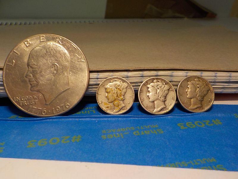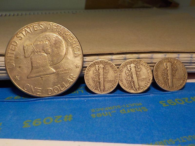 Eisenhower Centennial dollar and 3 mercury dimes (war).