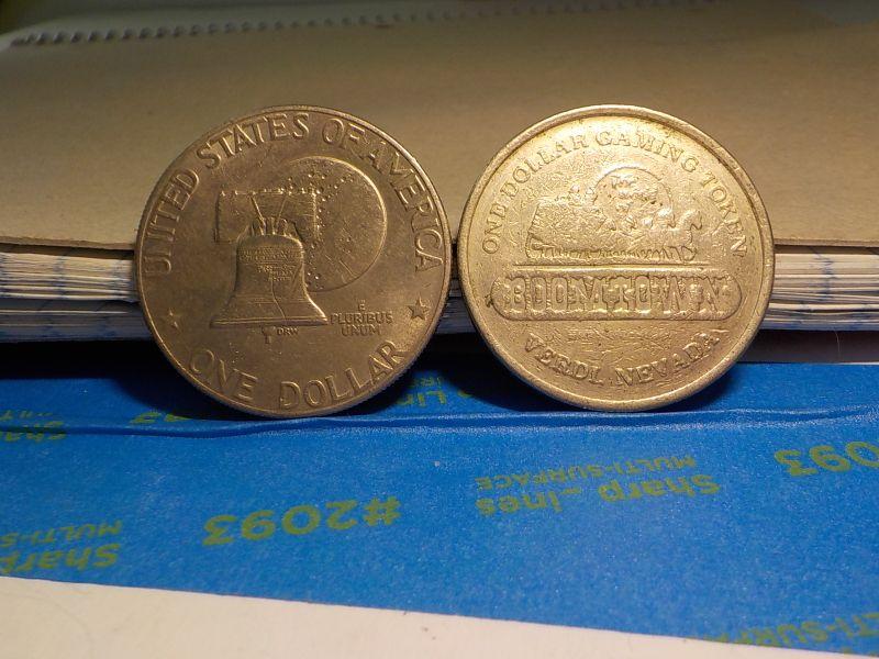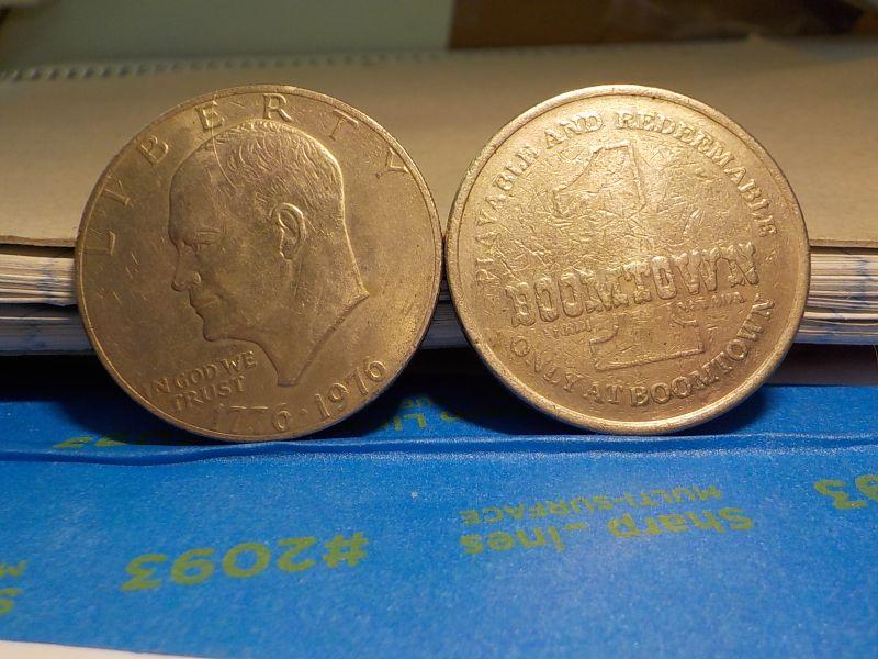 Eisenhower Centennial dollar and a BOOM TOWN Token.