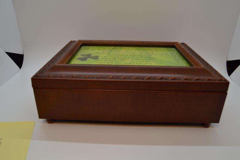 Beautiful clear music box plays "Thats An Irish Lullaby" flawlessly, with an Irish Blessing written on top. Coupled with a nice Vintage Gold Toned Belmar Watch, which is not in working condition. But hey that sweet tune carries the both of them! Literally.