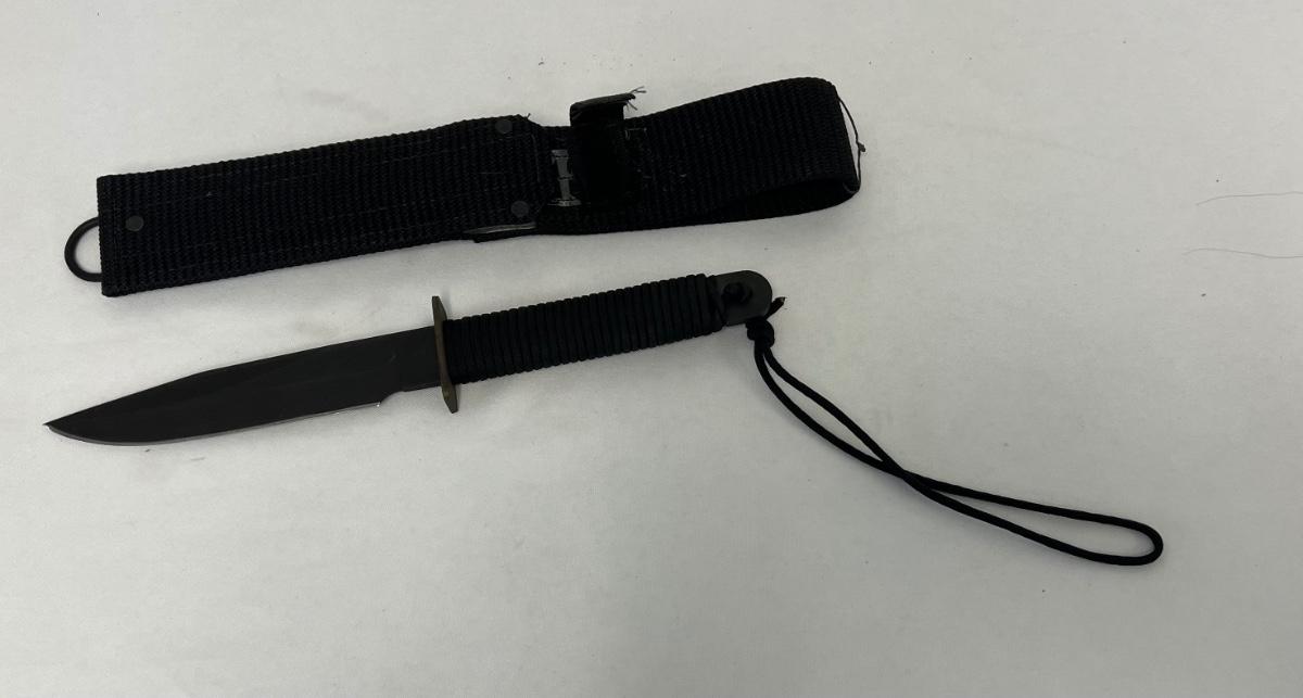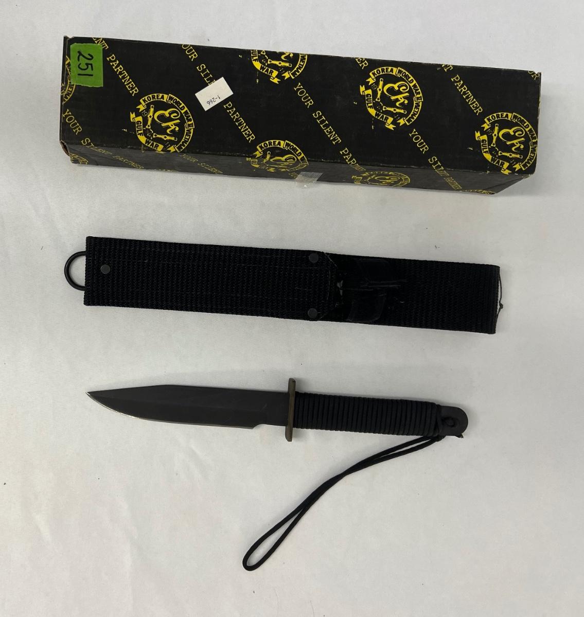The knife is unmarked, but is believed to be made by E.K. Knife Co. The sheath is marked. Has a nylon wrapped pommel. Includes black web sheath and box. Measurement: 6.75"L (blade); 12.75"L (overall). [LA]