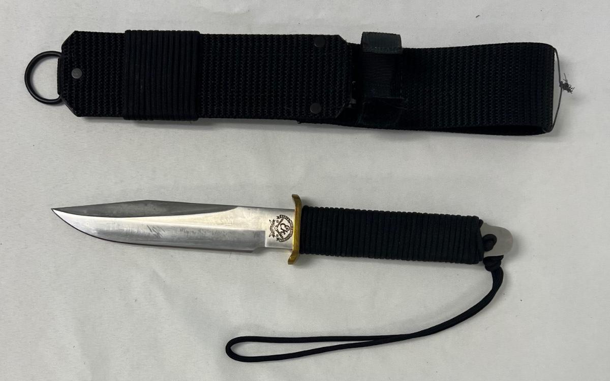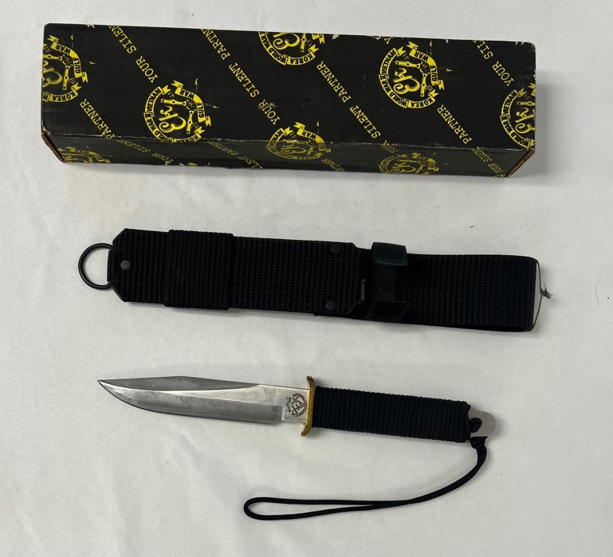 Has a black wrapped pommel. Includes black web sheath and box. Measurement: 6.75"L (blade); 12.75"L (overall). [LA]