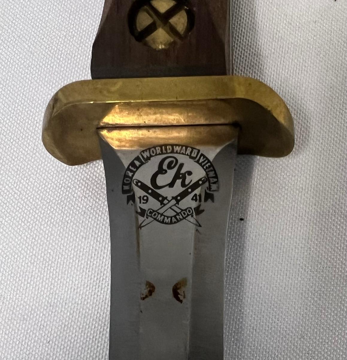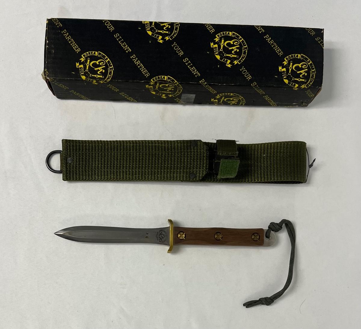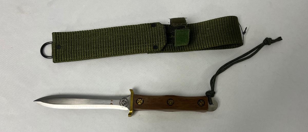 Wood pommel. Includes a green web sheath and box. Measurement: 6.5"L (blade); 12.5"L (overall). [LA]