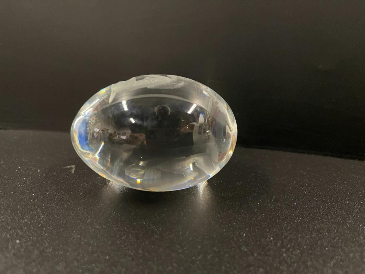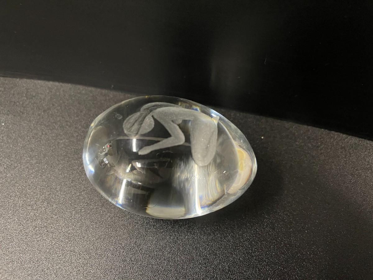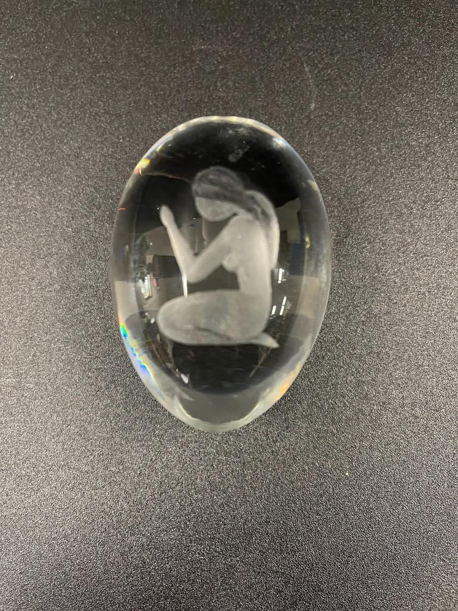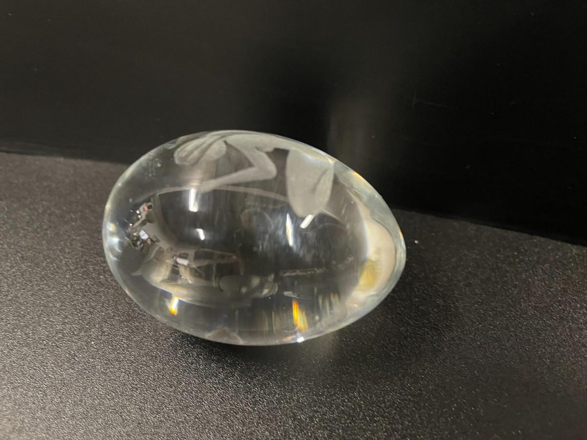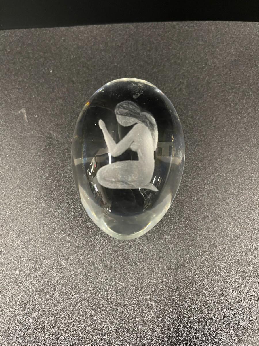 Modernist, 1970s era Virgo themed, etched on crystal paperweight egg. Lovely, simple figure of Virgo in a smooth, simple egg. 3" # 1069