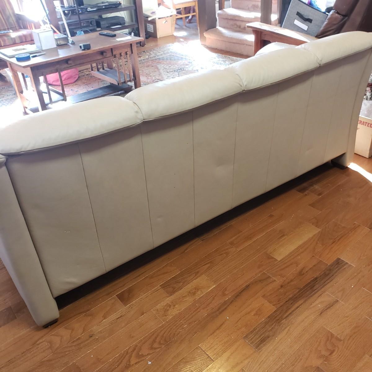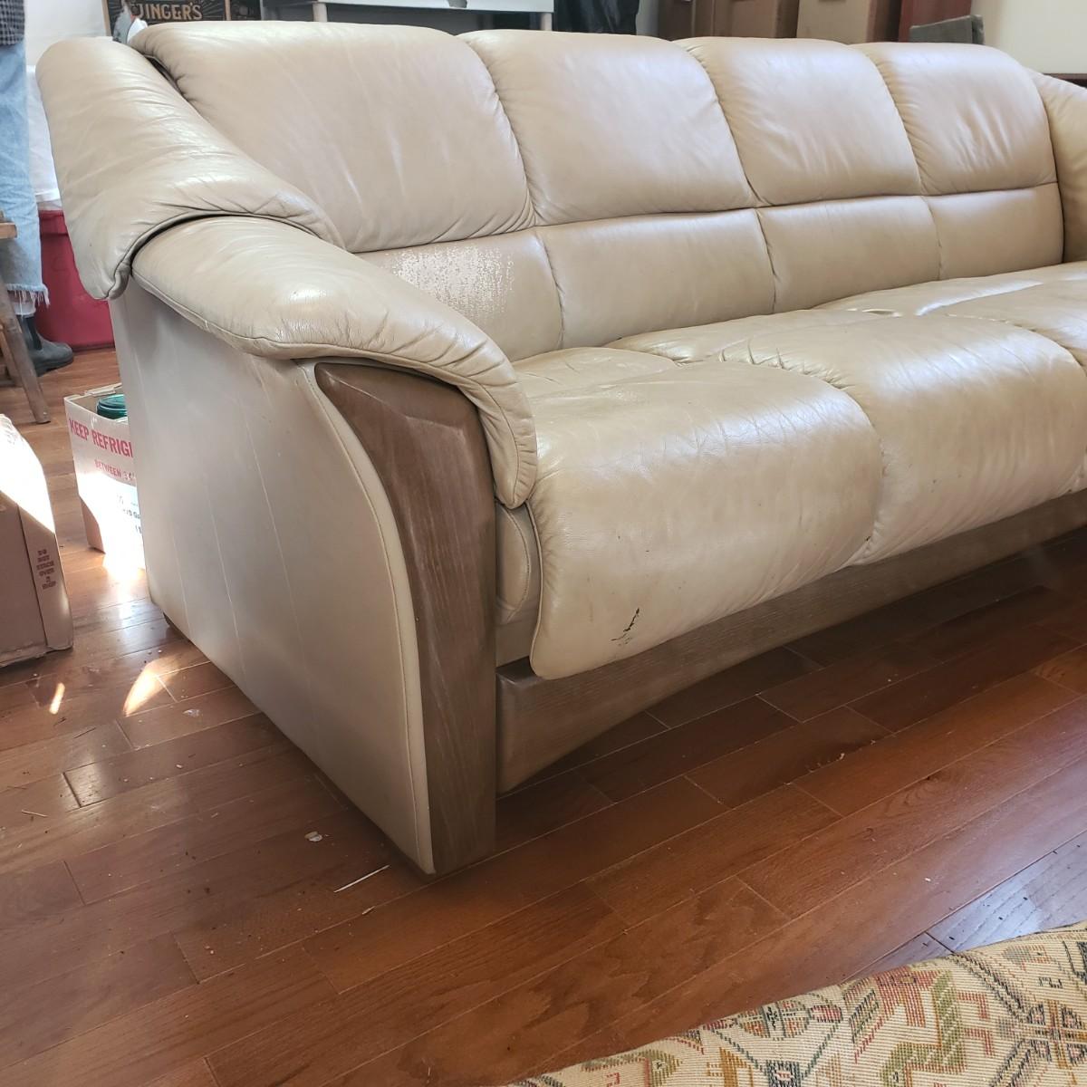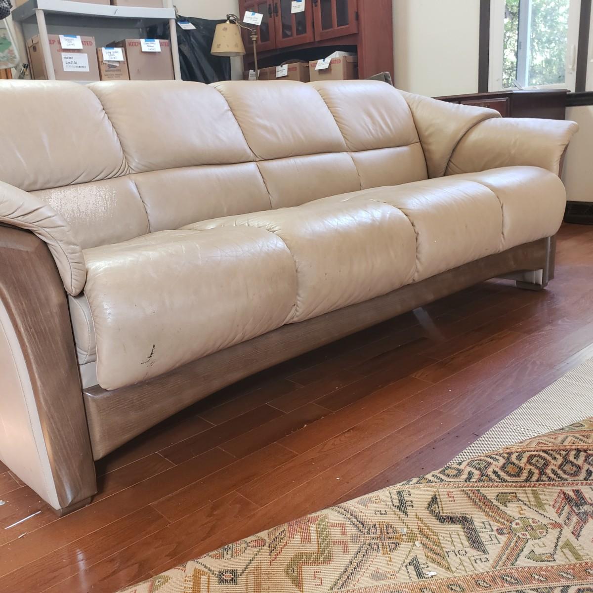This Ekornes tan leather sofa measures 85" x 36" x 32"H. There is a smooth wood feature along the front and sides of the sofa, see pictures. The leather has some worn spots, especially the left side seat. Dark tan color. Looks much lighter in photos. Last photo depicts color. The seat height of the sofa is approximately 18 inches.