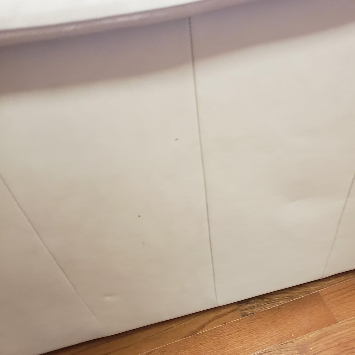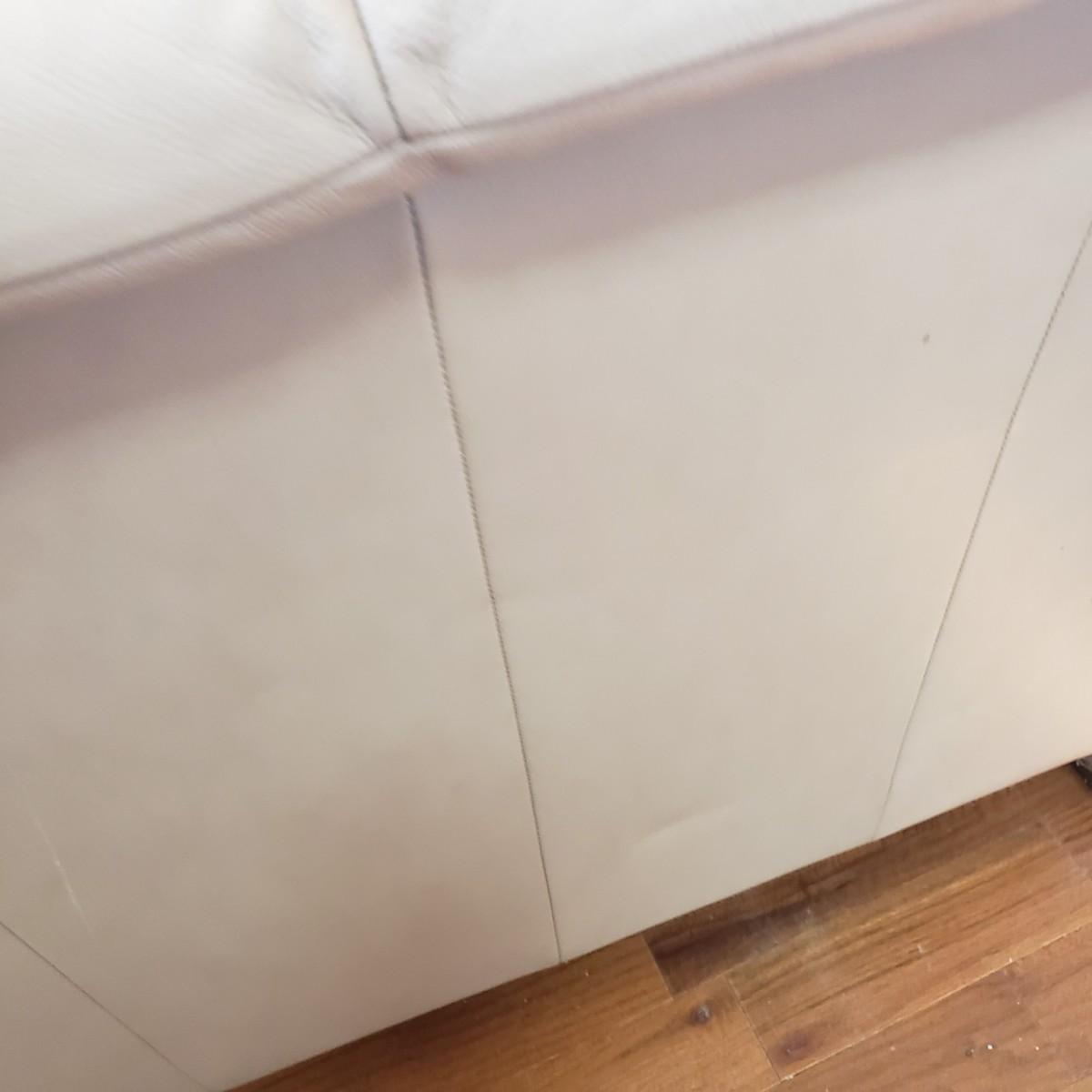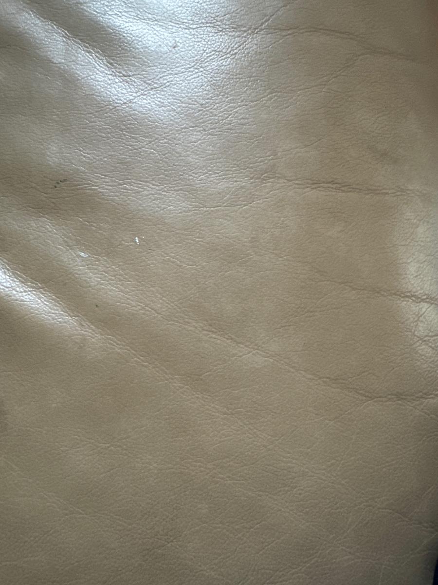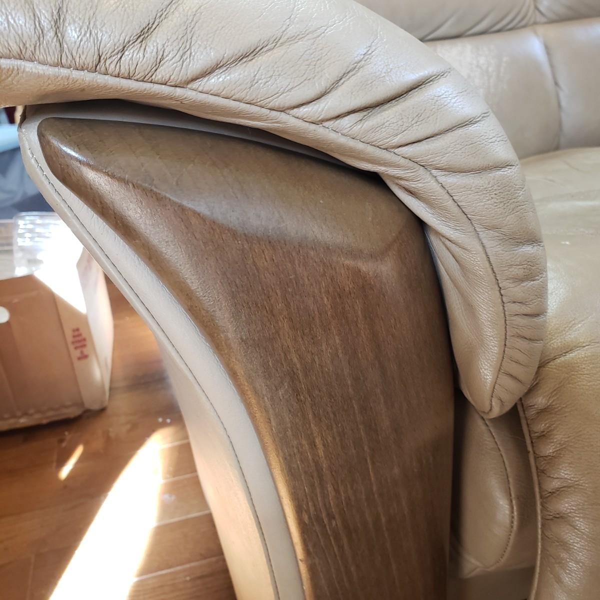 This Ekornes tan leather sofa measures 85" x 36" x 32"H. There is a smooth wood feature along the front and sides of the sofa, see pictures. The leather has some worn spots, especially the left side seat. Dark tan color. Looks much lighter in photos. Last photo depicts color. The seat height of the sofa is approximately 18 inches.