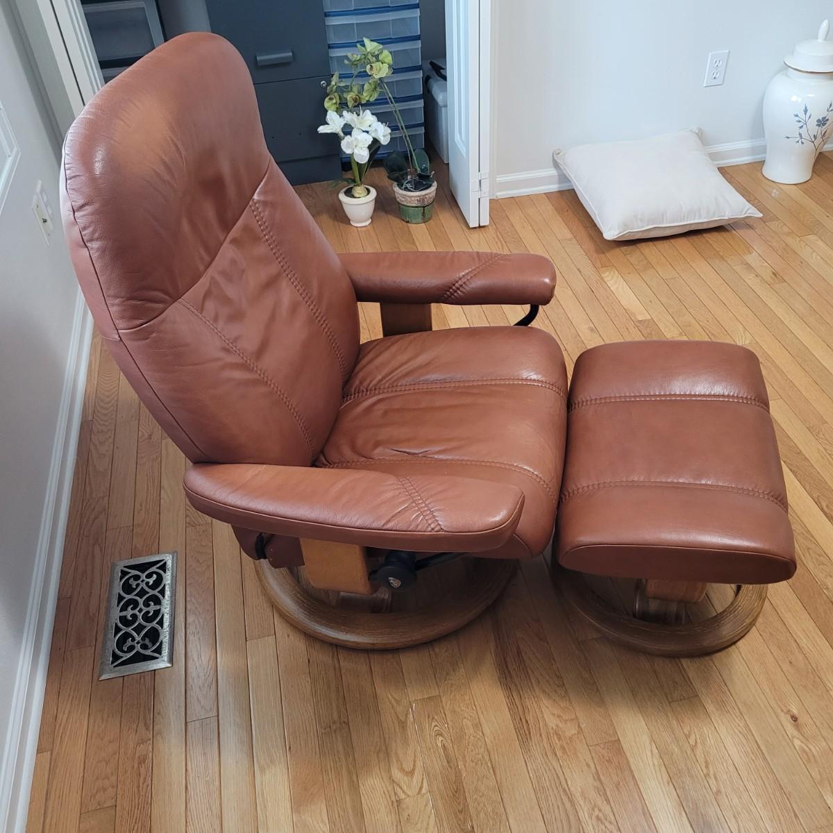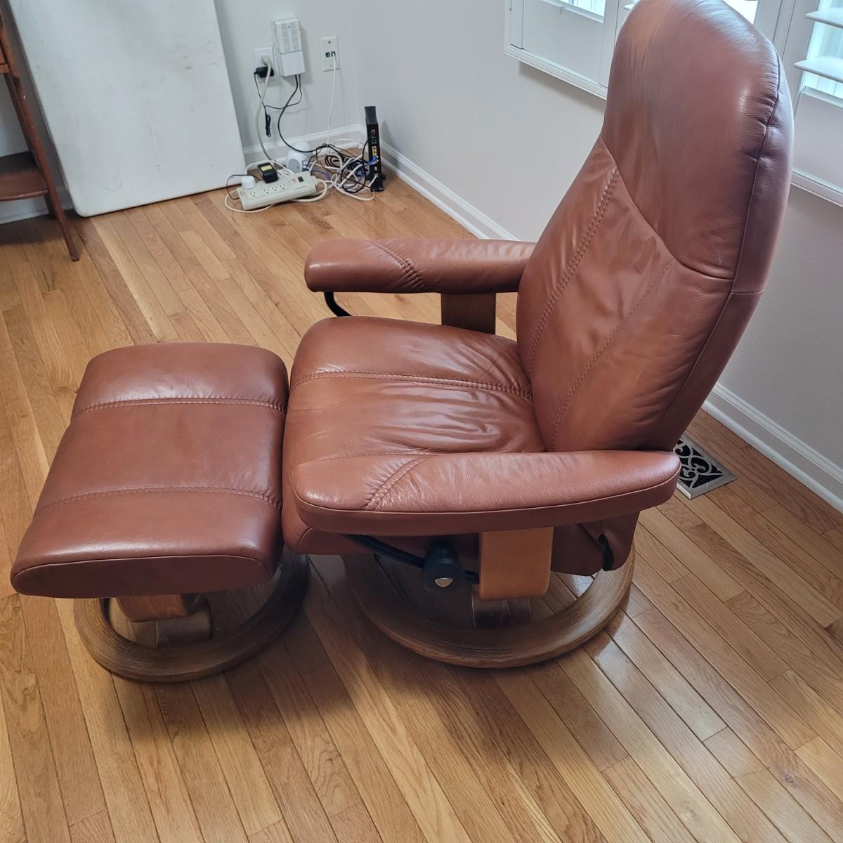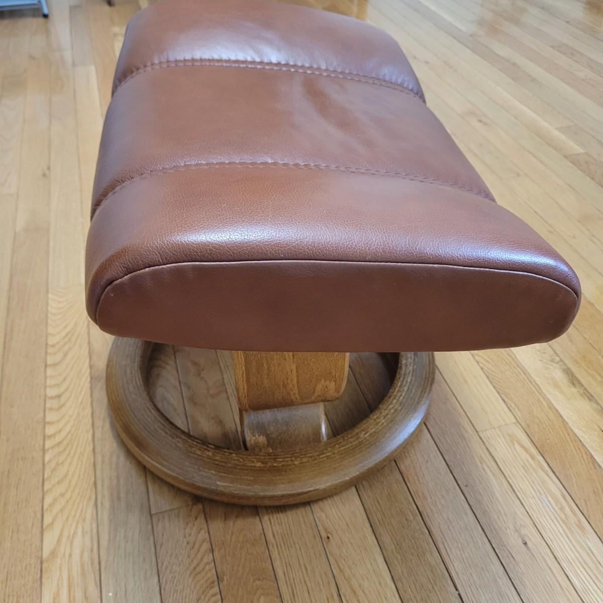 A brown leather Ekornes brand Stressless style recliner and foot stool. The chair and ottoman are made from wood and leather with polyester filling. The chair reclines and the ottoman is also adjustable for maximum comfort. Both items also swivel freely. There is a bit of a faded spot near the head of the chair, otherwise, these items are in very good condition. The chair measures 31" x 26" x 40"H with a 15"H seat height. Please see Photos for details.
