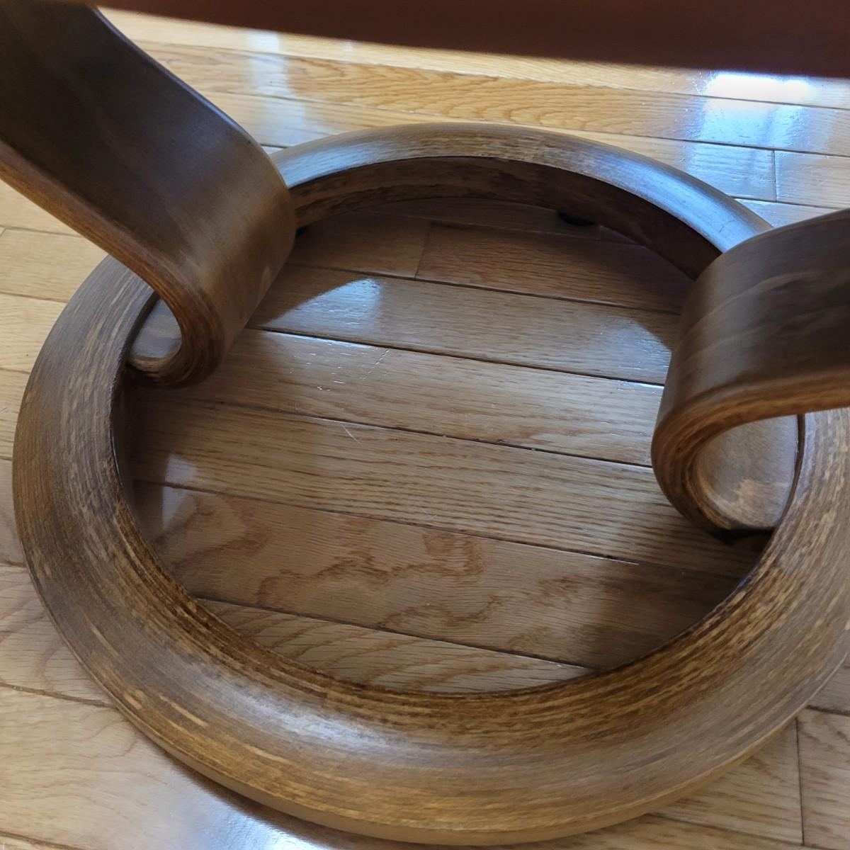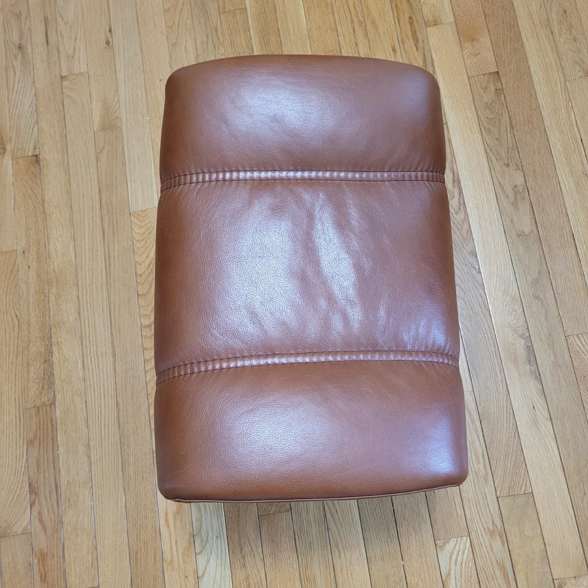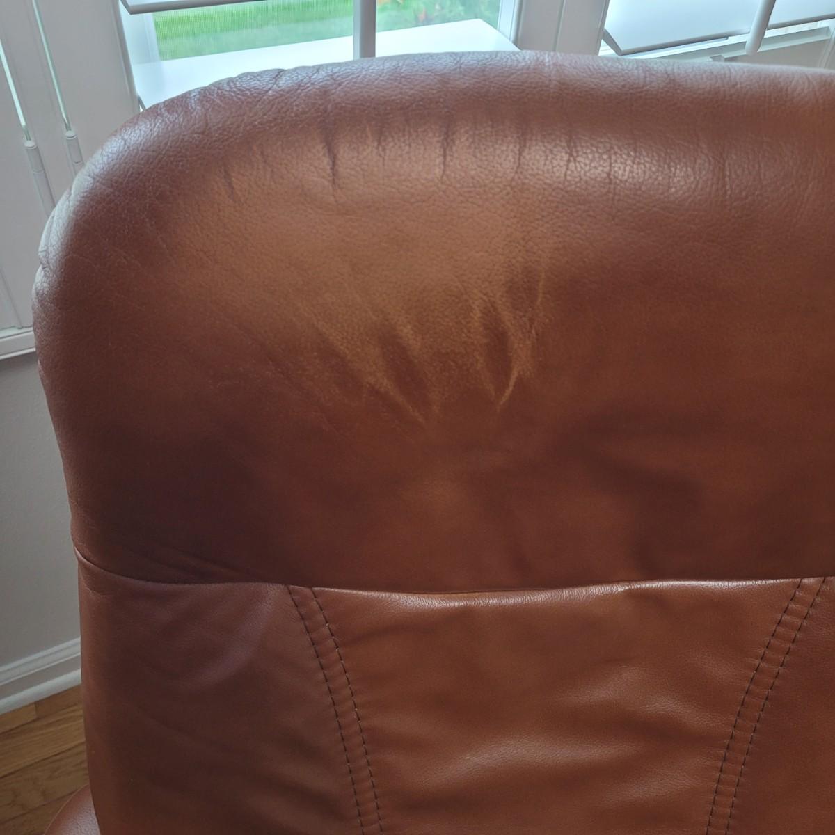 A brown leather Ekornes brand Stressless style recliner and foot stool. The chair and ottoman are made from wood and leather with polyester filling. The chair reclines and the ottoman is also adjustable for maximum comfort. Both items also swivel freely. There is a bit of a faded spot near the head of the chair, otherwise, these items are in very good condition. The chair measures 31" x 26" x 40"H with a 15"H seat height. Please see Photos for details.