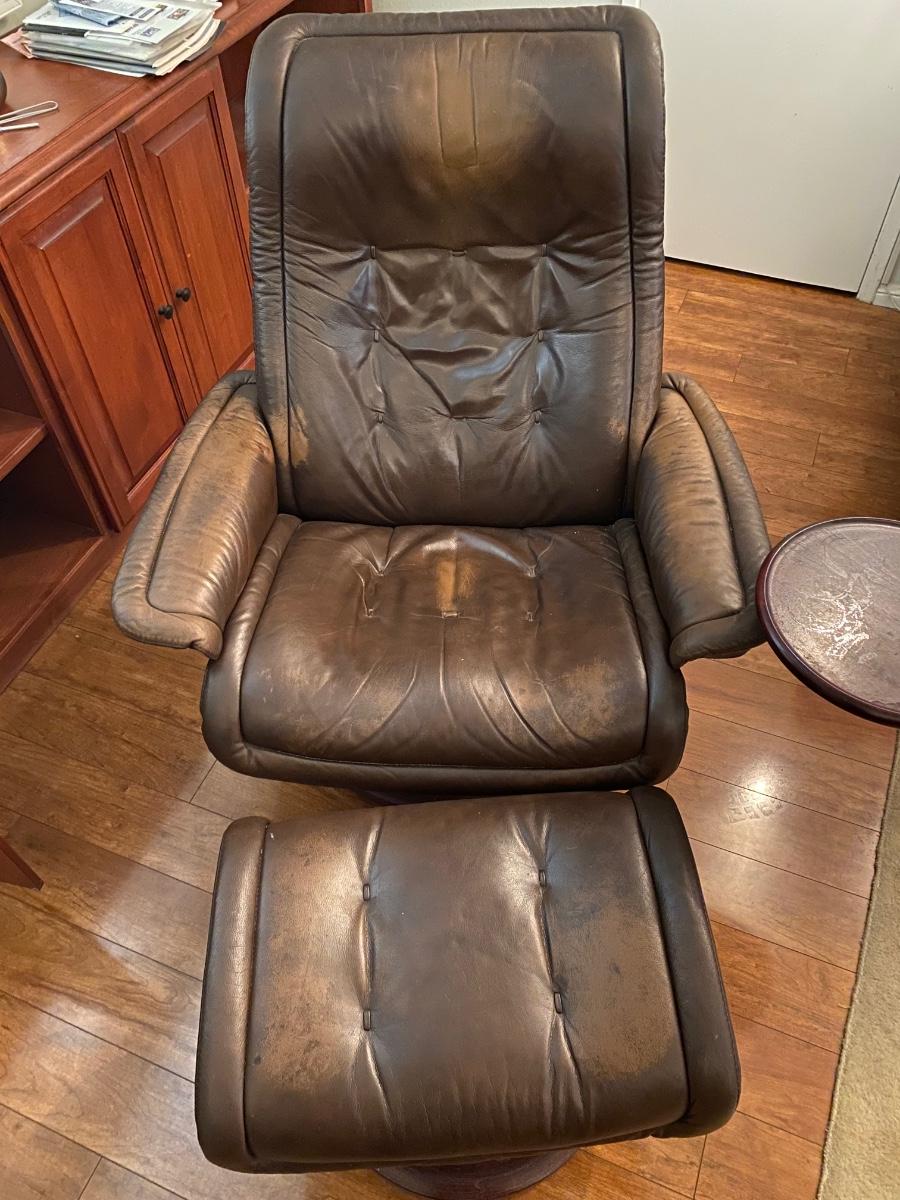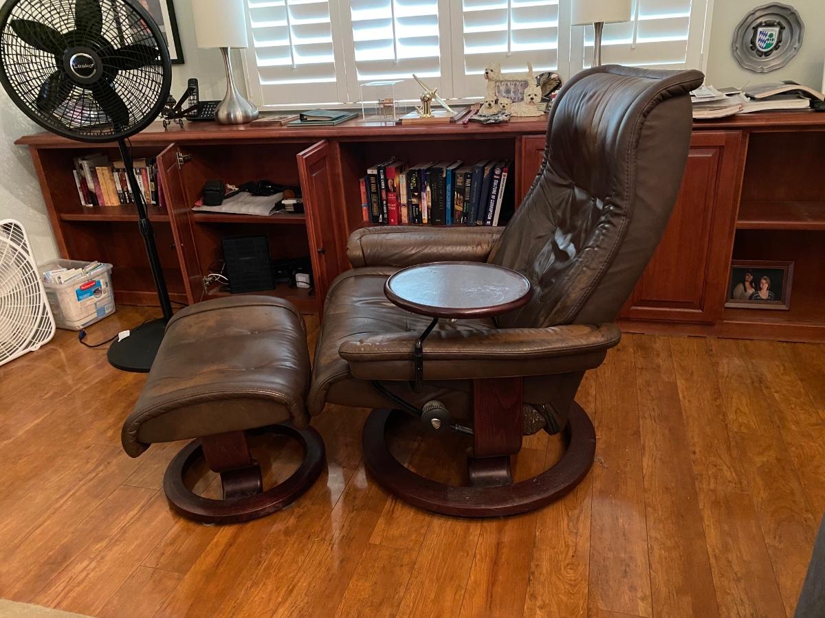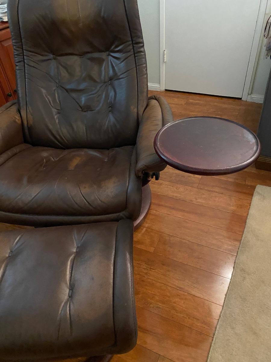 Ekornes Stressless Recliner Cushioned Chair with Small Attached Side Table and Footrest Ottoman. Discoloration and wear to the cushioned seat from use but no holes or tears noticed. Small round table can be moved to side for getting in and out of chair.