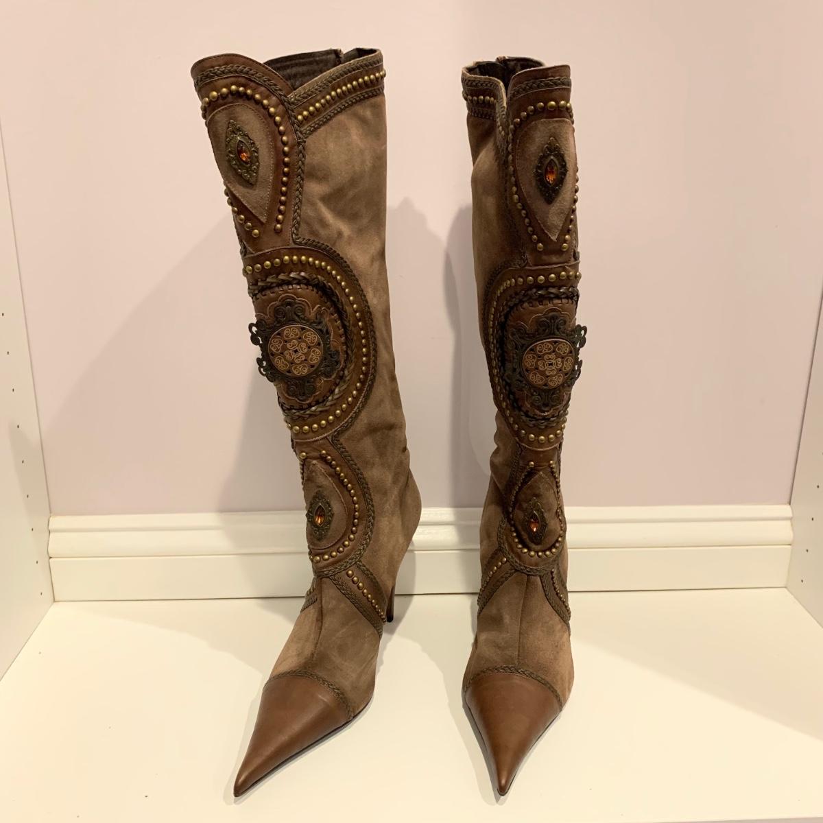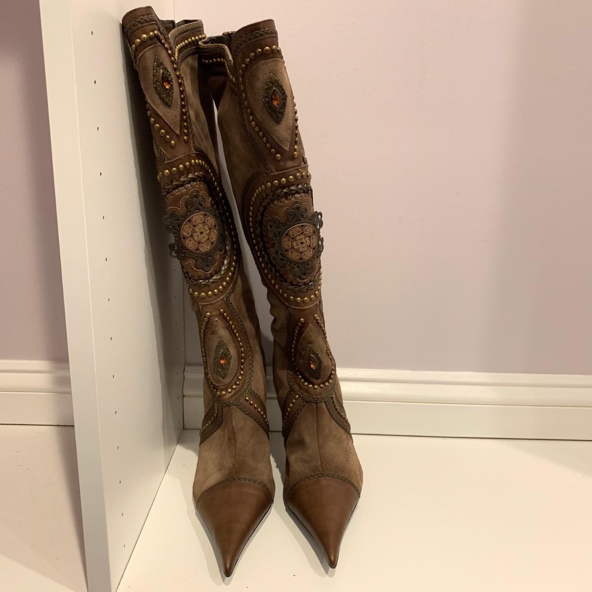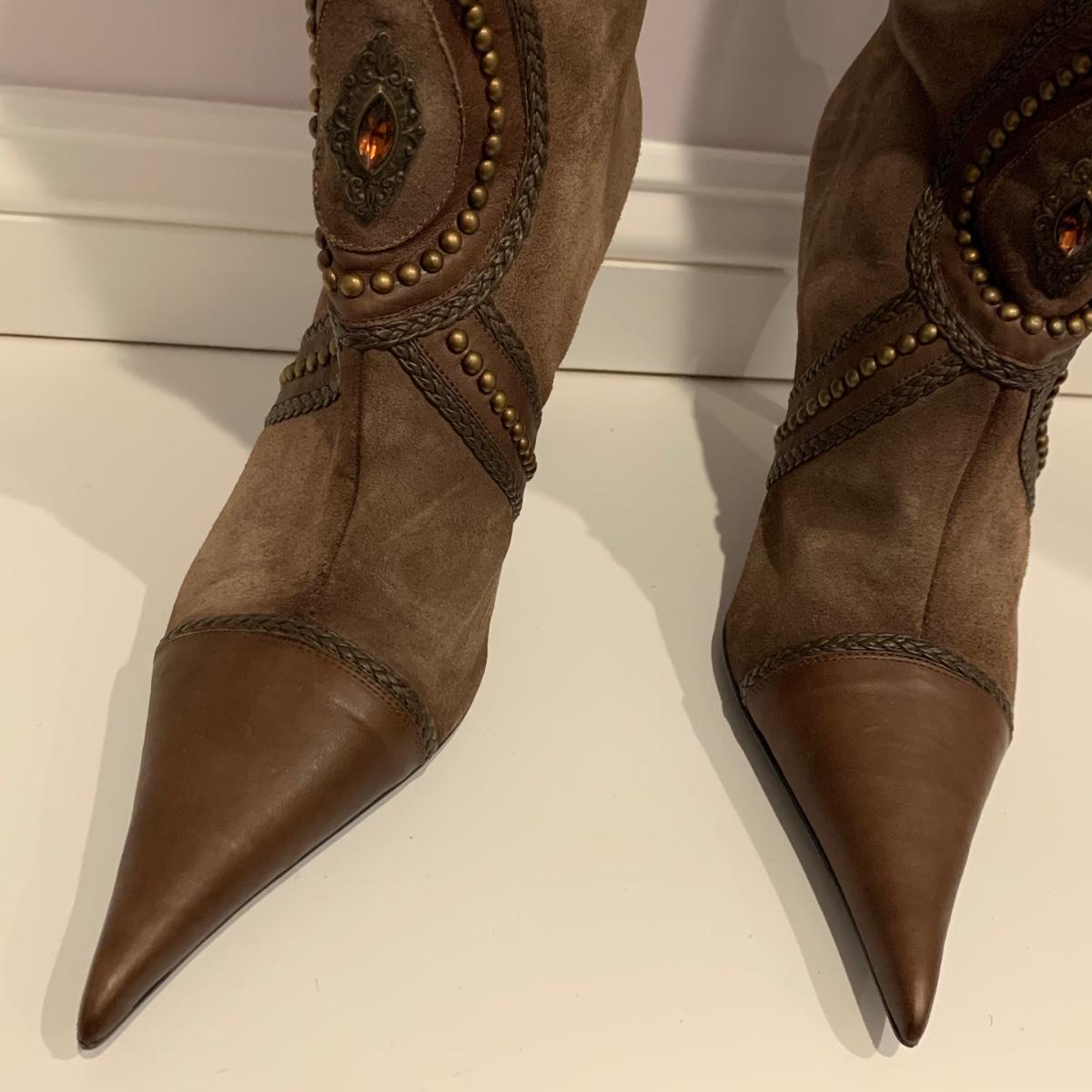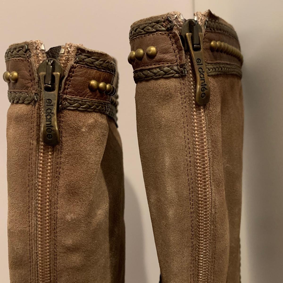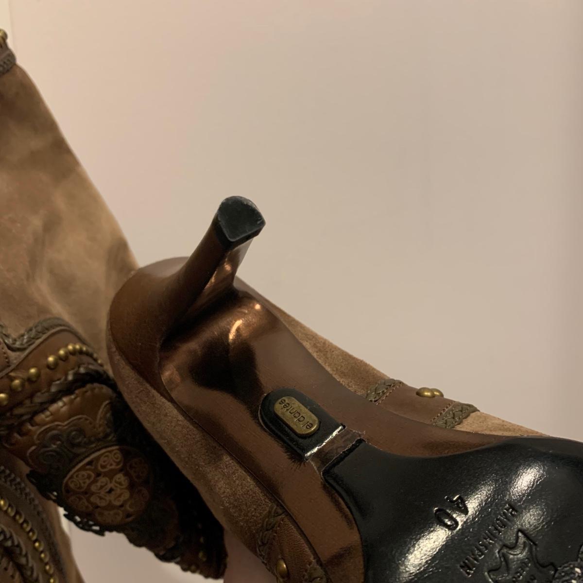 A gorgeous pair of brown leather and suede stiletto boots by El Dantés with stud embellishments. Boots zip up the back. They appear to be very gently worn, if at all as the soles are very new like looking. Stiletto heels are about 4”. Boots themselves are 19”H.