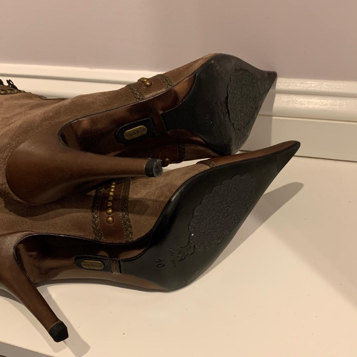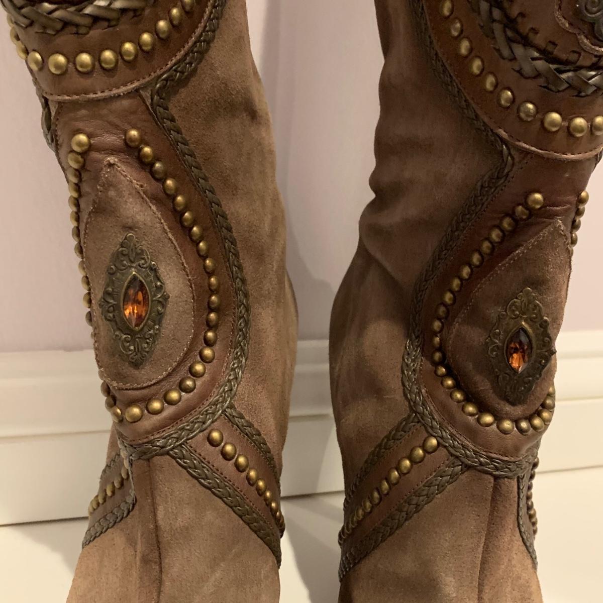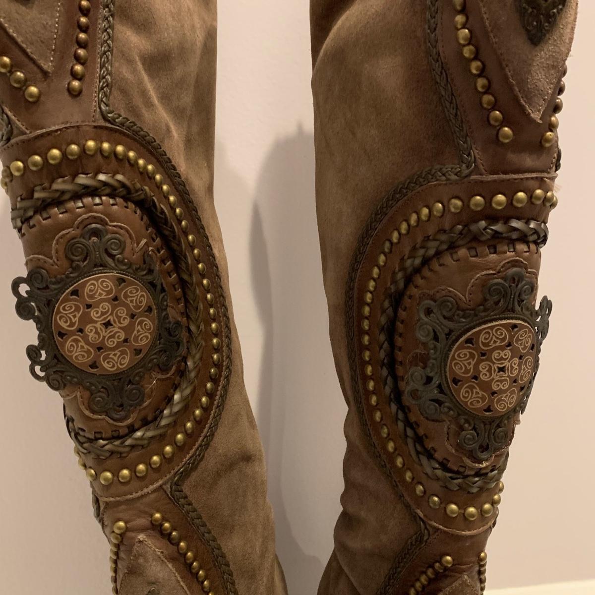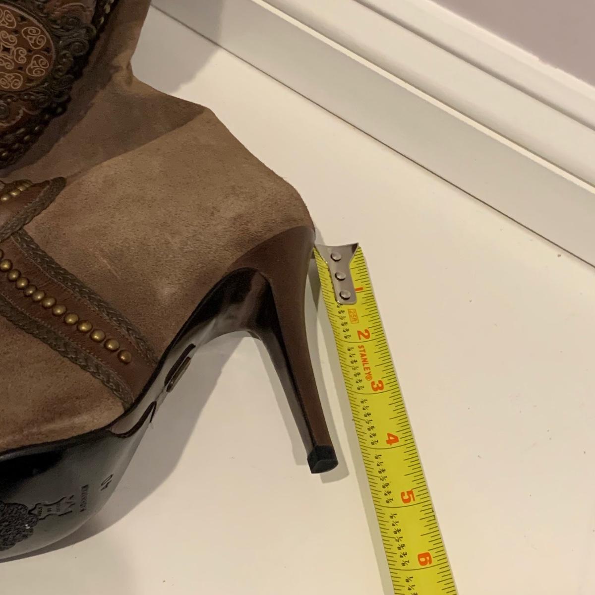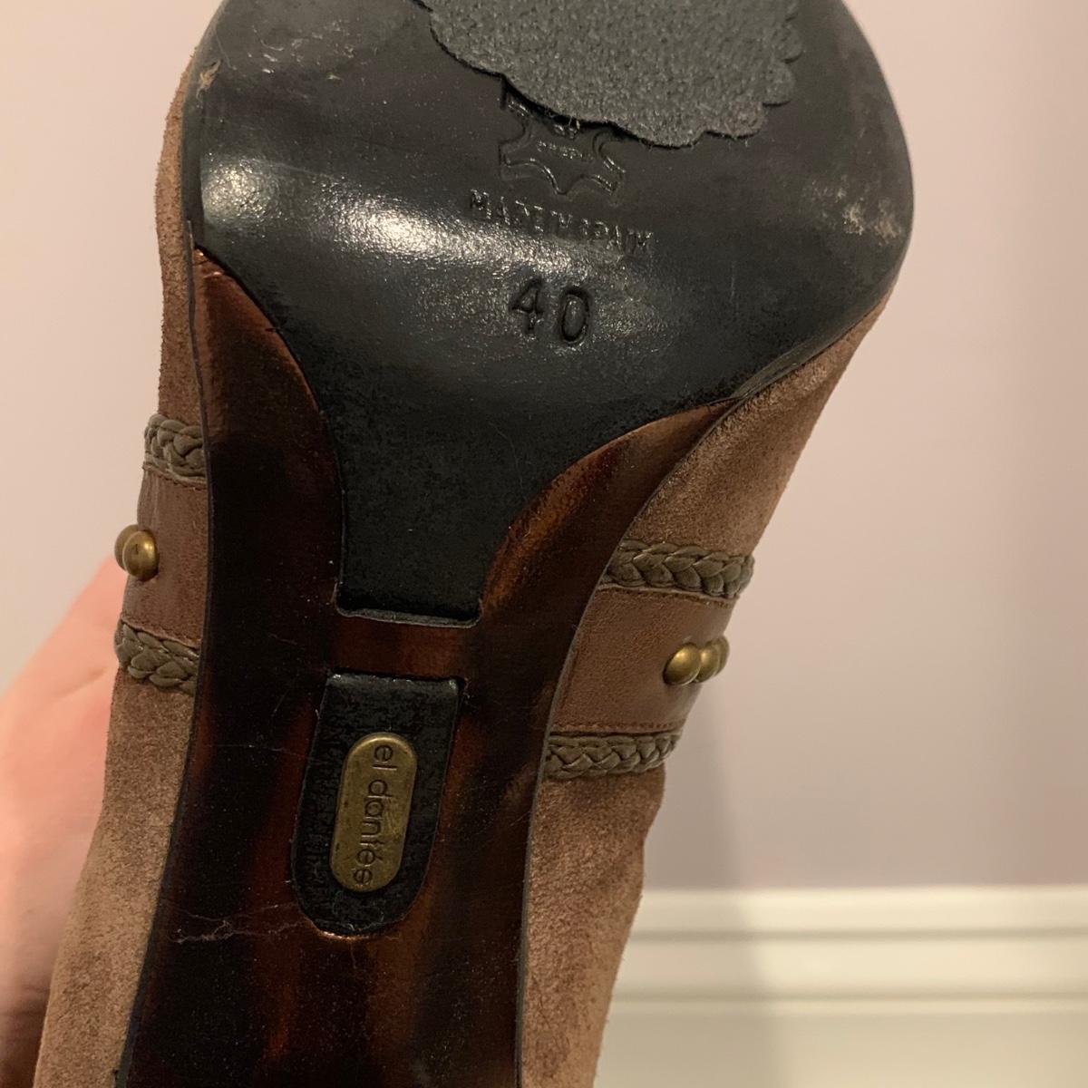 A gorgeous pair of brown leather and suede stiletto boots by El Dantés with stud embellishments. Boots zip up the back. They appear to be very gently worn, if at all as the soles are very new like looking. Stiletto heels are about 4”. Boots themselves are 19”H.