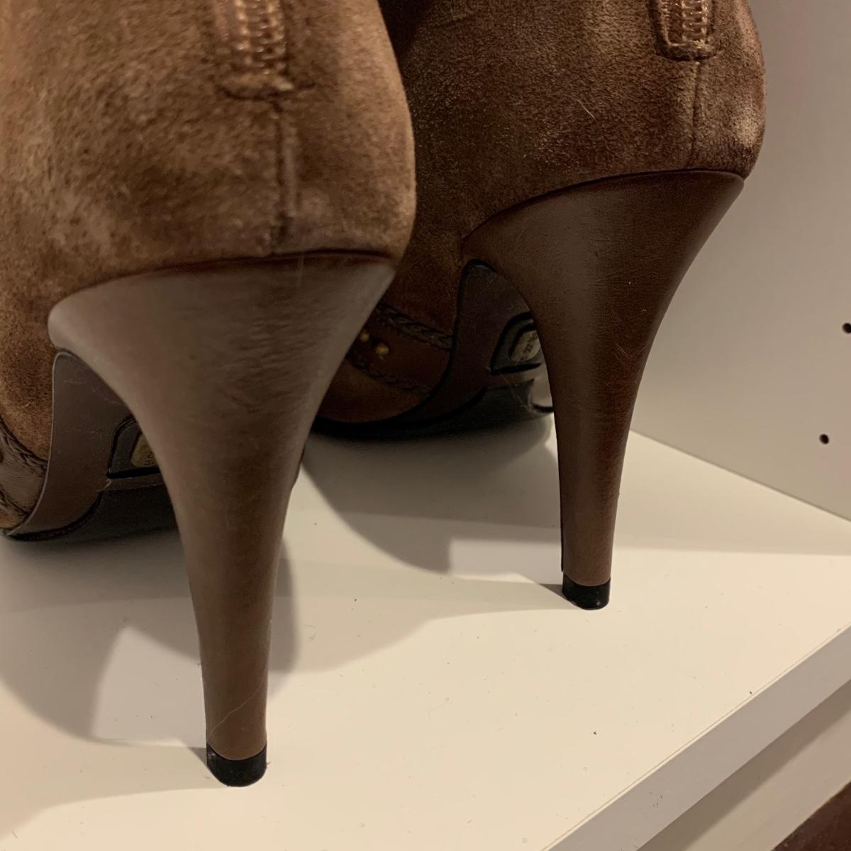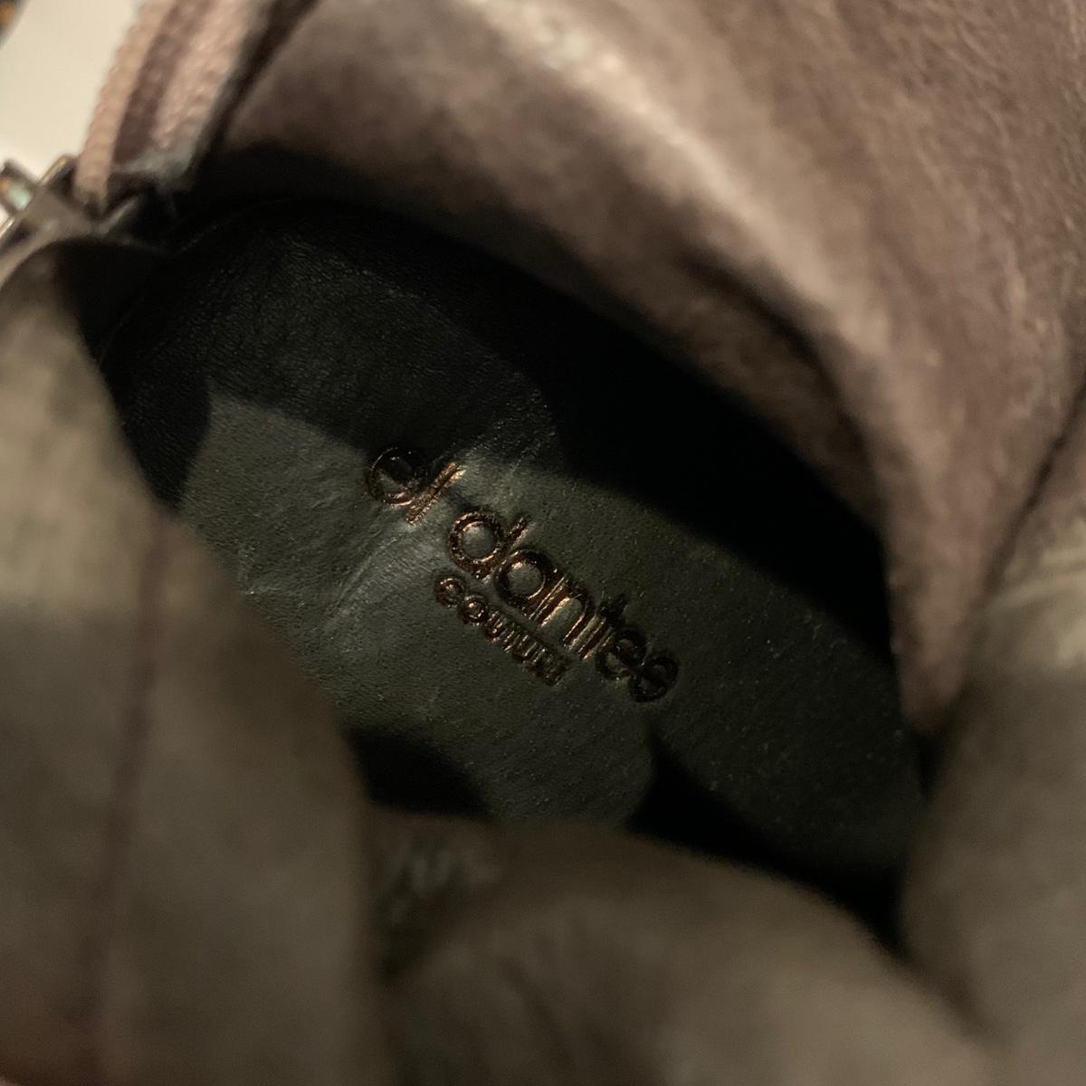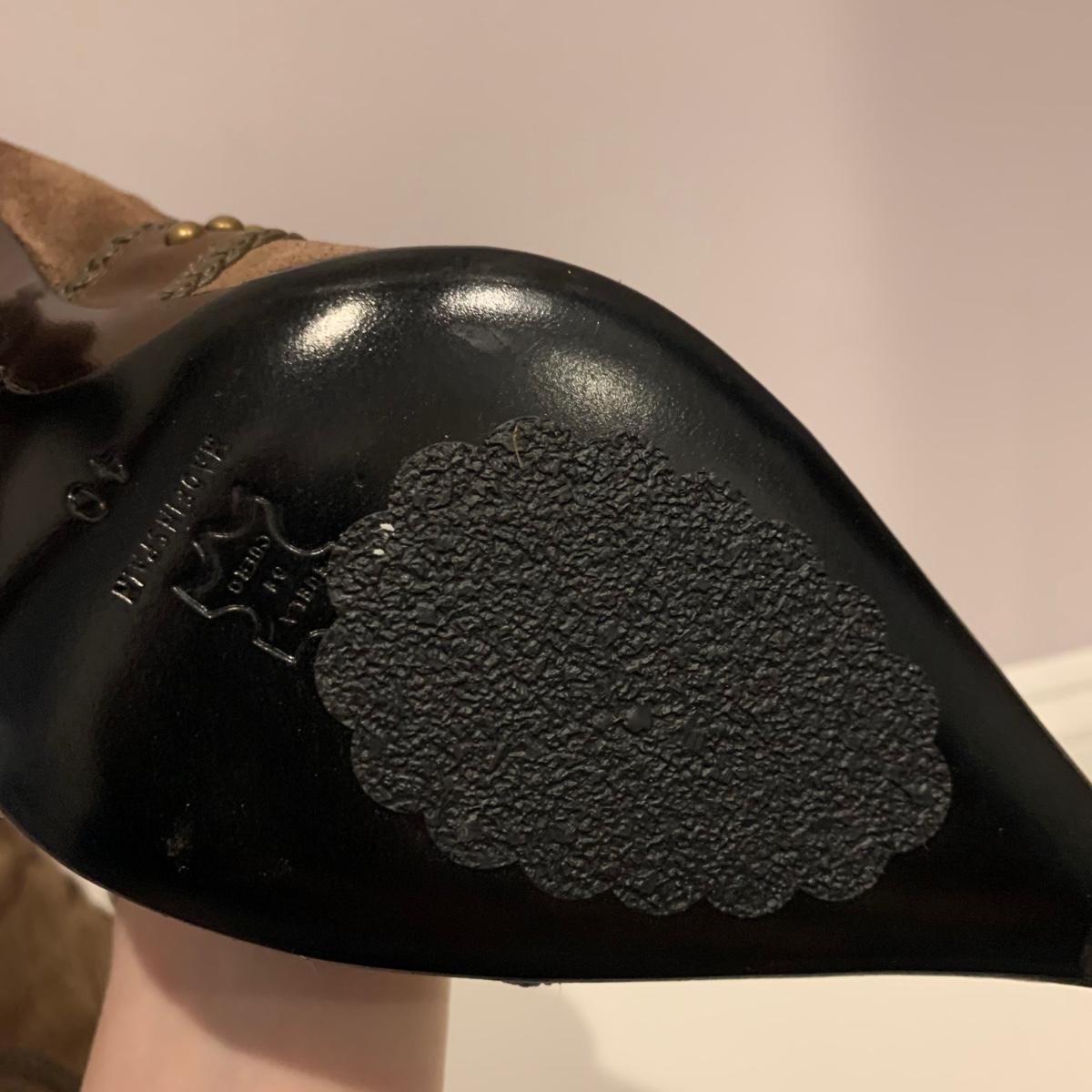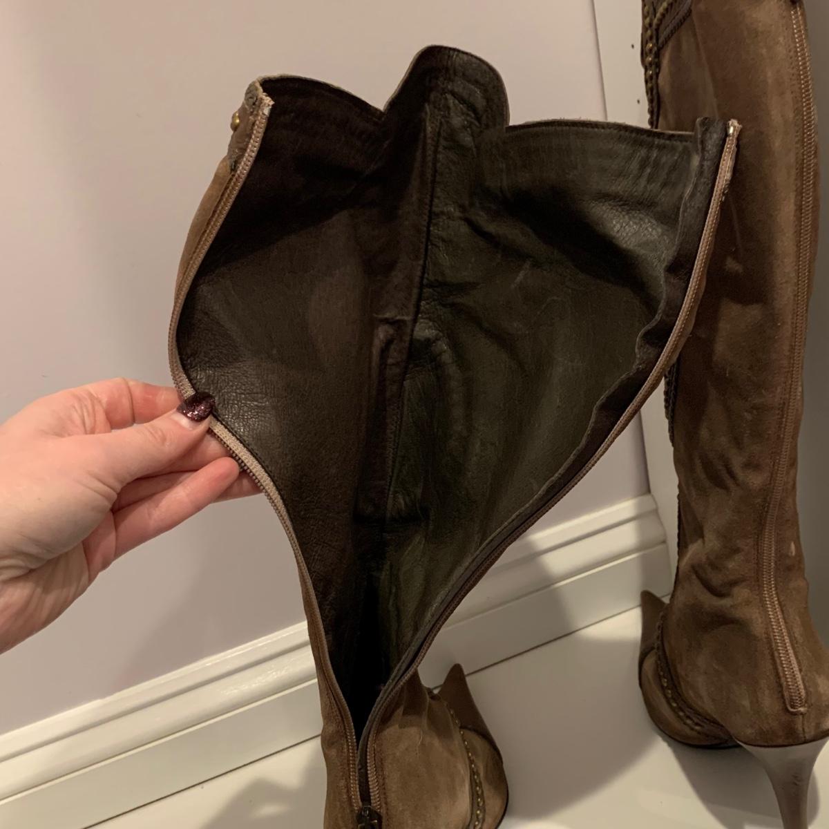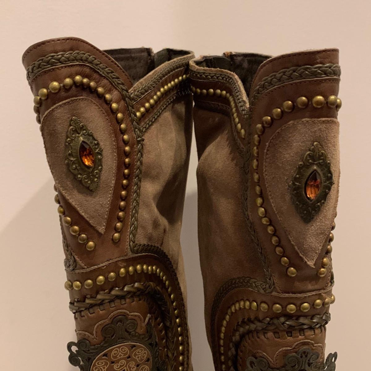 A gorgeous pair of brown leather and suede stiletto boots by El Dantés with stud embellishments. Boots zip up the back. They appear to be very gently worn, if at all as the soles are very new like looking. Stiletto heels are about 4”. Boots themselves are 19”H.