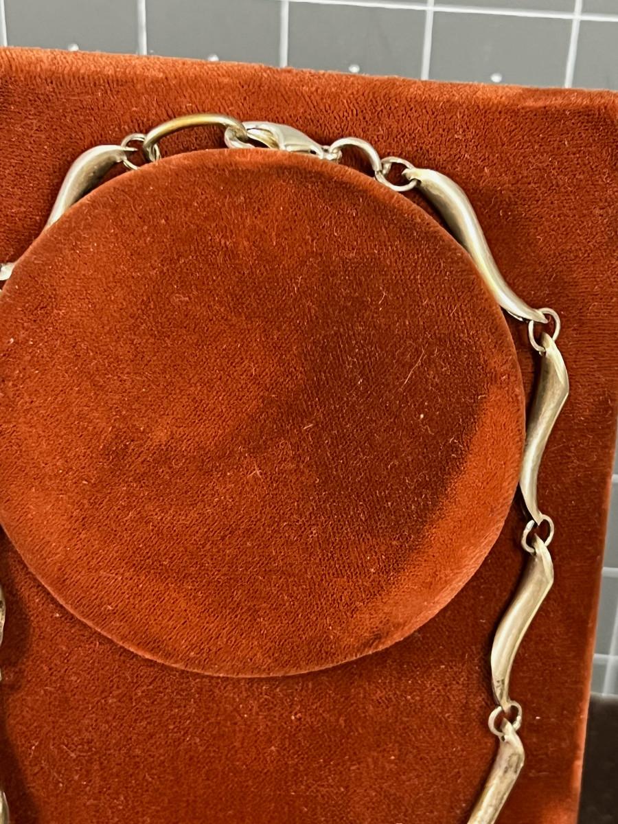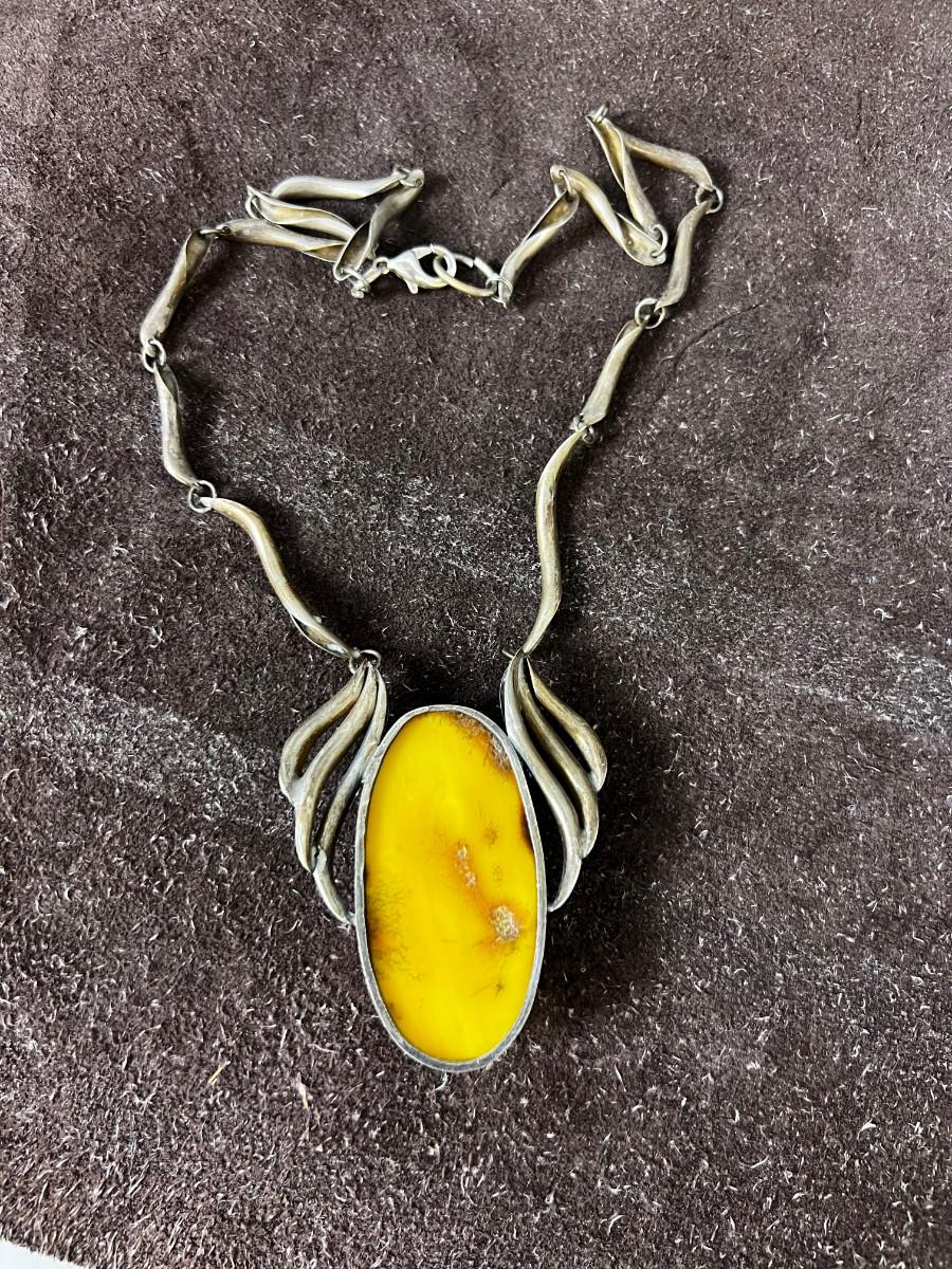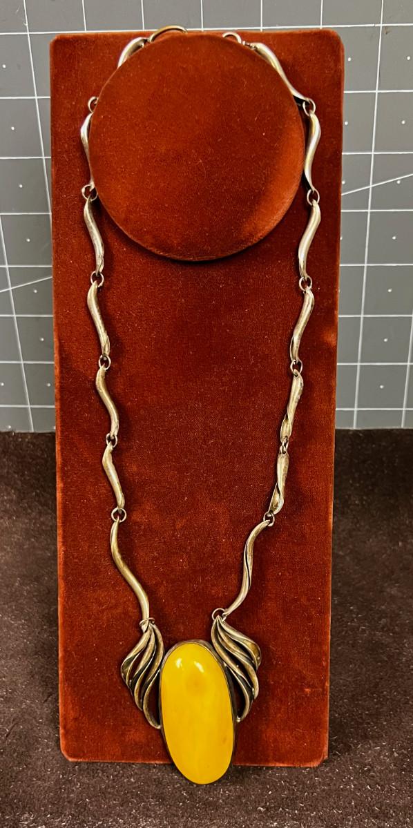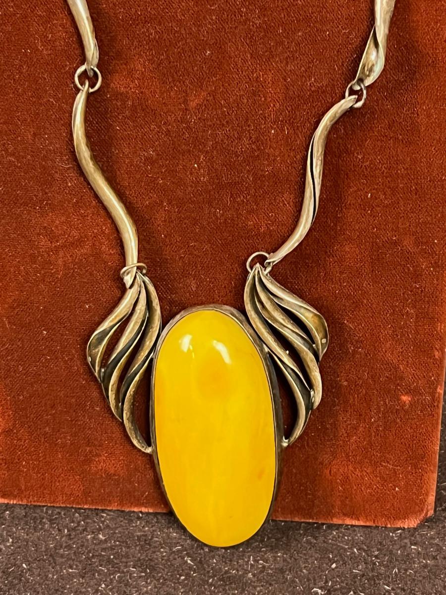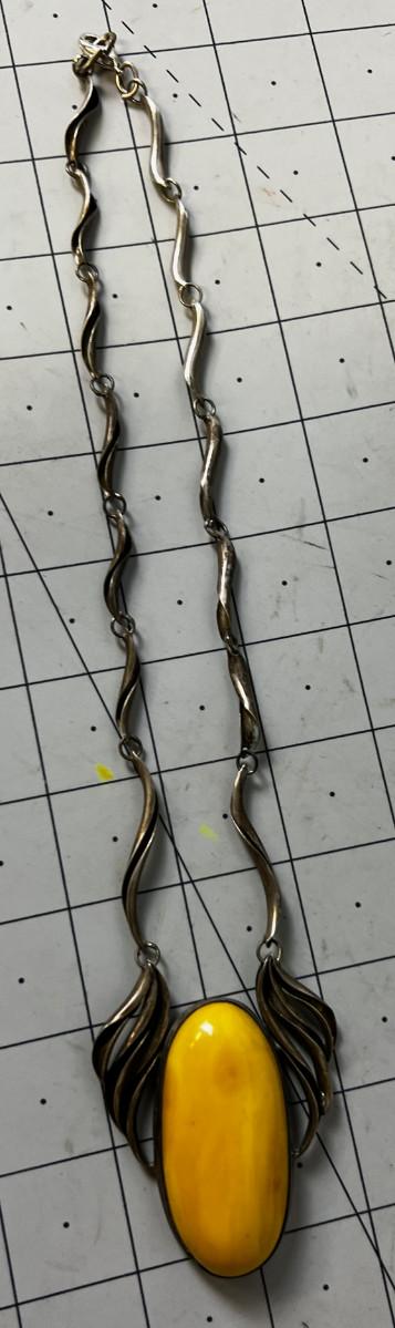 Elaborate Art Nouveau Like Design, Mustard Colored Plastic Oval Necklace Set in Silver Toned