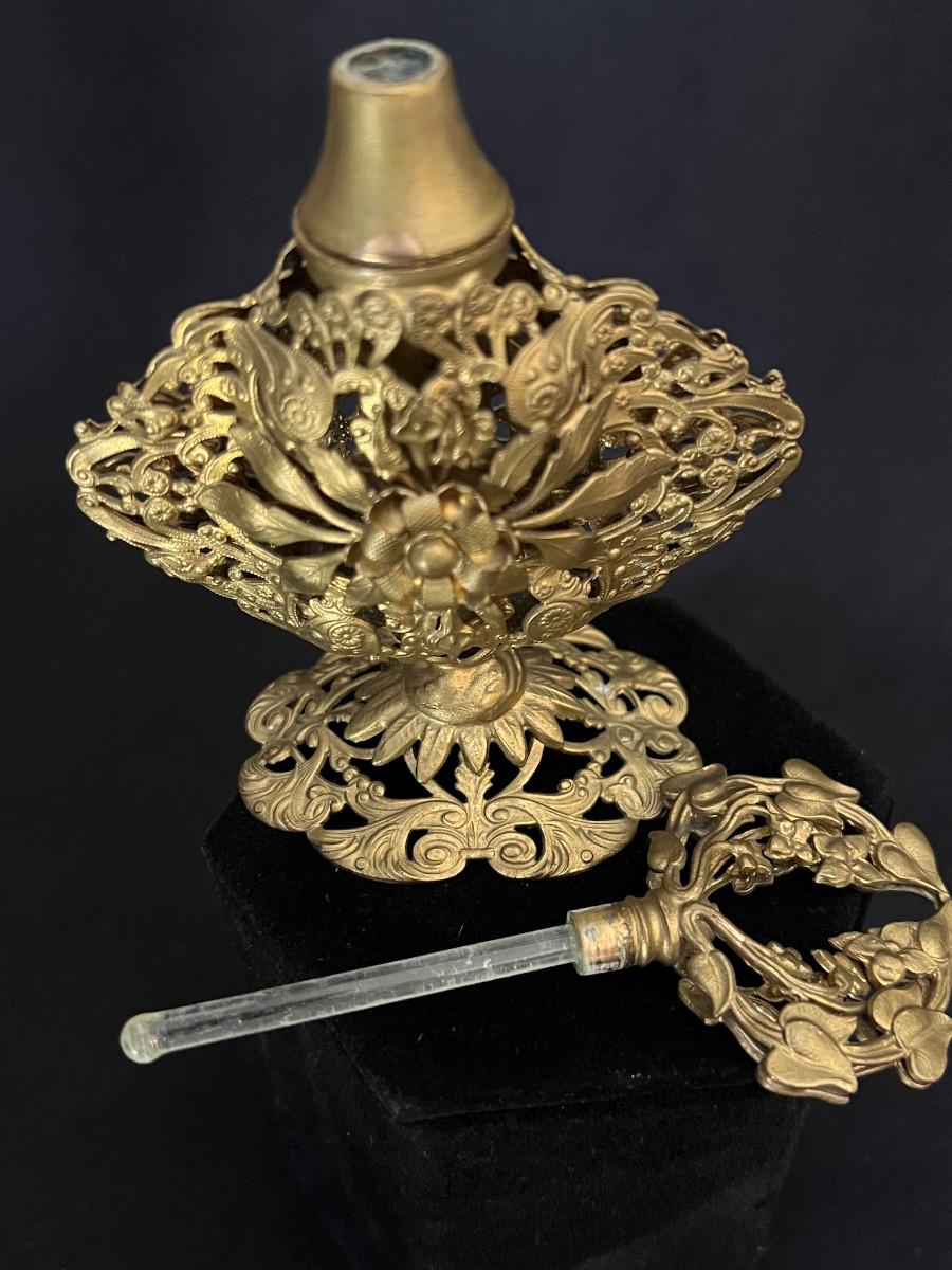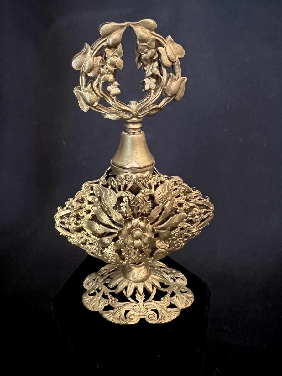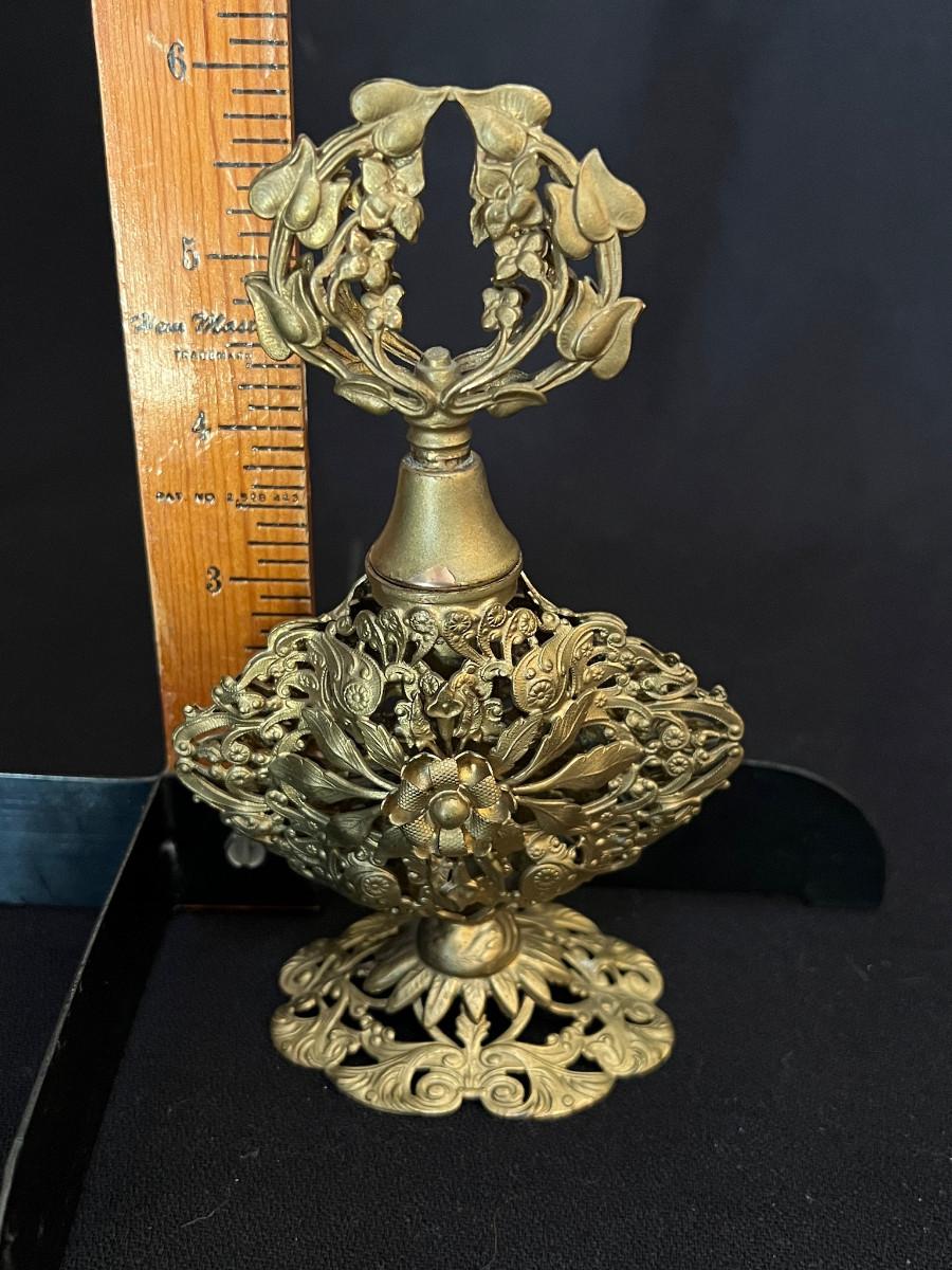 Elaborate Vintage Filigree Brass Framed Perfume Bottle