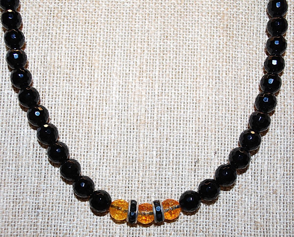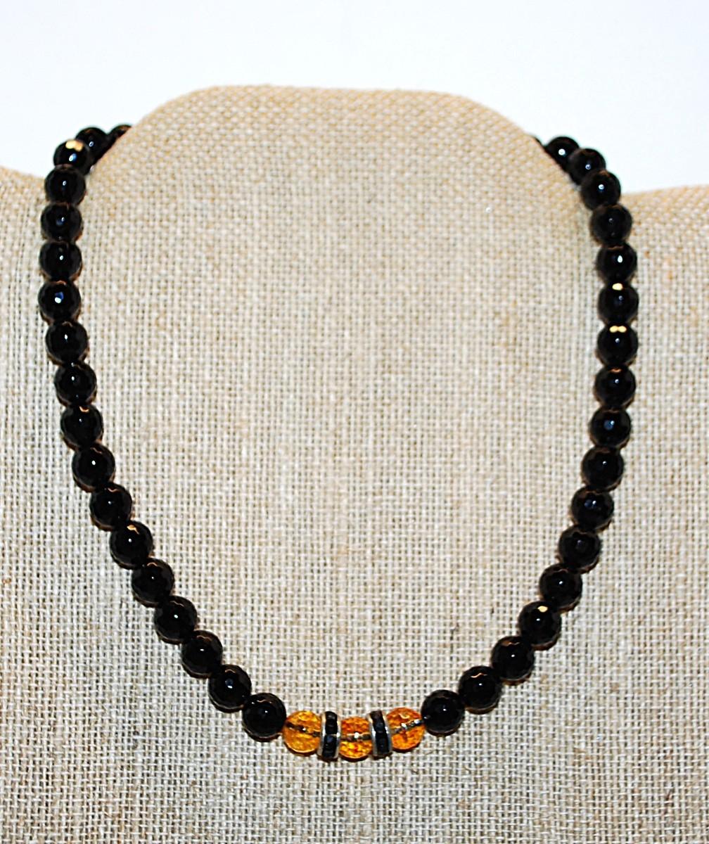 ELASTIC Black Beveled Stone NECKLACE with Triple Amber Colored Stone Accents 14"-16" L