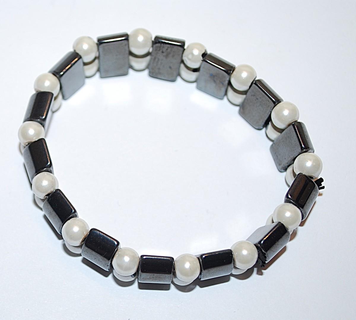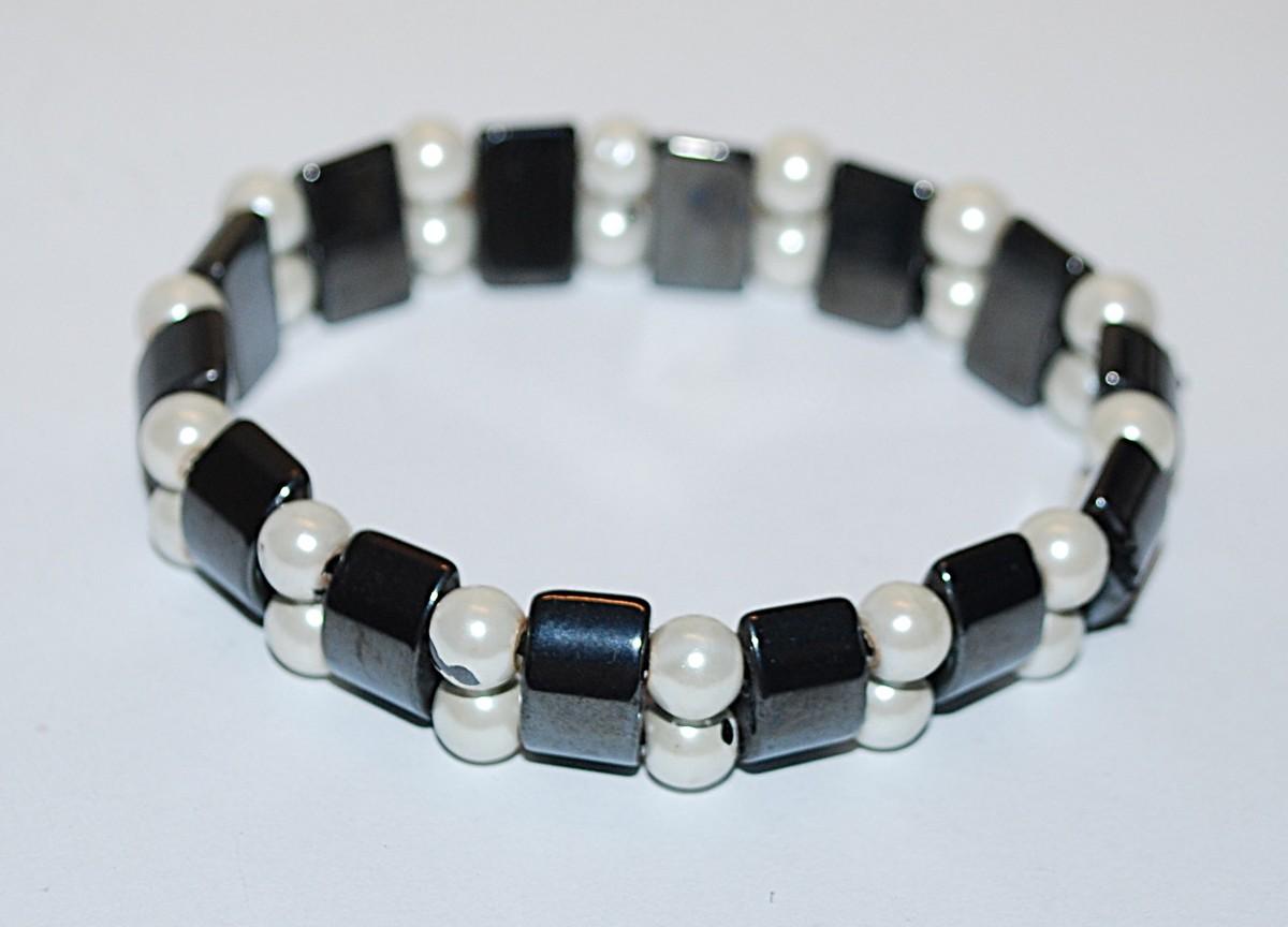 Elastic Pearl-Style Beads BRACELET (2" Opening) with Black Half-Globe Accents