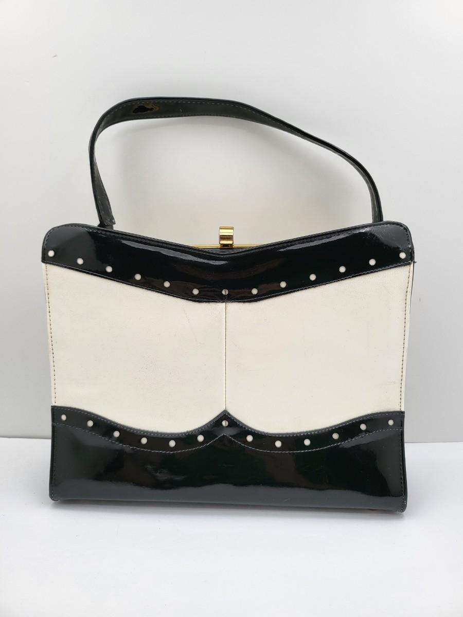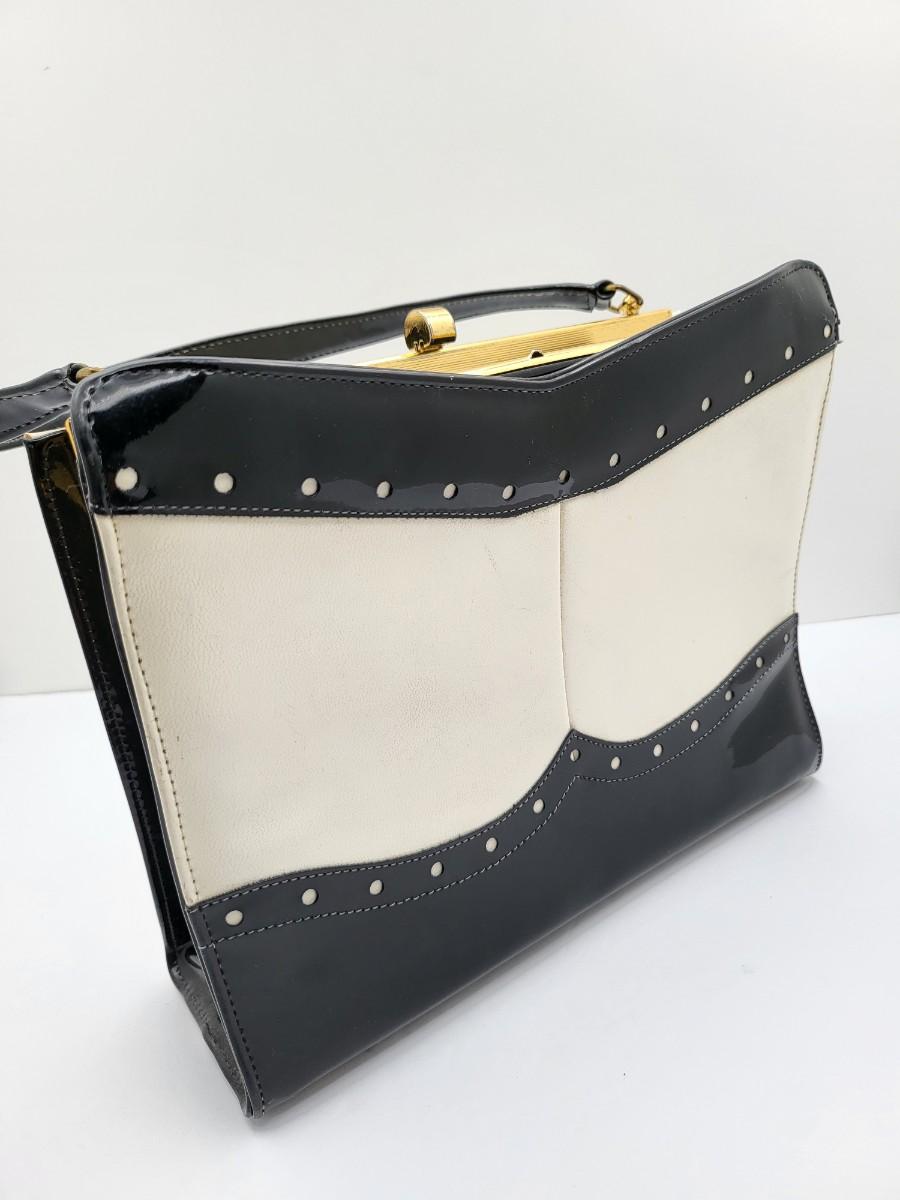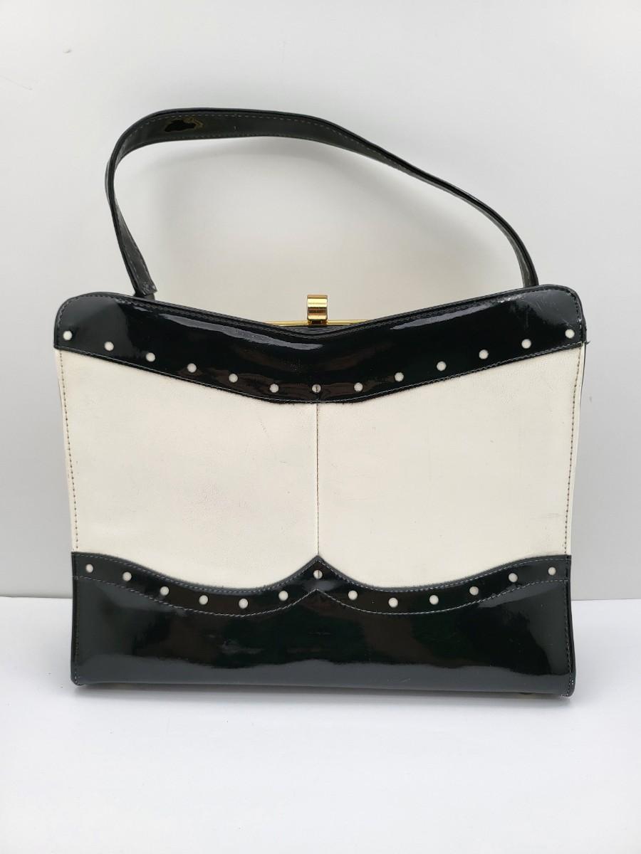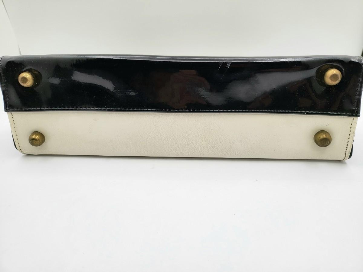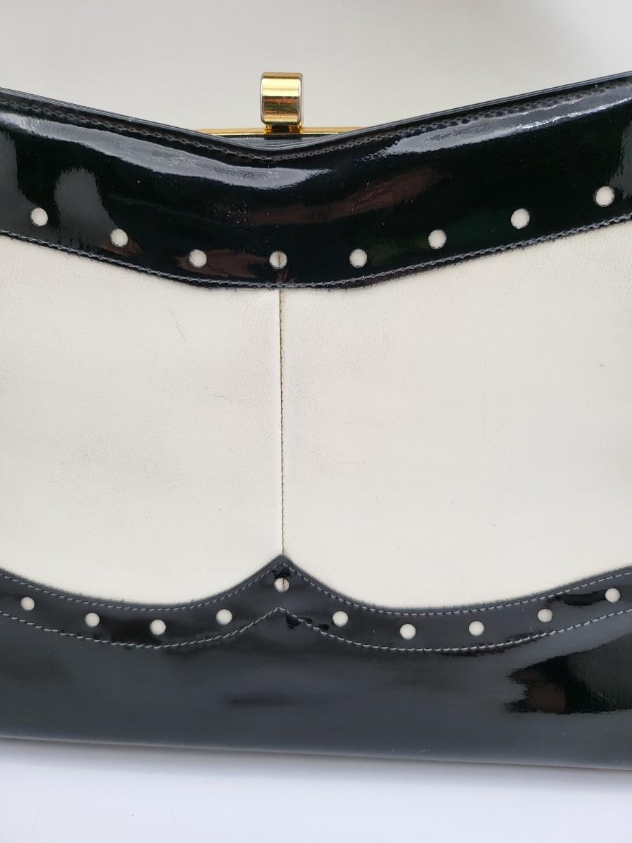 Elbief England vintage purse. Front is black patent trim with white and reverse is all white. Hand strap length is about 4.5". Gold tone hardware. Measures 10" long x 7.5" tall x 3" deep.