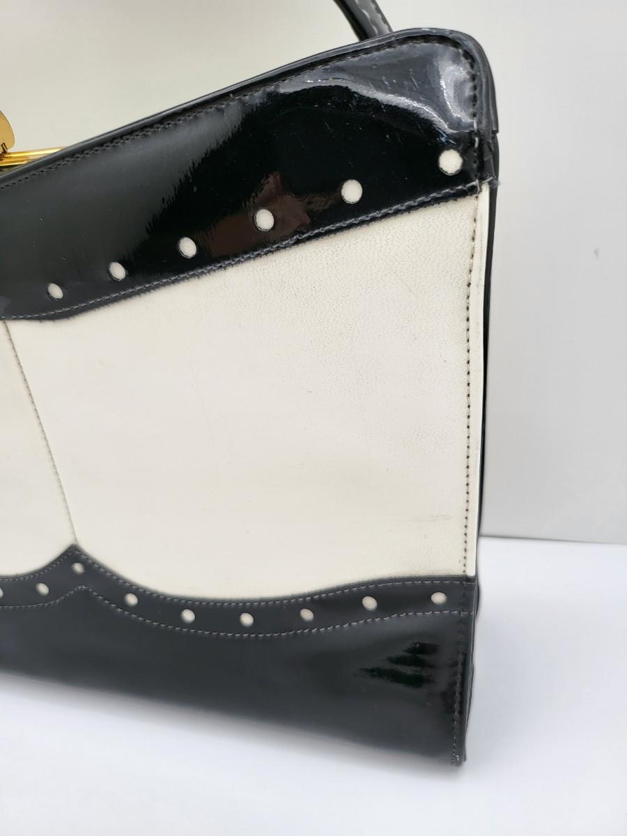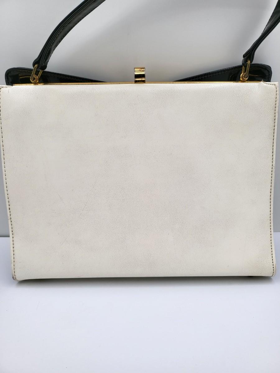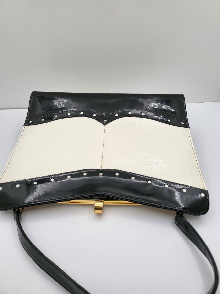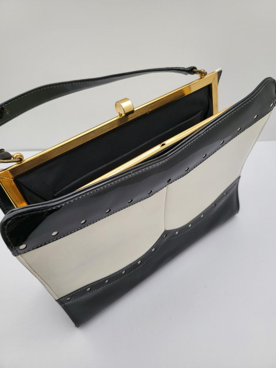 Elbief England vintage purse. Front is black patent trim with white and reverse is all white. Hand strap length is about 4.5". Gold tone hardware. Measures 10" long x 7.5" tall x 3" deep.