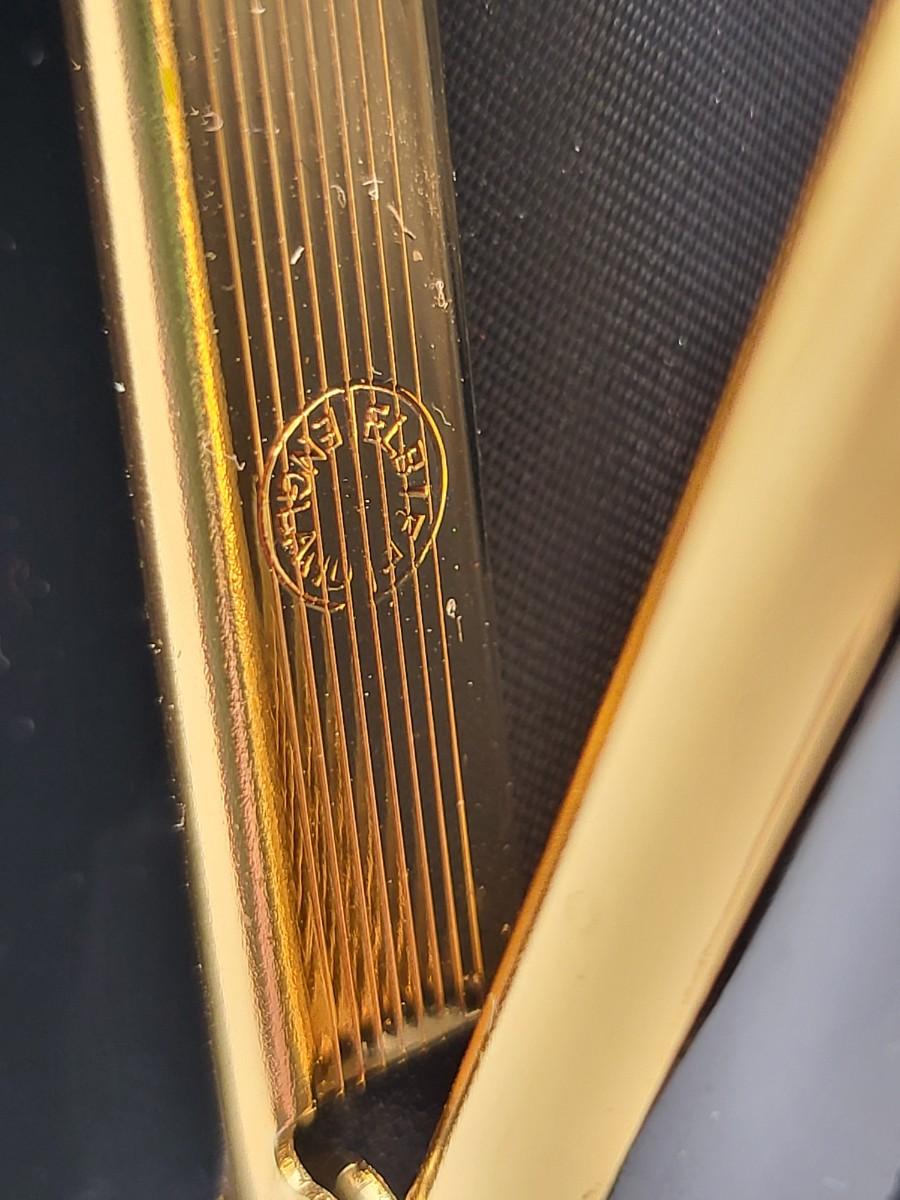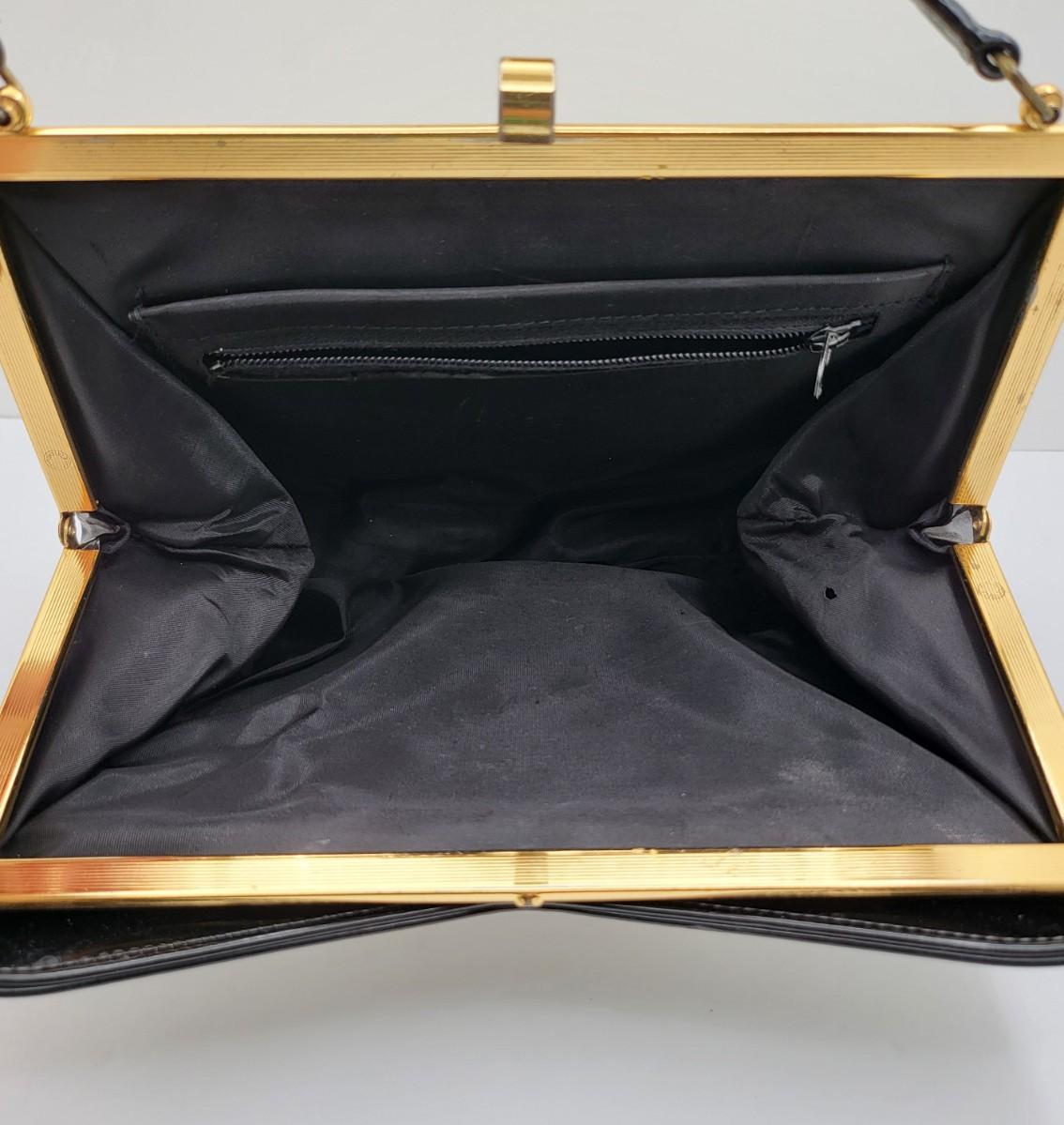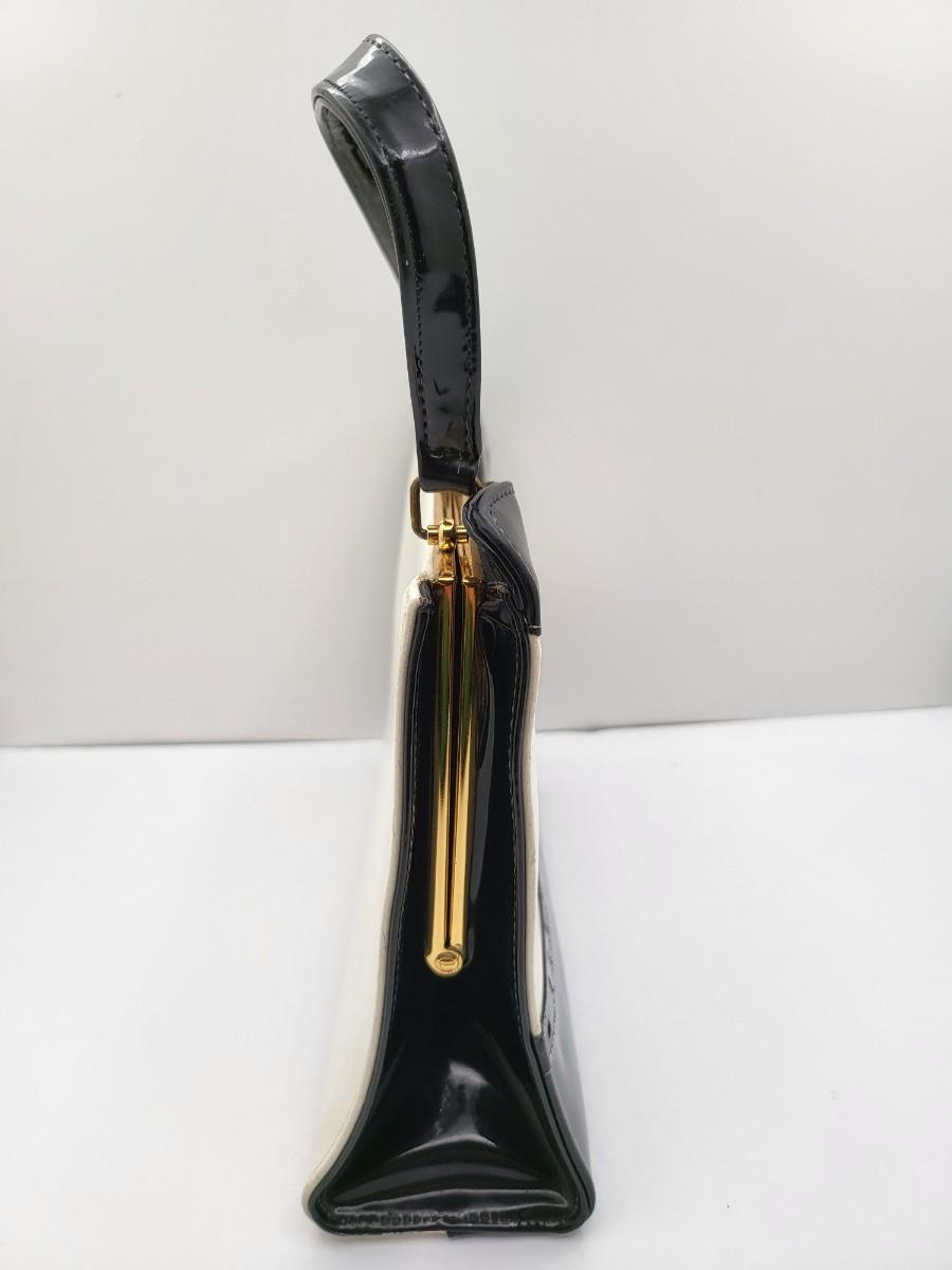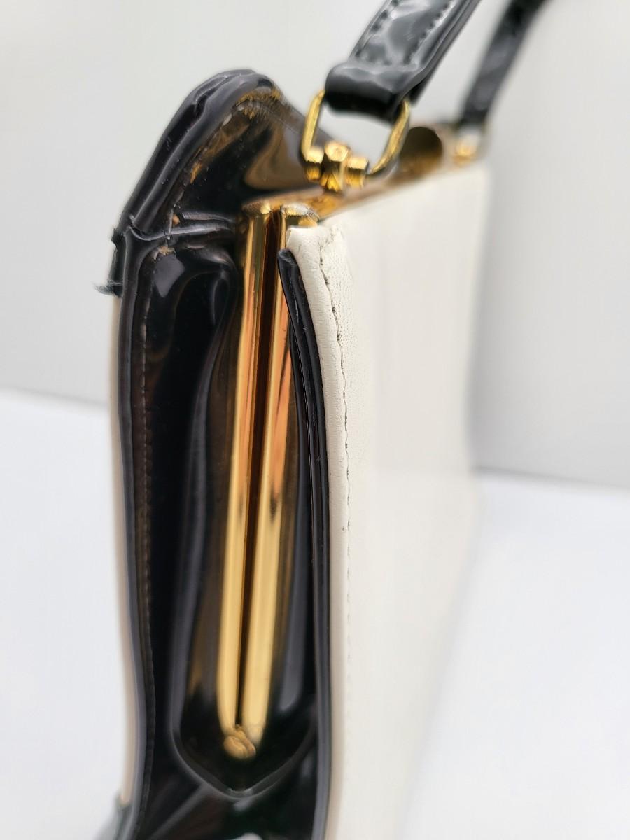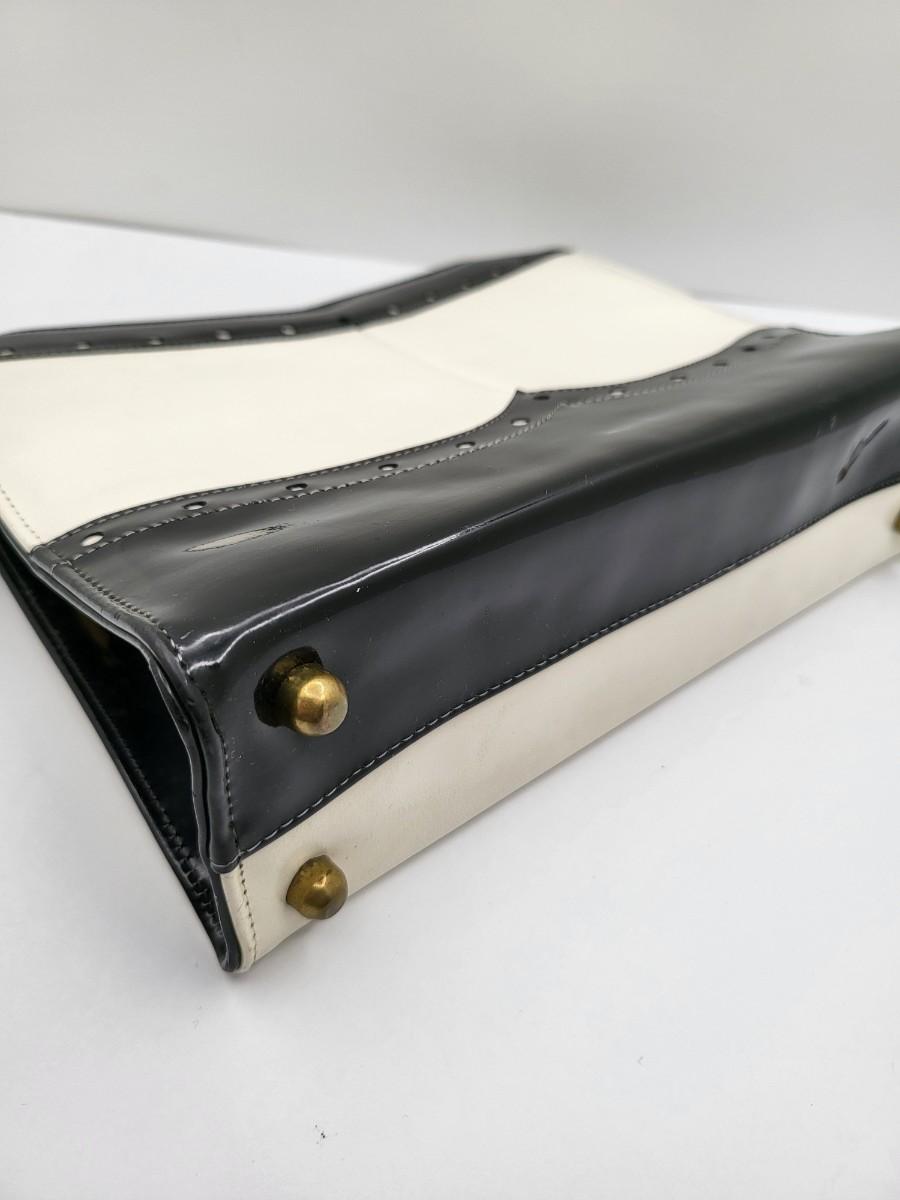 Elbief England vintage purse. Front is black patent trim with white and reverse is all white. Hand strap length is about 4.5". Gold tone hardware. Measures 10" long x 7.5" tall x 3" deep.