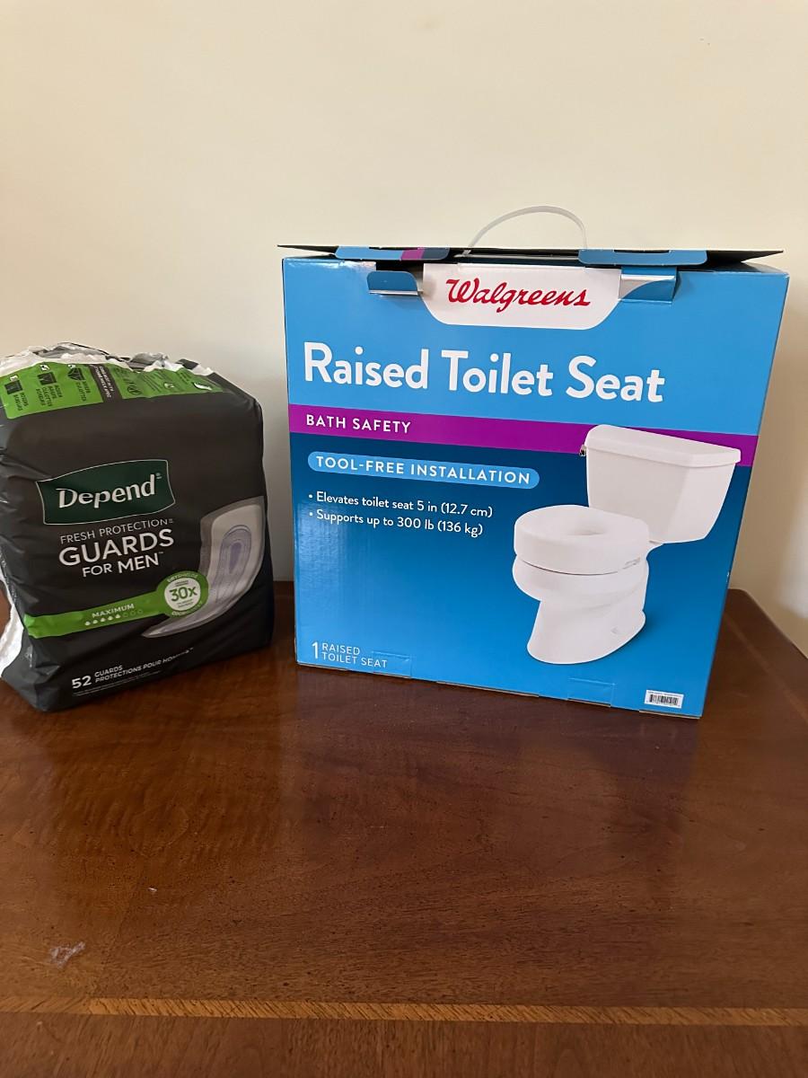 Elder Care Items- Standalone Toilet, Walker, Raised Toilet Seat, Depends