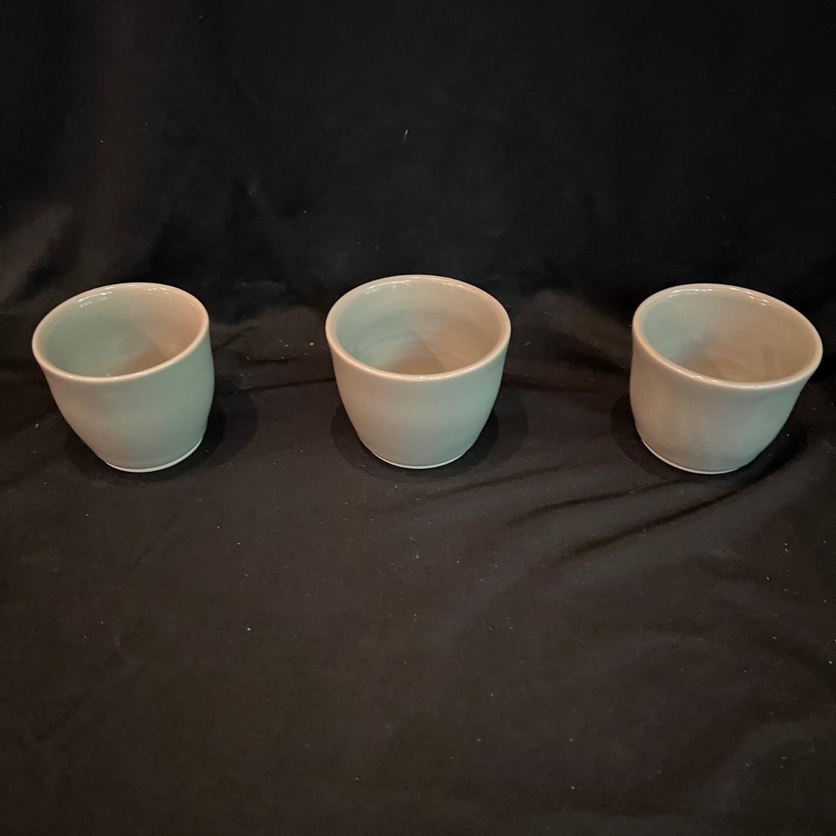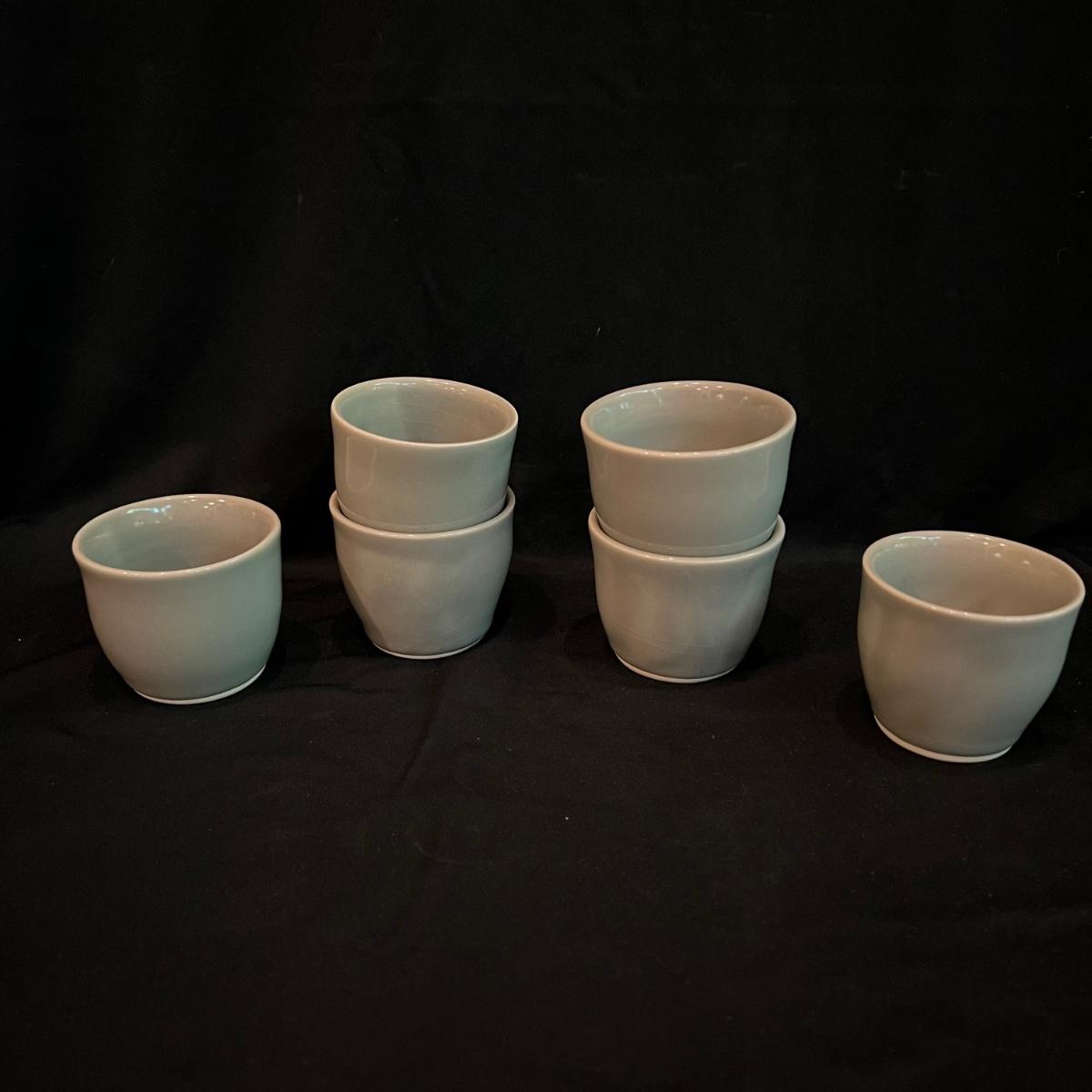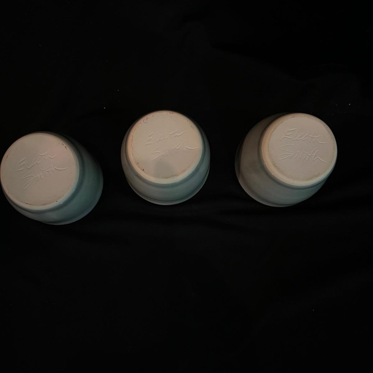 Signed Electa Smith pottery cups. Six green handleless cups each measuring 3” round and 2.5” H.