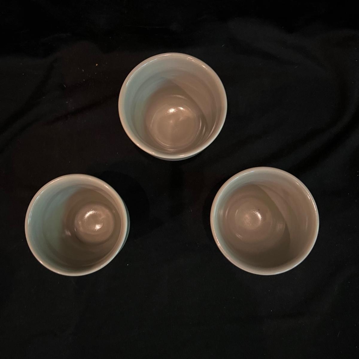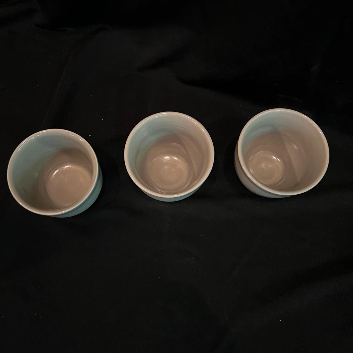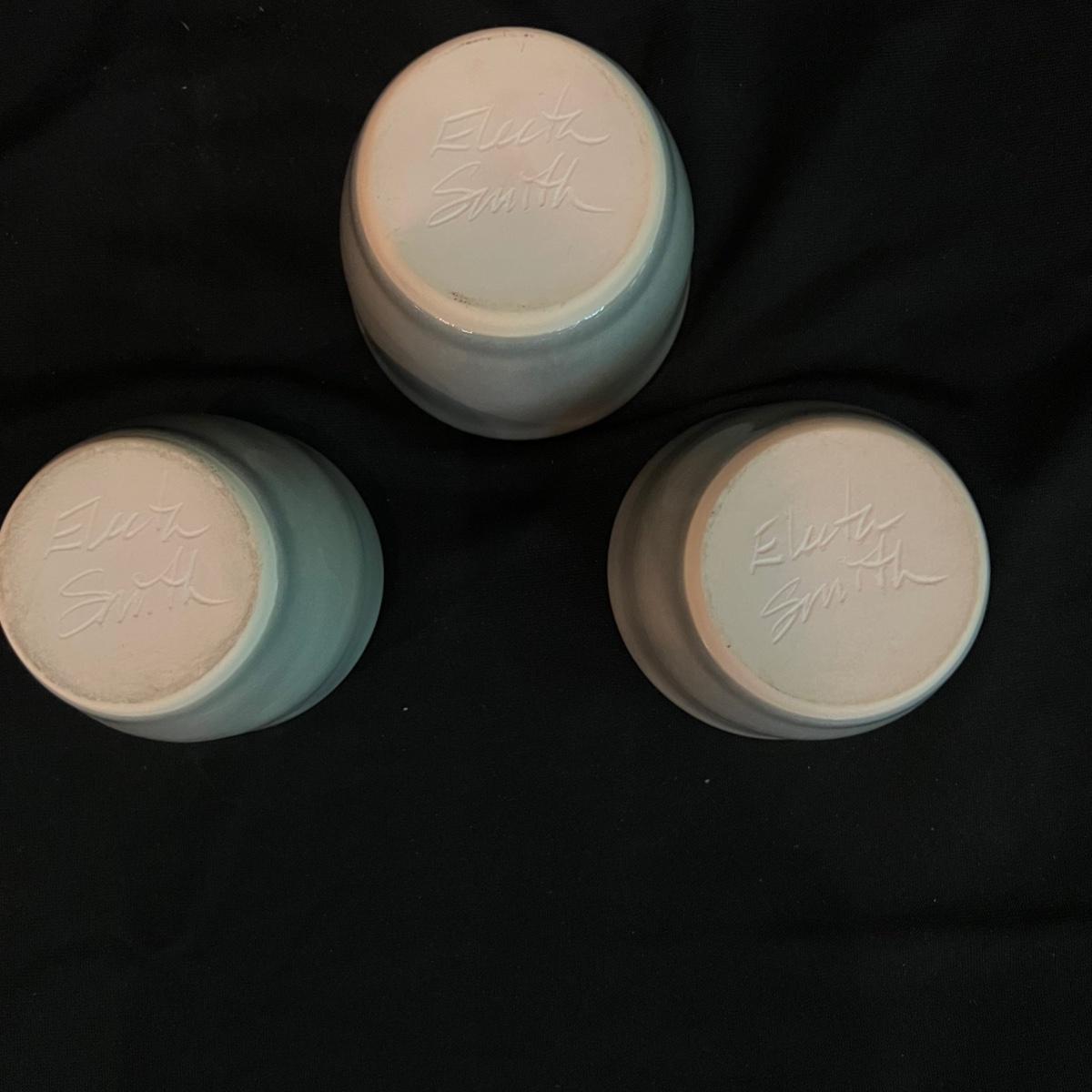 Signed Electa Smith pottery cups. Six green handleless cups each measuring 3” round and 2.5” H.