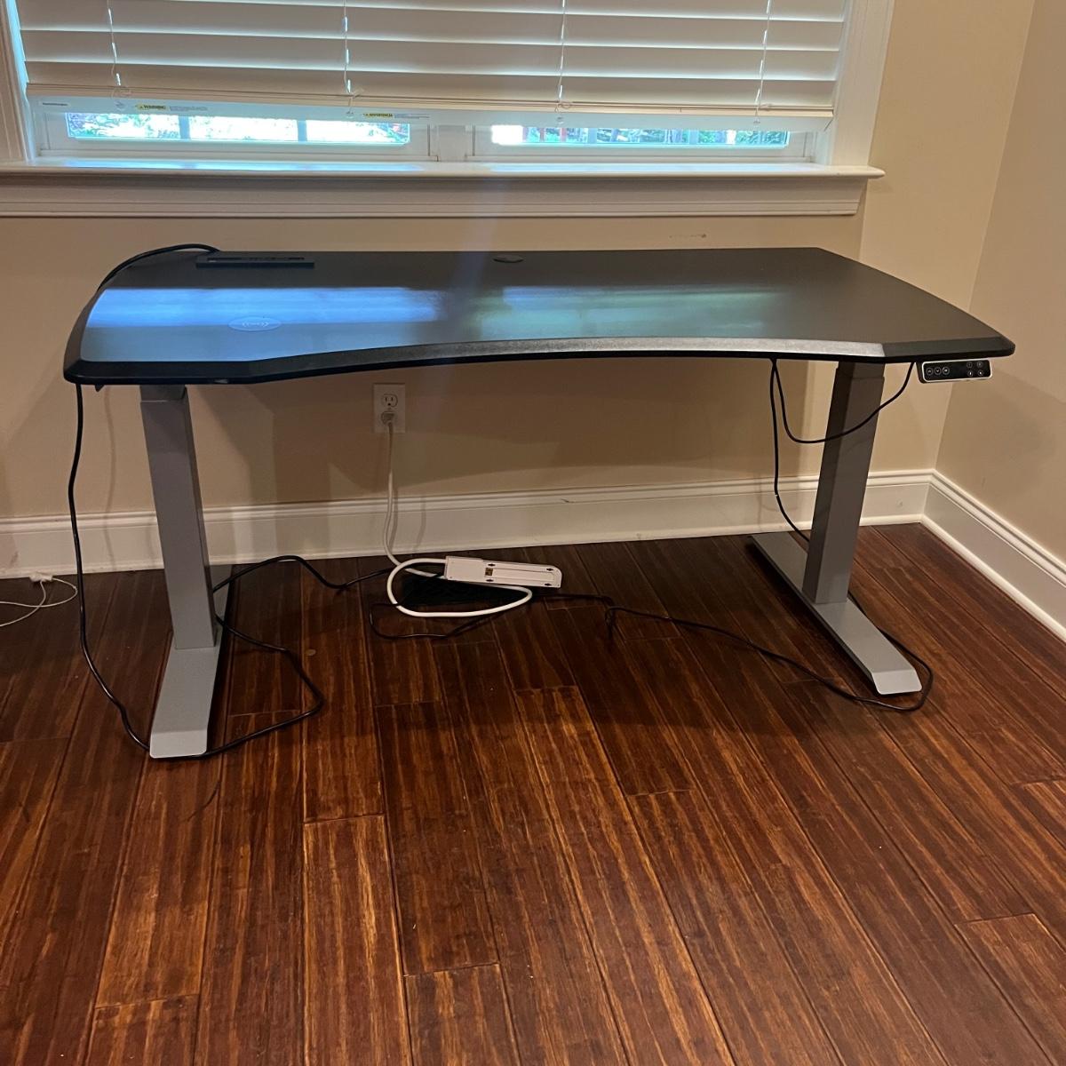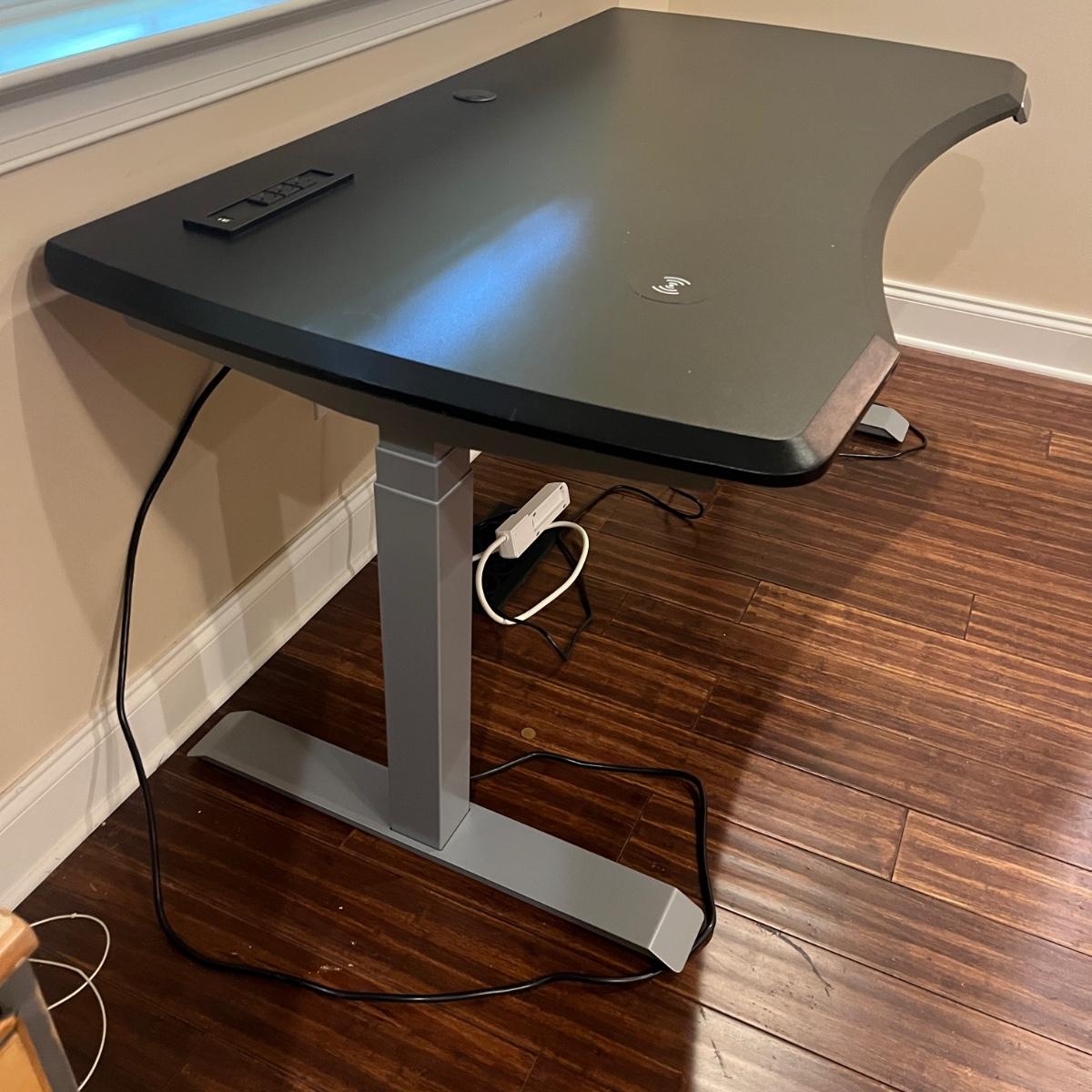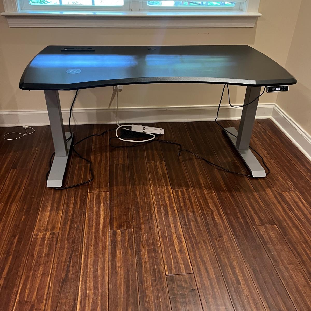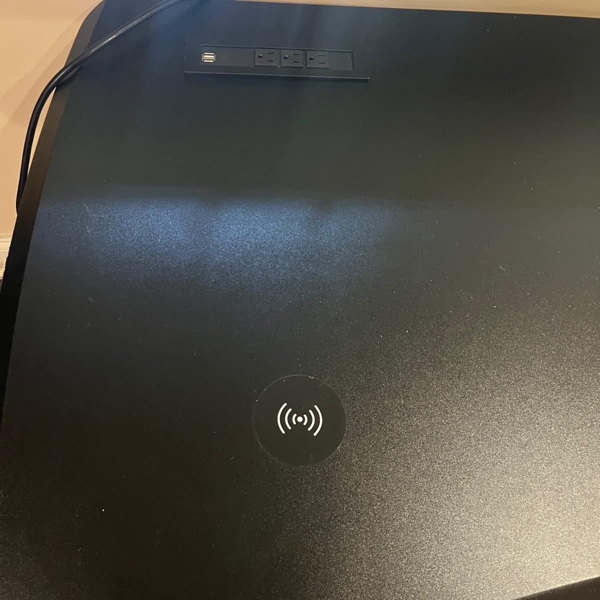 This Loctek electric adjustable height standing desk has a wireless charger and USB lugs with three electric plugs. Desk measures 60” x 31” with a 26”- 50” adjustable height.