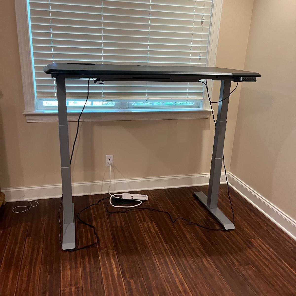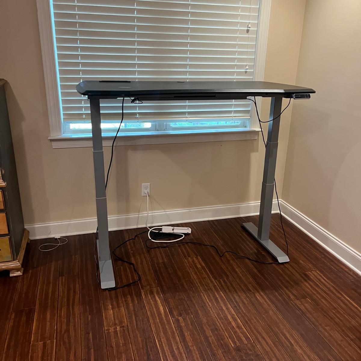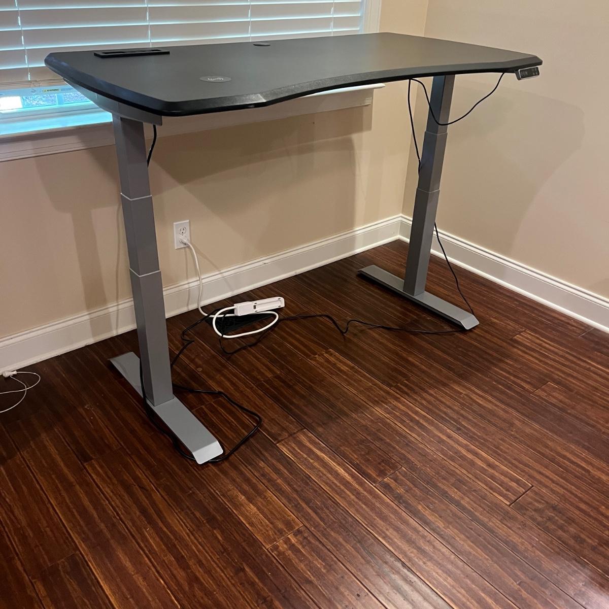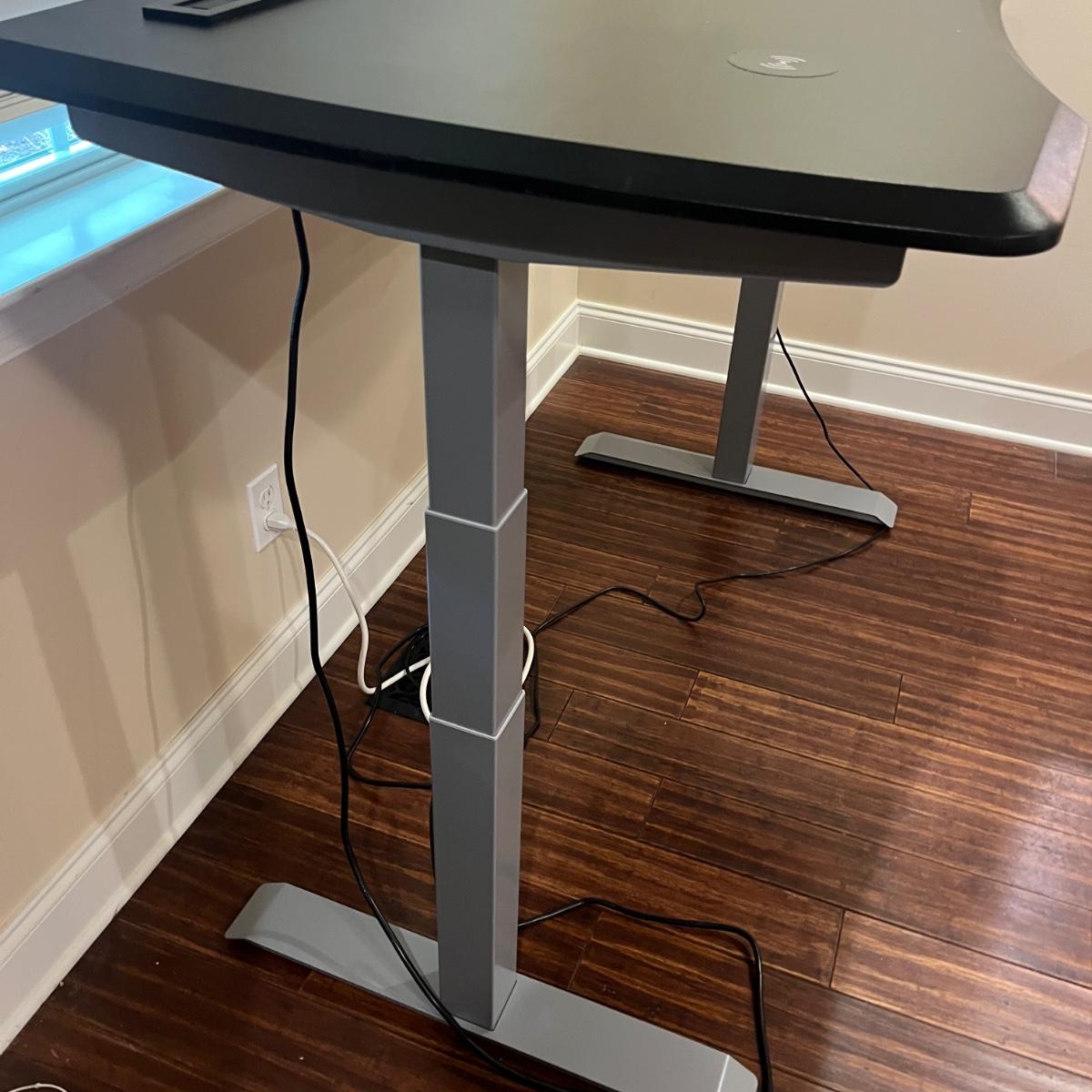 This Loctek electric adjustable height standing desk has a wireless charger and USB lugs with three electric plugs. Desk measures 60” x 31” with a 26”- 50” adjustable height.