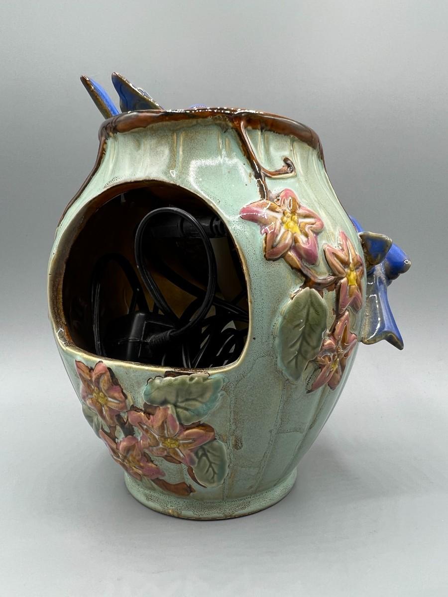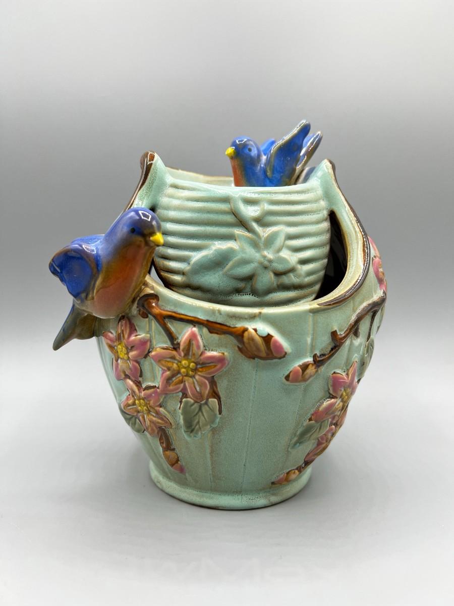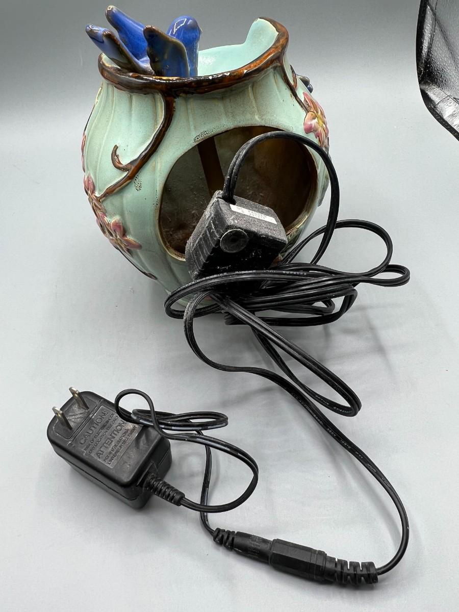 . Ceramic table sitting waterfall decor piece. Features two bluebirds sitting in a birdbath. Water would flow from top and down front. The motor turns on when plugged in but has not been tested with water. About 7" size.