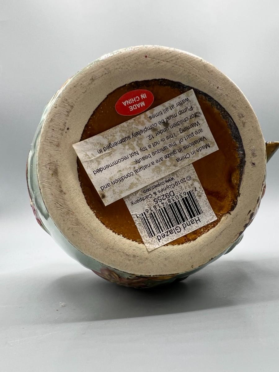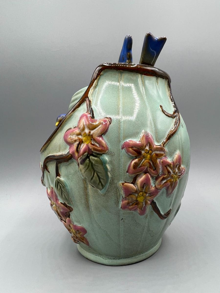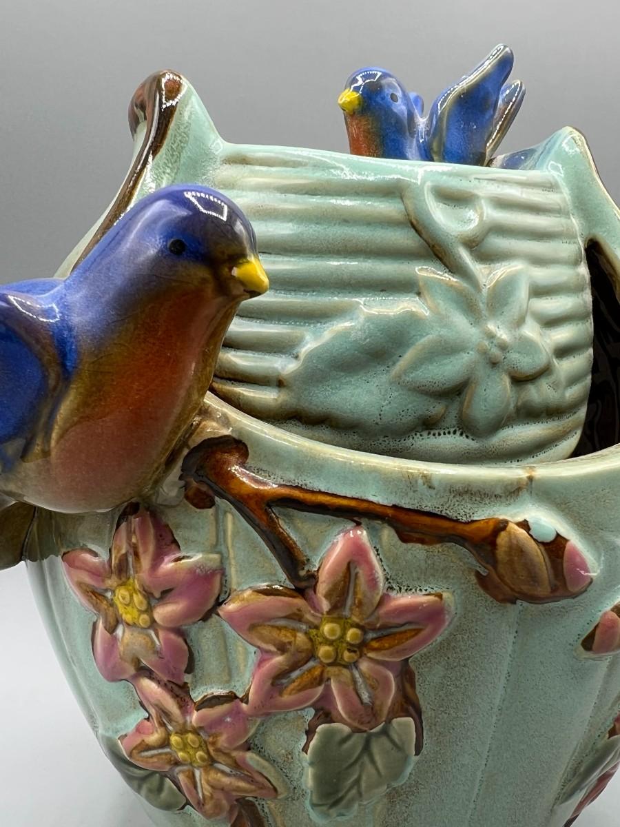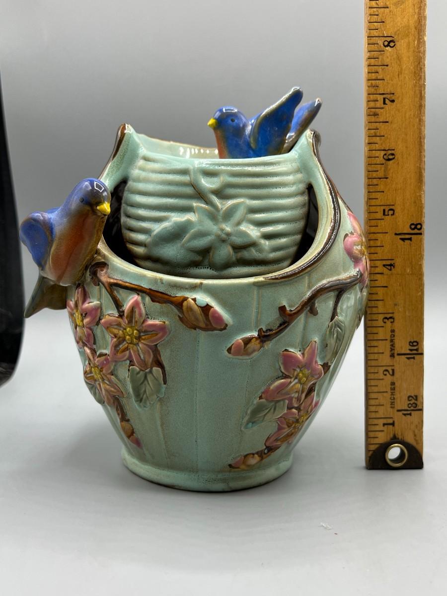 . Ceramic table sitting waterfall decor piece. Features two bluebirds sitting in a birdbath. Water would flow from top and down front. The motor turns on when plugged in but has not been tested with water. About 7" size.