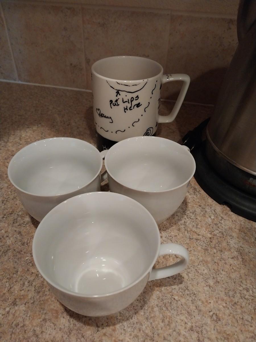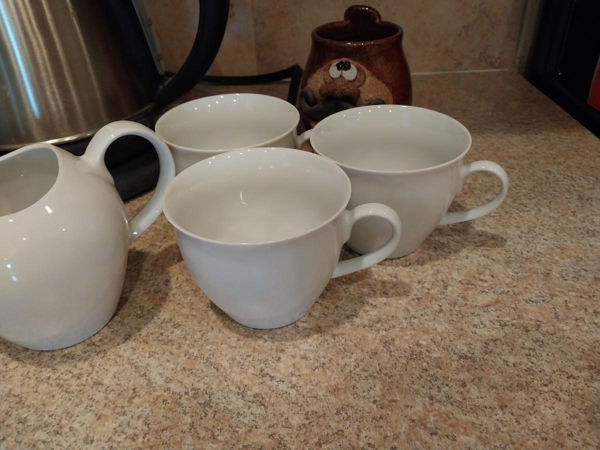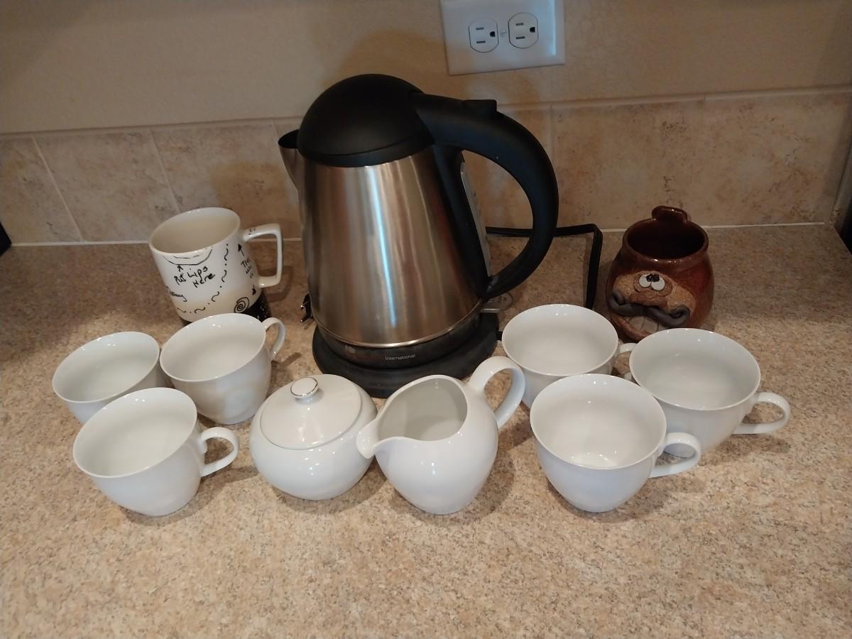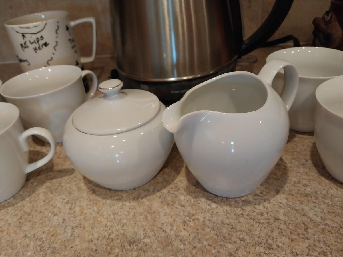 ELECTRIC COFFEE WARMER, WHITEHALL CUPS/SAUCERS/CREAM & SUGAR, STARBUCKS MUG