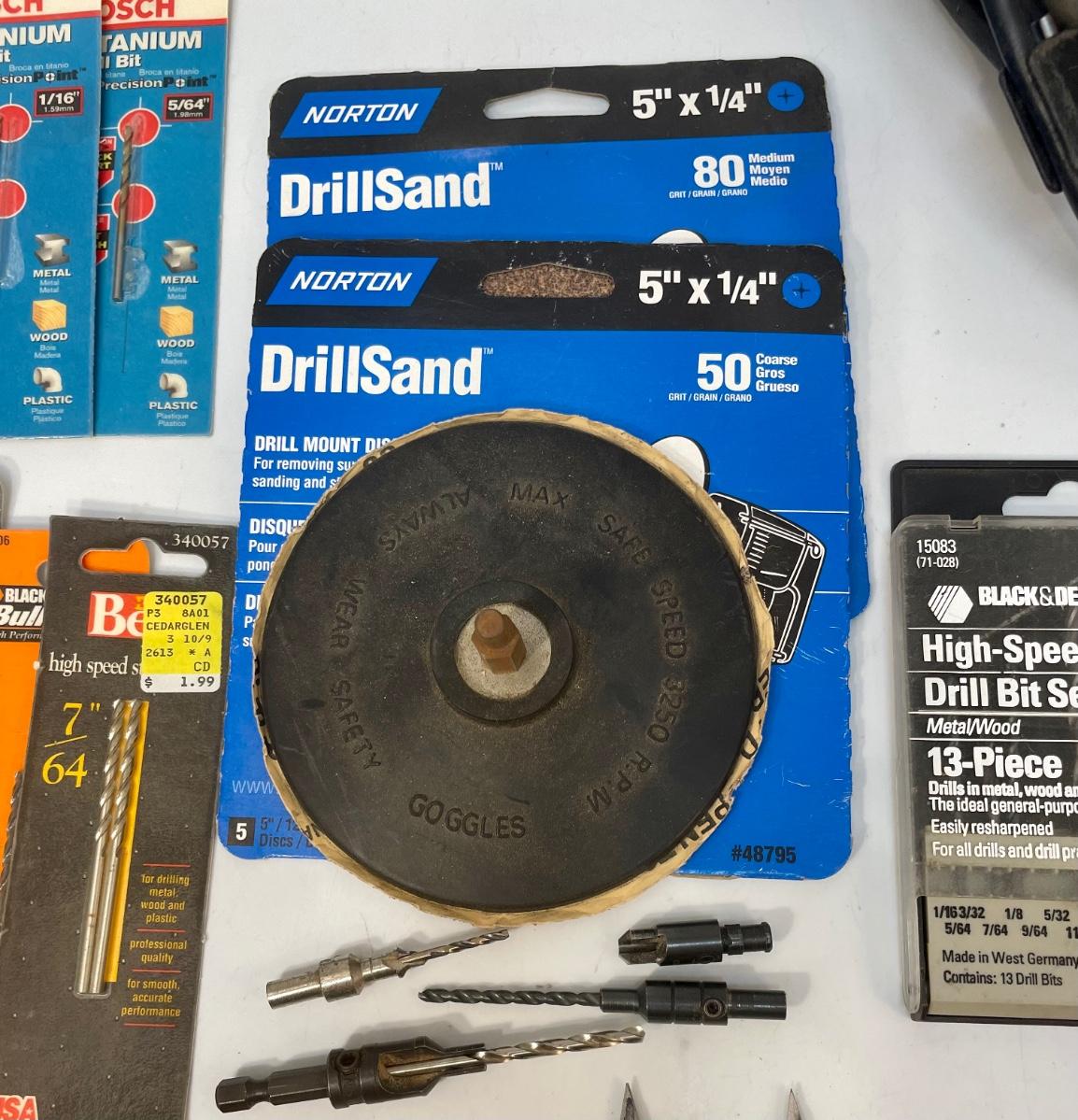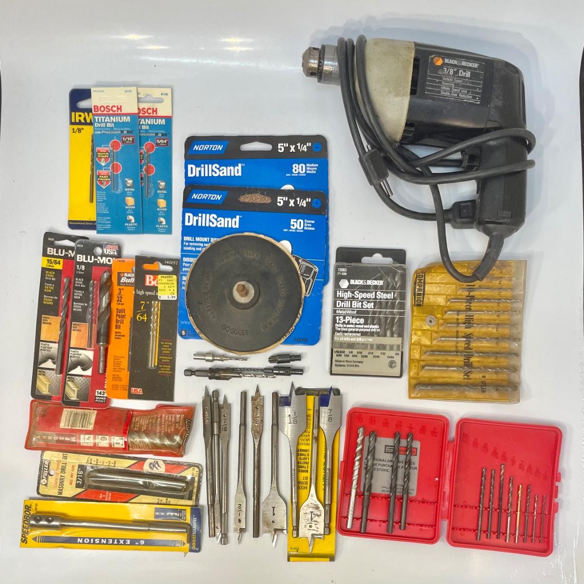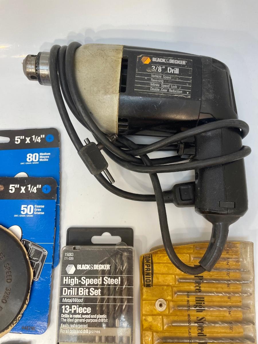 Black and Decker 3/8” variable speed Reversible drill, includes rubber sanding disc and sandpaper discs, 4 arbors, 9 wood boring bits, and 45 drill bits.