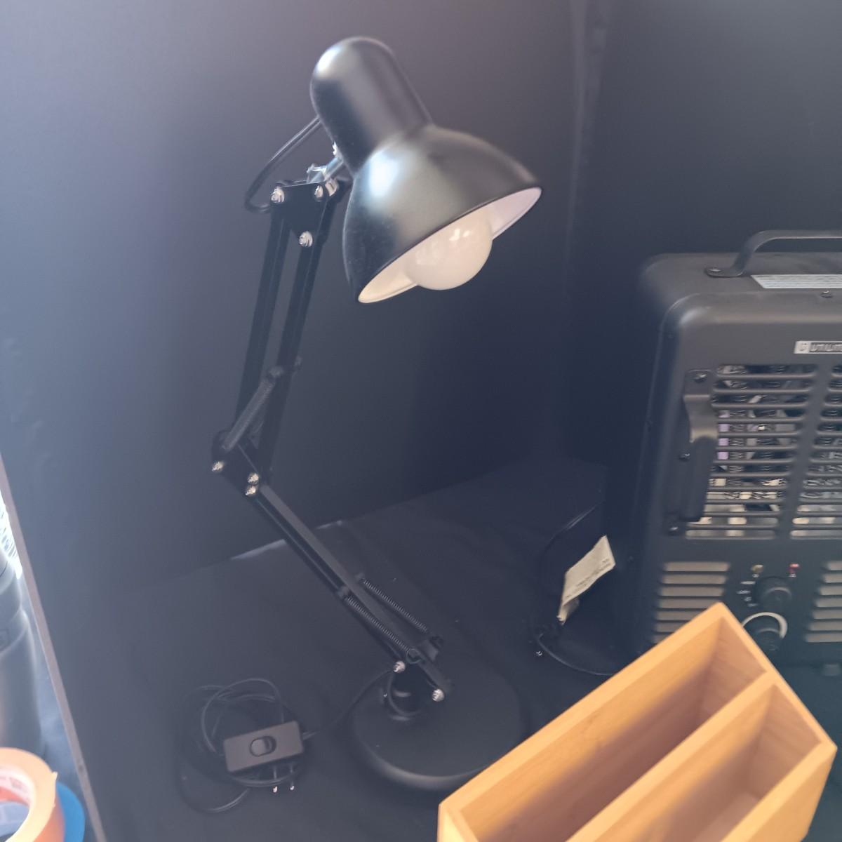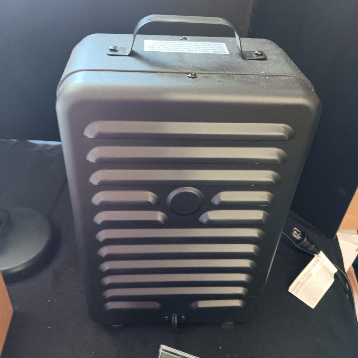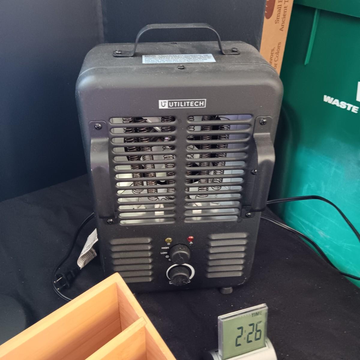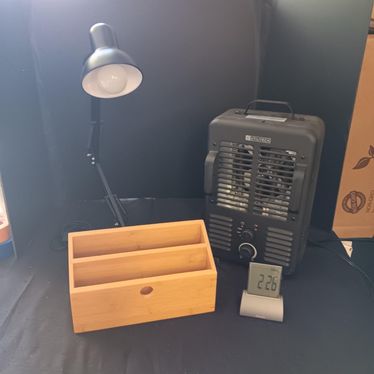 ELECTRIC HEATER, DESK LAMP, WOODEN ORGANIZER AND A CLOCK