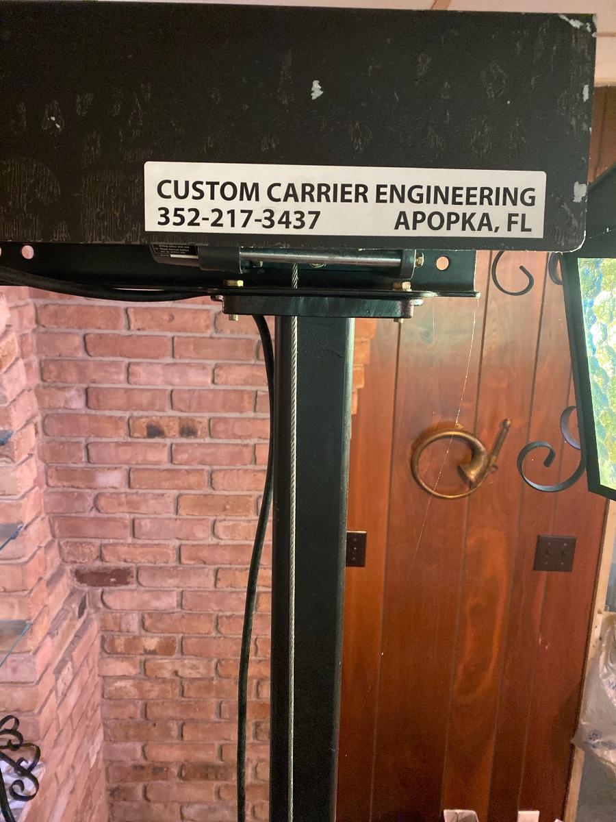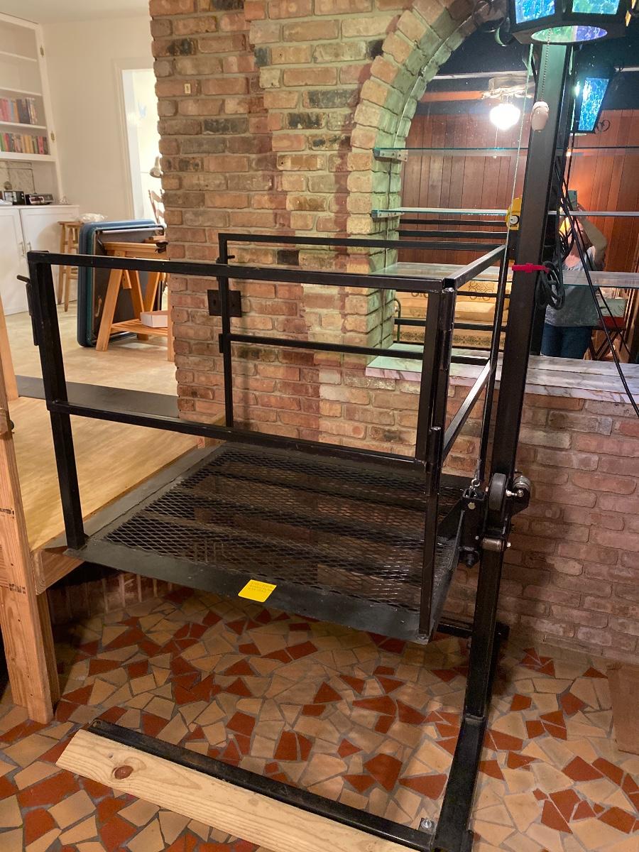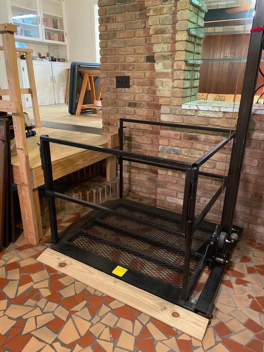 Electric indoor/outdoor wheelchair LIFT by Custom Carrier Engineering. Winch is 1500 lb. capacity. Wooden platform is also available to purchase.