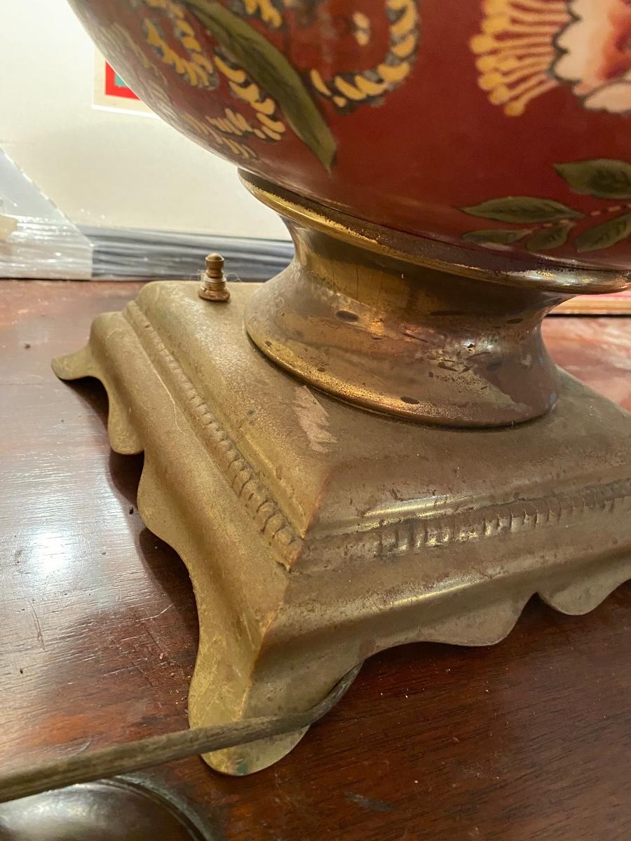 Large kerosene style electric dual socket lamp . One pull chain is stuck but there is a turn on switch on the 9"x10" square brass footed base. Comes with shade that will need to be replaced. Approx 33" high.