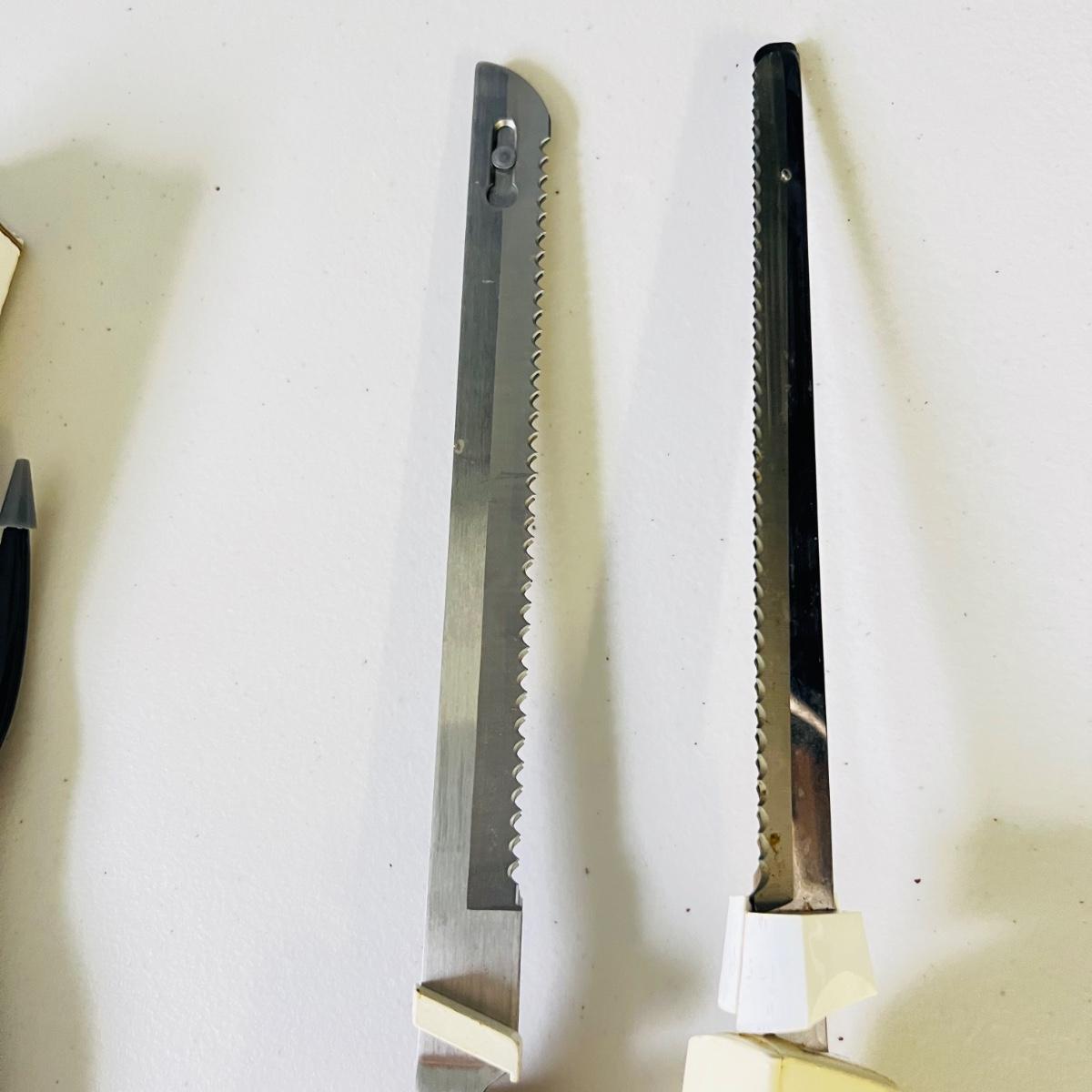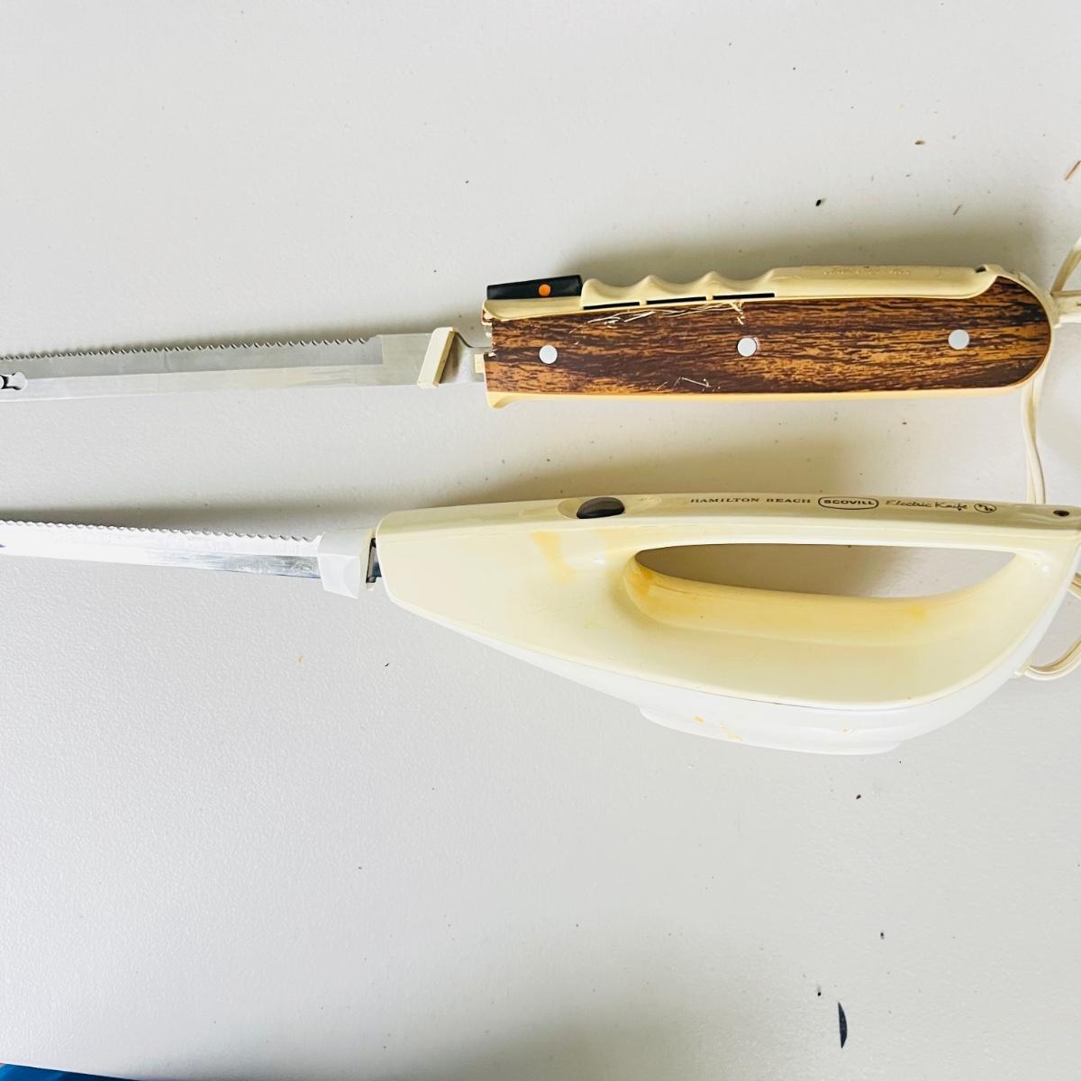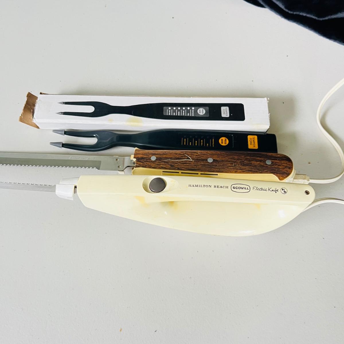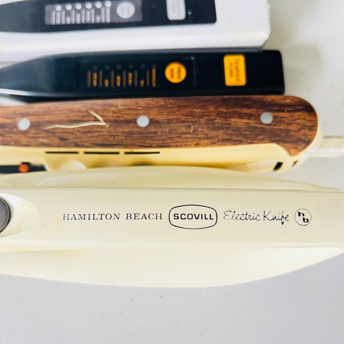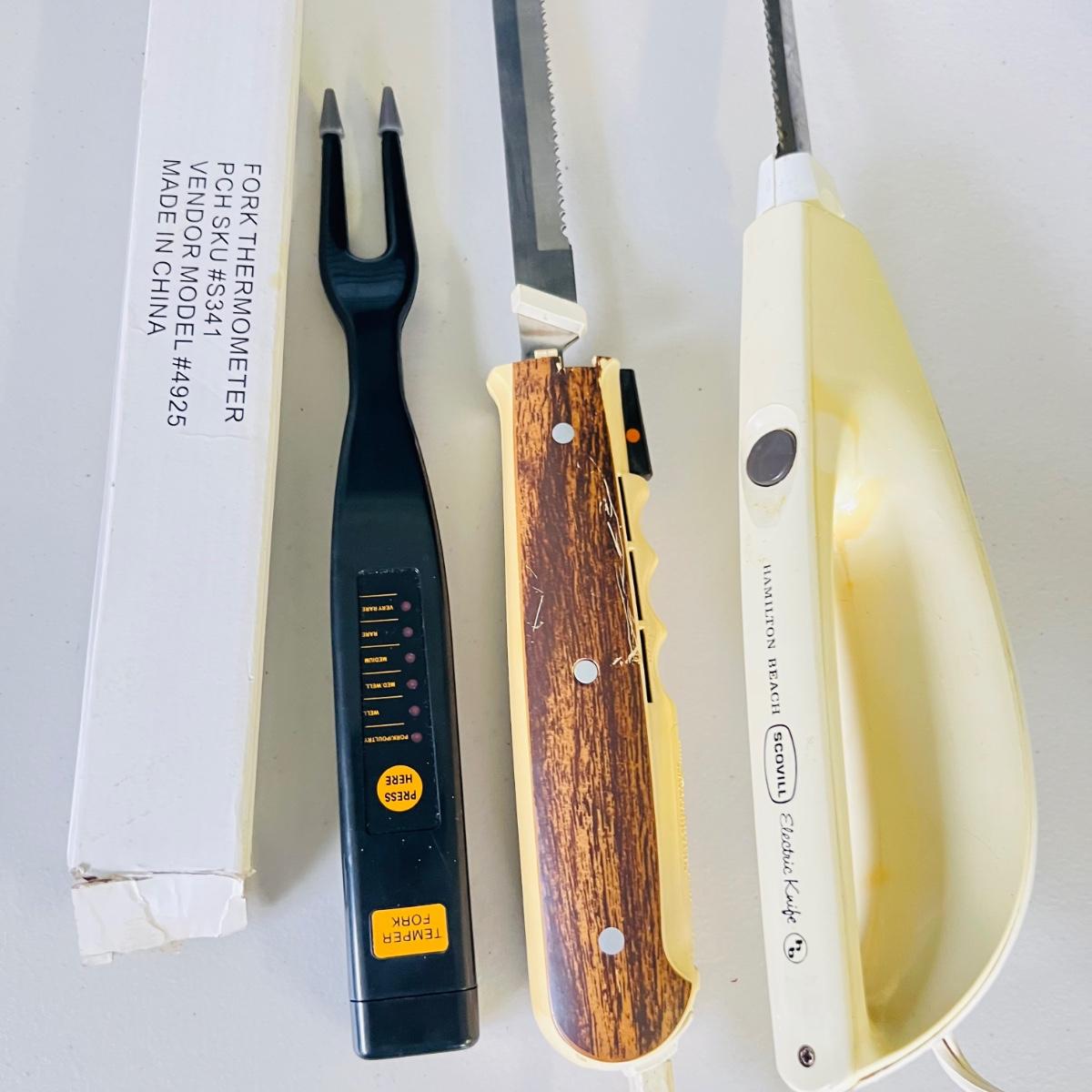 Lot includes a Hamilton Beach and a Black and Decker electric knife and a battery operated fork thermometer. All power on.
