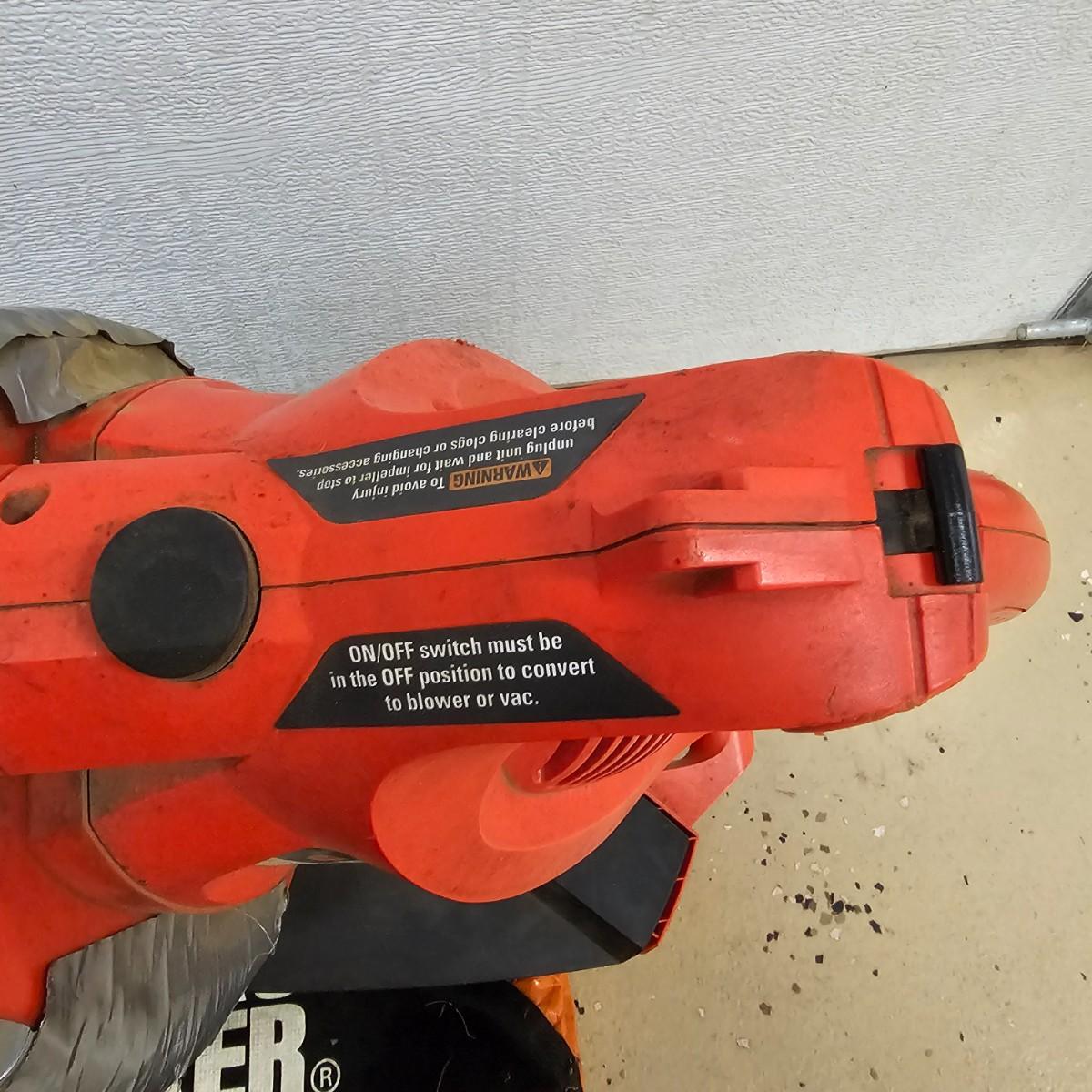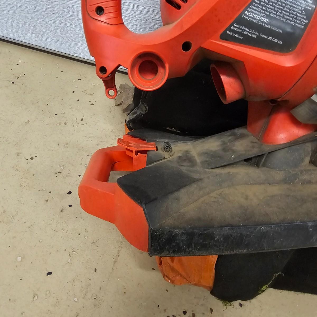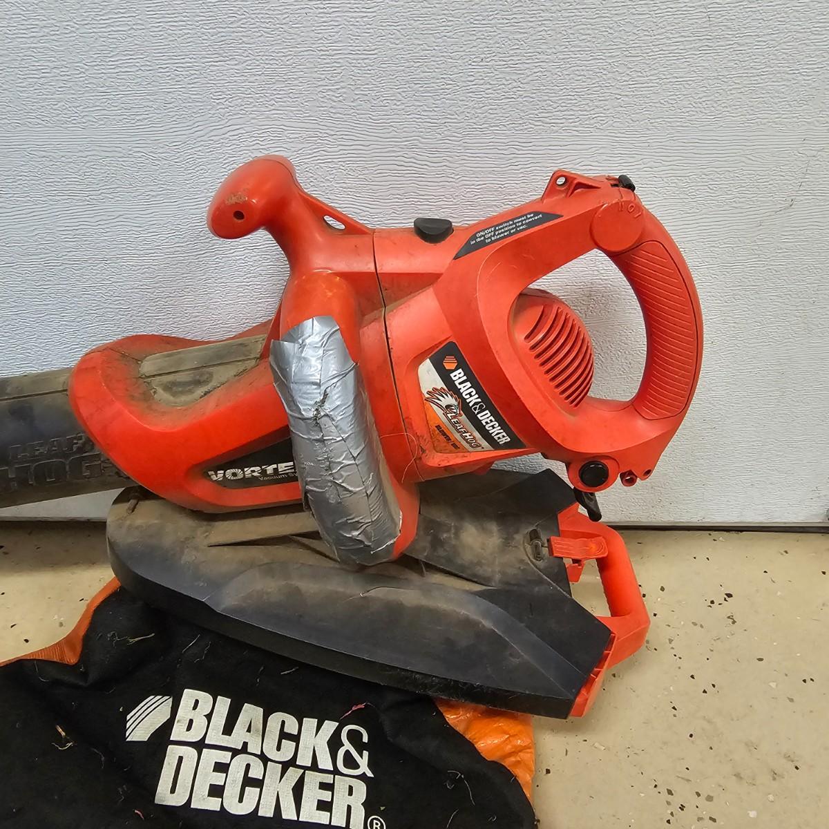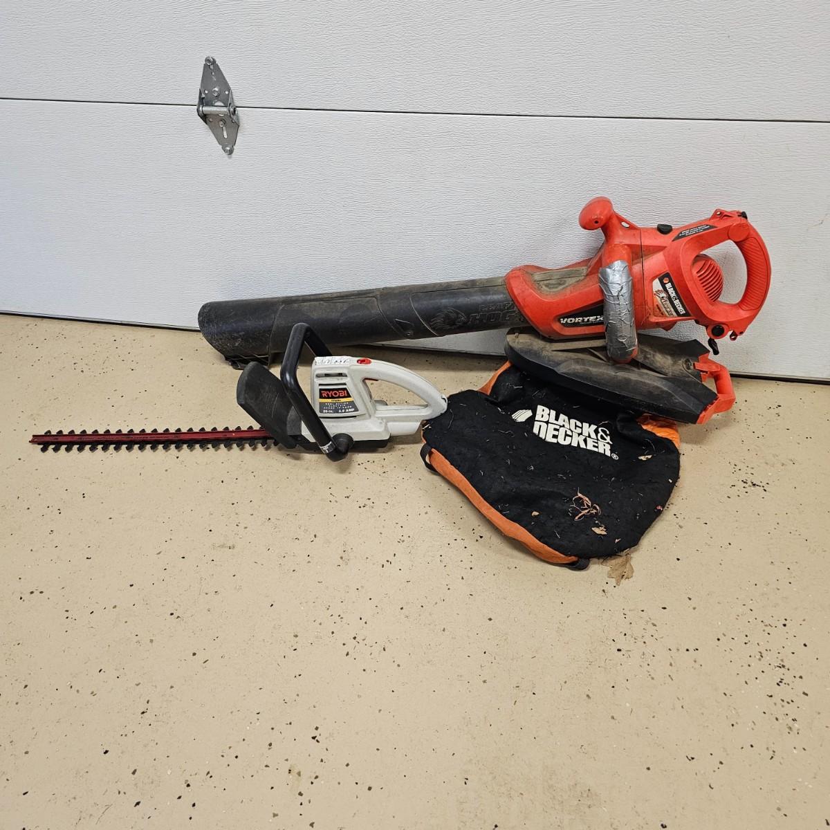 Black & Decker Leaf Hog blower/vacuum unit with collection bag and pick up tube. Some tape repair on handle. Also one Ryobi 20" hedge trimmer with blade guard. Blower measures 11" x 46" x 18"H, trimmer is 8" x 33" x 10"H. Both items powered on when plugged in. See photos for details. Local pickup only.