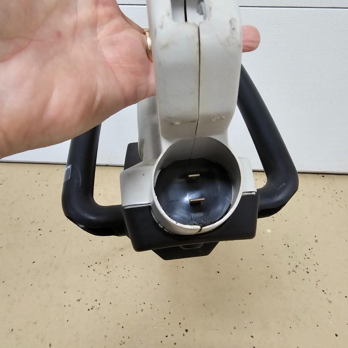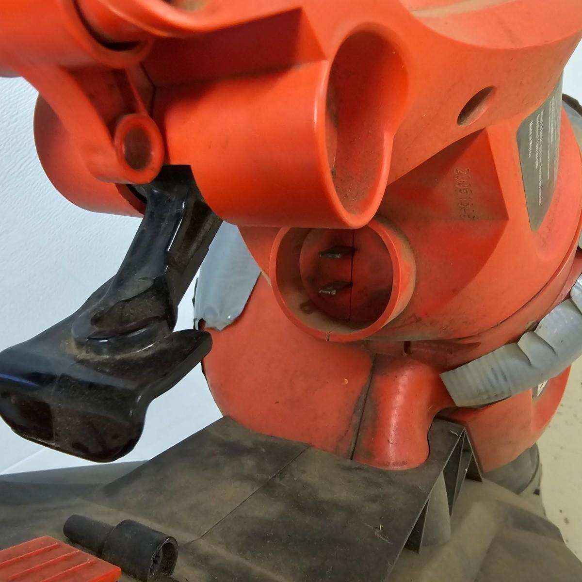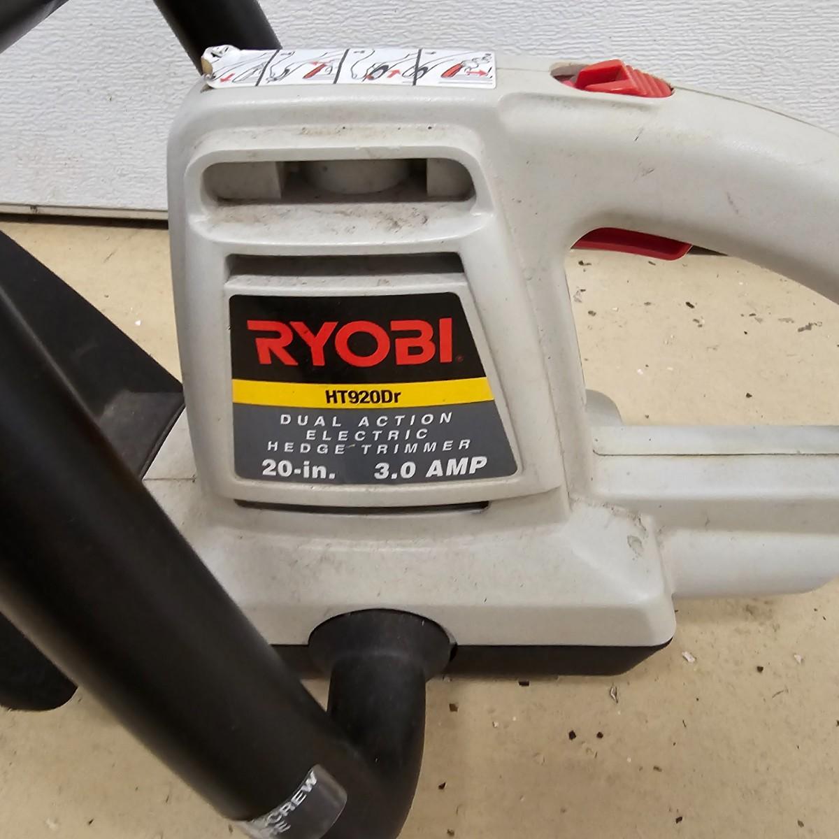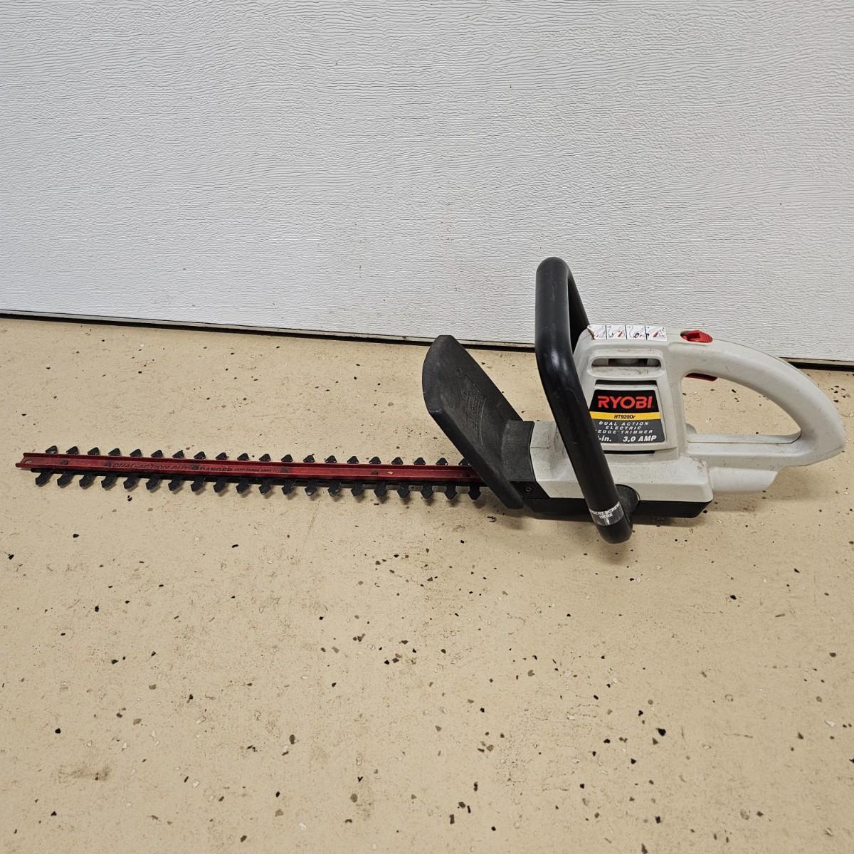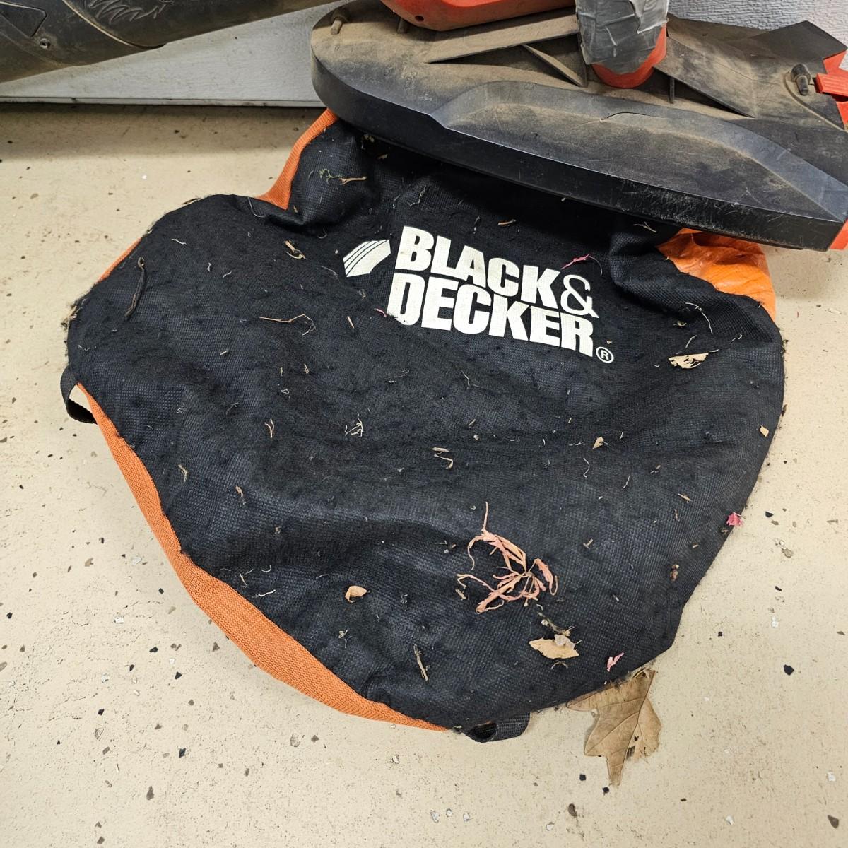 Black & Decker Leaf Hog blower/vacuum unit with collection bag and pick up tube. Some tape repair on handle. Also one Ryobi 20" hedge trimmer with blade guard. Blower measures 11" x 46" x 18"H, trimmer is 8" x 33" x 10"H. Both items powered on when plugged in. See photos for details. Local pickup only.